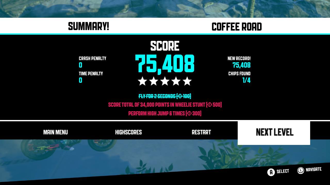 Dla pojedynczego gracza przygotowano aż 26 plansz na których możemy rozegrać 54 konkurencje – każdą trasę pokonujemy w trybie czasówki oraz freestyle. Oprócz samego ukończenia trasy warto mieć na uwadze dodatkowe zadania, które pojawiają się w trakcie każdych zawodów. Takich zadań może być od 2 do 3. Za ich wypełnienie, np ukończenie trasy bez upadku, czy wykonanie konkretnej ilości skoków lub uzyskanie wymaganej ilość punktów w konkretnym triku dostajemy pieniądze. Dodatkowo na każdej mapce są poukrywane monety, które także zasilą nasze konto. Zarobione pieniądze możemy wydać na części do motocykla – silnik, opony i hamulce oraz na elementy kosmetyczne dla naszego pojazdu lub kierowcy.