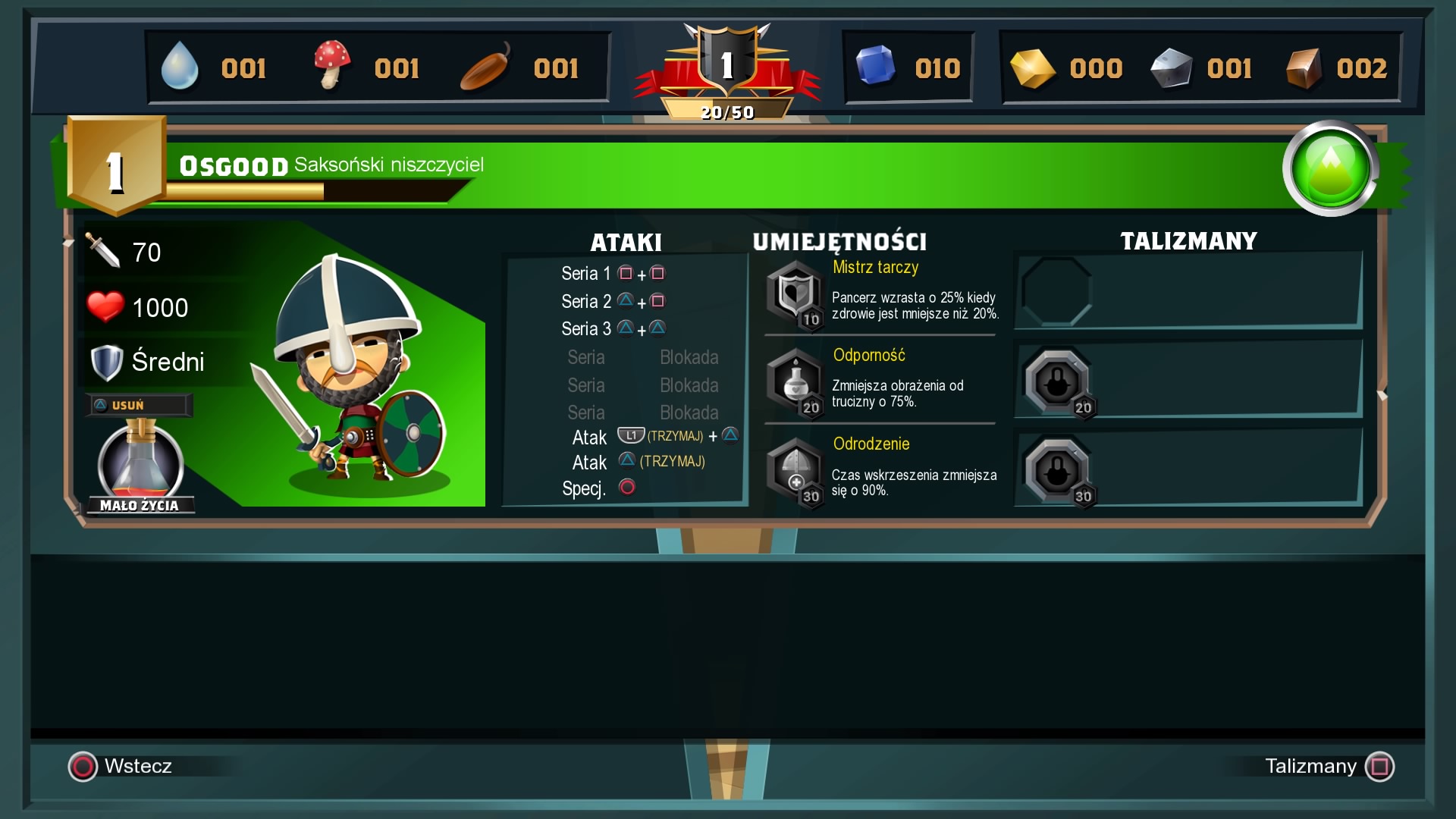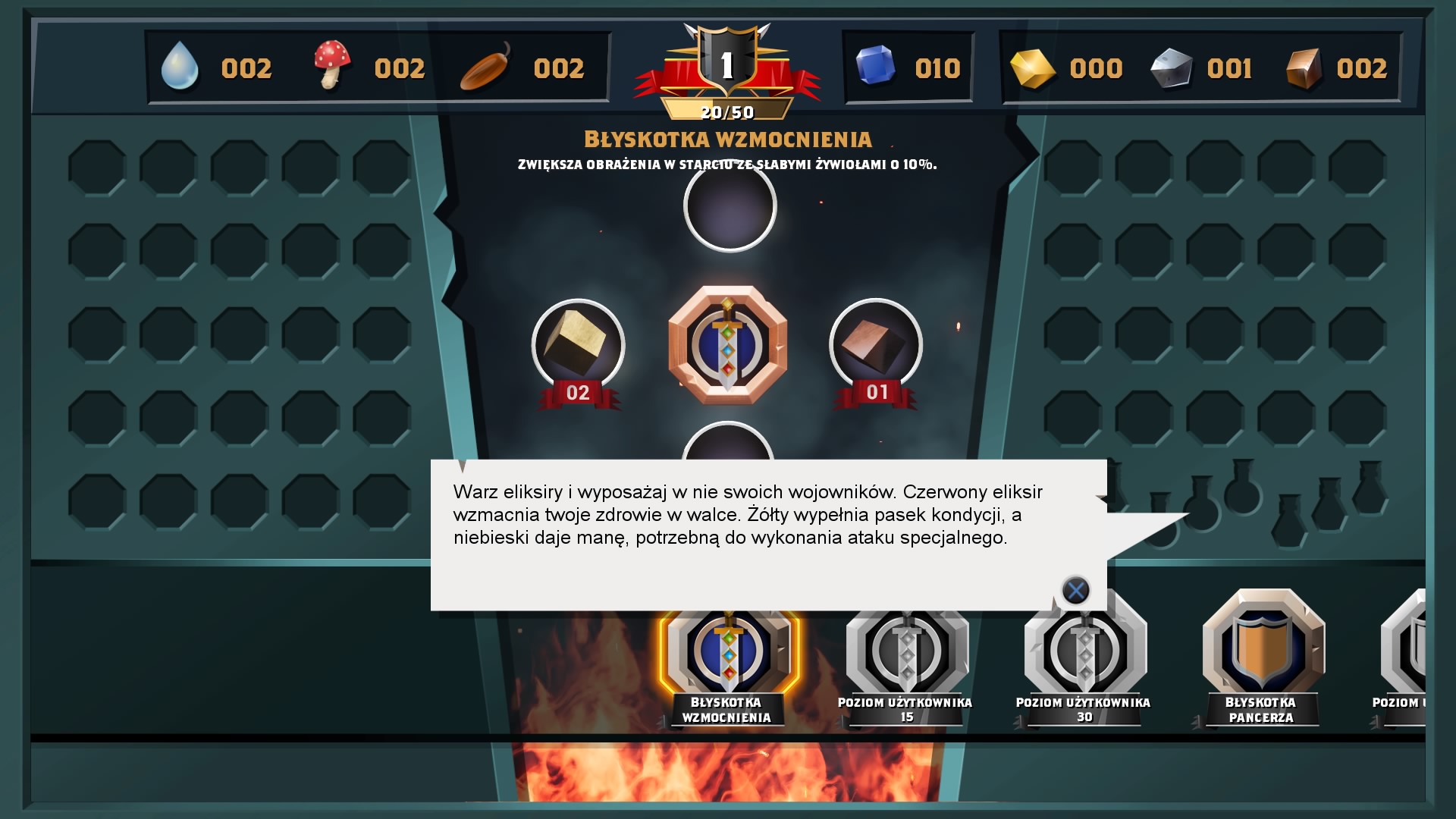 W World of Warriors możemy pomagać swoim wojownikom, poprzez tworzenie talizmanów i mikstur. By to zrobić musimy bacznie obserwować arenę podczas walki, ponieważ to właśnie na niej lądują skrzynki pełne potrzebnych nam materiałów. W zaskakująco krótkim czasie udało mi się zebrać sporo skarbów, więc udałam się do kuźni. Tam mogłam stworzyć różne talizmany i mikstury. Tych pierwszych na początku naszej przygody mamy aż 15. Możemy stworzyć na przykład “Błyskotkę wzmocnienia”, która zwiększa obrażenia w starciu ze słabymi żywiołami o 10 %, “Błyskotkę zasobów”, która daje 5 % dodatkowych materiałów dla naszej drużyny na ekranie wyników czy “Błyskotkę zdrowia”, która zwiększa wartość maksymalnego zdrowia o 5%. Później, po osiągnięciu 15 poziomu użytkownika możemy ulepszyć nasze talizmany w taki sposób, że staną się “wisiorkami”, a później, po osiągnięciu poziomu 30 – “amuletami”. Podobnie ma się sprawa z eliksirami, tylko tych jest znacznie mniej. Na starcie możemy uwarzyć takie mikstury jak “Mało życia”, “Mało many” i “Mało kondycji”. Później, po osiągnięciu poziomu dwunastego możemy zaopatrzyć się w “połówki”, a następnie w “Pełne życie”, “Pełną manę” i “Pełną kondycję”. Muszę przyznać, że twórcy mieli bardzo dobry pomysł, tyle tylko, że to wszystko nie jest nam potrzebne. Możemy pokonywać przeciwników za pomocą kwadratu i mikstury, umiejętności specjalne, a nawet talizmany na nic się tu zdadzą, niestety.