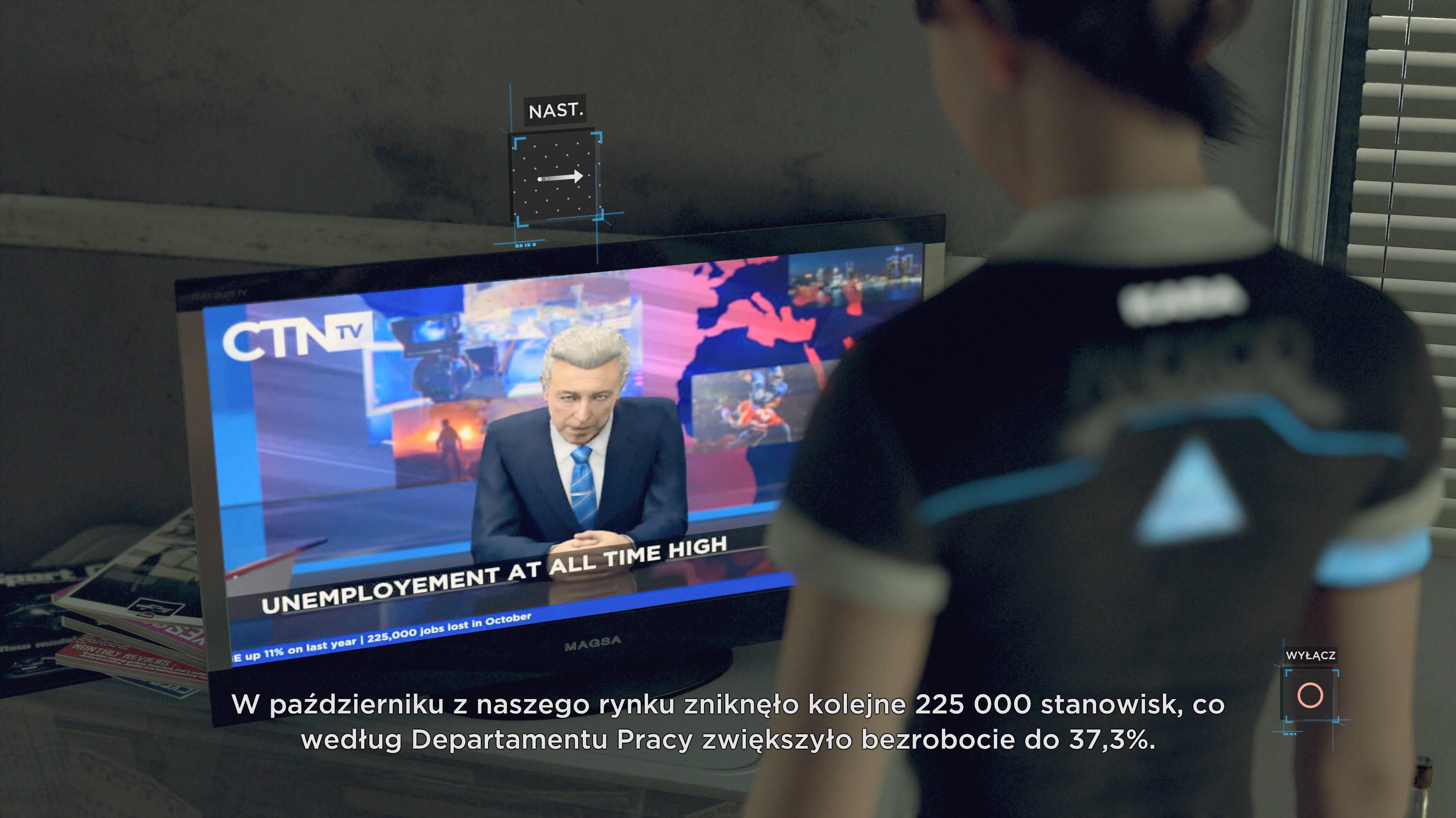 Podoba mi się cały świat wykreowany przez zespół Davida Cage’a. Nie tylko przedstawia dość pozytywną jednak wersję przyszłości, tak jest też niezwykle realistyczny. Rolę znajdziek w grze pełnią tablety z najnowszymi gazetami i newsami ze świata. Bardzo podoba mi się realizm tych informacji, bo dotyczą one problemów, z którymi sami naprawdę będziemy musieli się zmierzyć za jakiś czas. Część artykułów, które znajdziemy opisywać będzie nasze własne poczynania, ale poczytamy o wojnie między USA i Rosją na Antarktydzie, wyginięciu pszczół czy misjach na dalekie planety układu słonecznego. Dzięki takiemu przywiązaniu do detali czuję się jakbym obserwował świat, który faktycznie może tak wyglądać za dwie dekady!