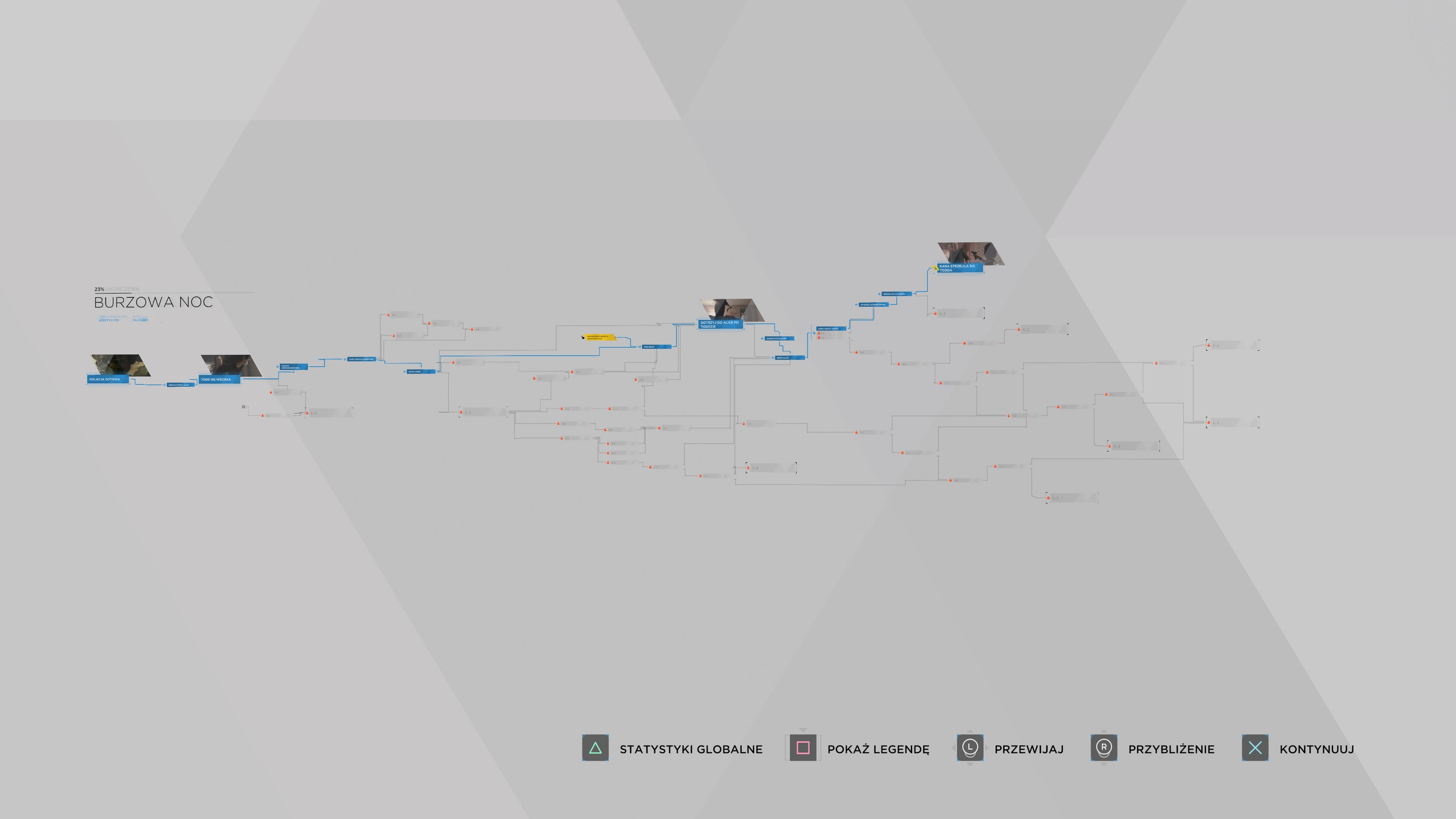 Początkowo byłem dość sceptycznie nastawiony do tych schematów, ale później zdałem sobie sprawę, że de facto występują one w każdej grze Quantic Dream i gracze sami przygotowywali sobie takie mapy z myślą o odkryciu wszystkich zakończeń czy zdobyciu wszystkich trofeów. Teraz mamy to podane, ale w formie nie inwazyjnej. Nie zepsujemy sobie zabawy, bo nie wiemy czego dotyczy gałąź historii, której nie odkryliśmy. Po zakończeniu każdego rozdziału gra pokazuje nam schemat naszej przygody, który dodatkowo możemy wzbogacić o statystyki naszych znajomych czy globalne. Dzięki temu możemy sprawdzić czy inni podjeli podobne decyzje co my.