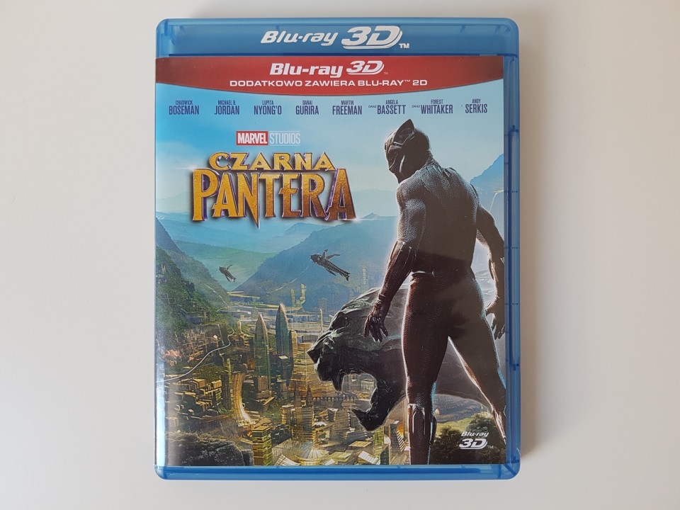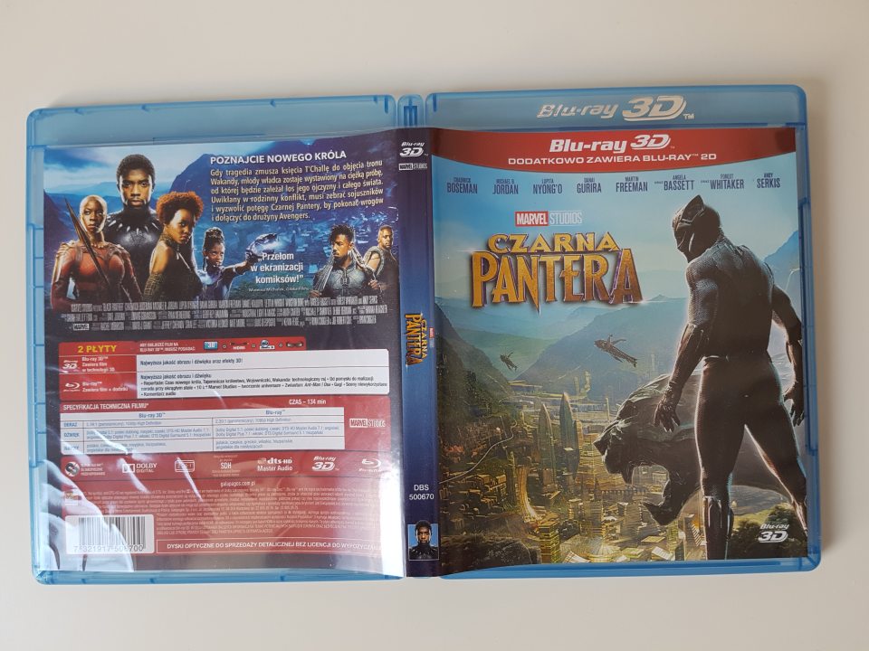 Wiele osób po wrzuceniu zdjęcia okładki wydania BD 3D zwróciło uwagę na fakt, iż front nie prezentuje się najlepiej, jeżeli chodzi o względy estetyczne. Duży czerwony pasek z napisem Blu-ray 3D, który de facto jest widoczny ponownie kilka centymetrów wyżej na pudełku – nie sprawia najlepszego wrażenia. Do tego dochodzi sklejka postaci głównego bohatera z tłem ukazującym Wakandę. Tył prezentuje się już nieznacznie lepiej, ponieważ znajdziemy na nim 6 najważniejszych postaci produkcji oraz krótki opis dystrybutora i oczywiście specyfikację wydania. Bok na szczęście nie jest przekombinowany i składa się z tytułu filmu oraz prostokącika z Czarną Panterą. Na płycie 3D znajduje się obraz 2:39:1 oraz dźwięk Dolby Digital 5.1. w wersji z polskim dubbigniem, a DTS-HD Master Audio 7.1 w oryginalnej ścieżce językowej. Identyczna specyfikacja dotyczy zwykłego wydania Blu-ray.