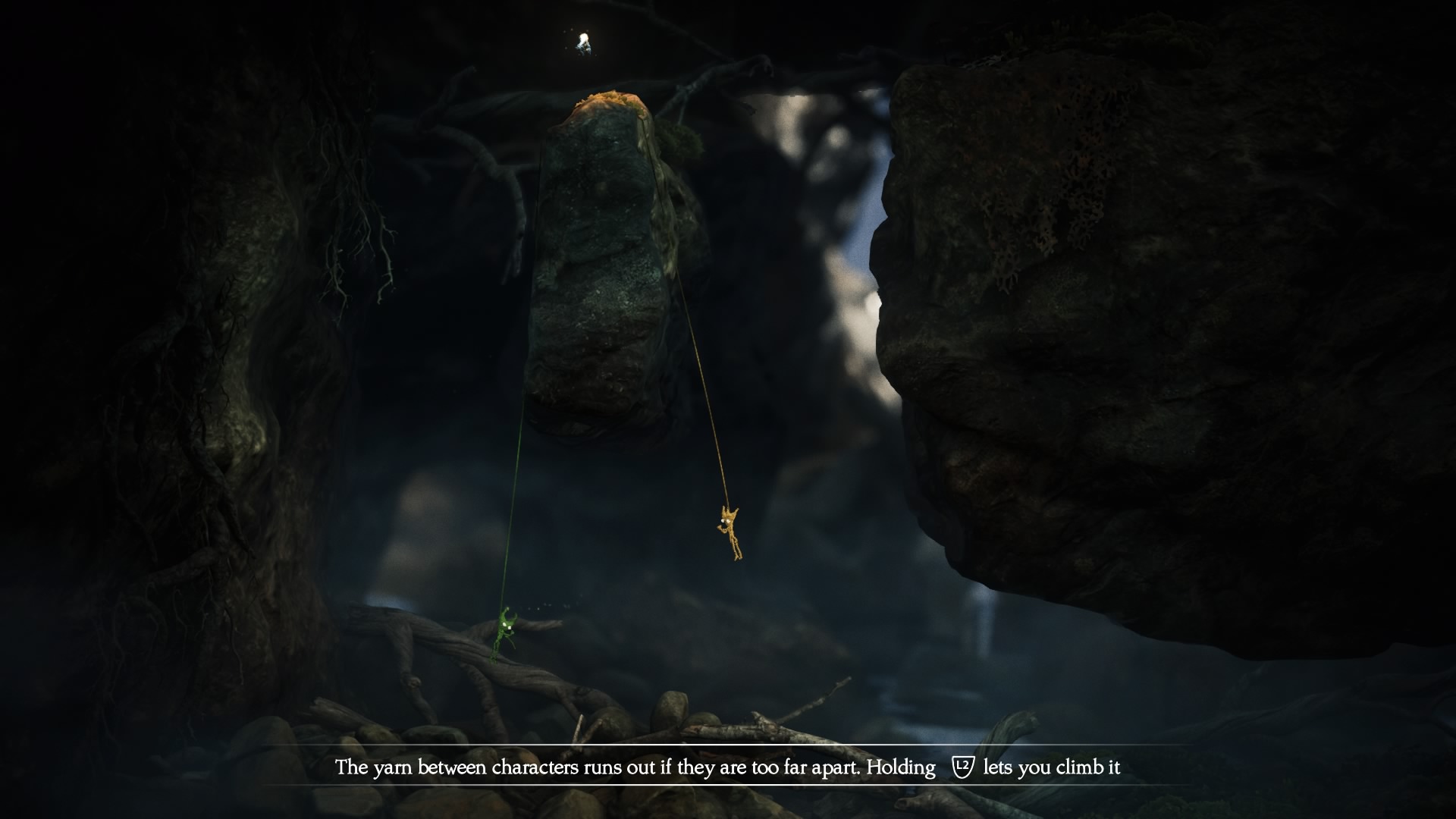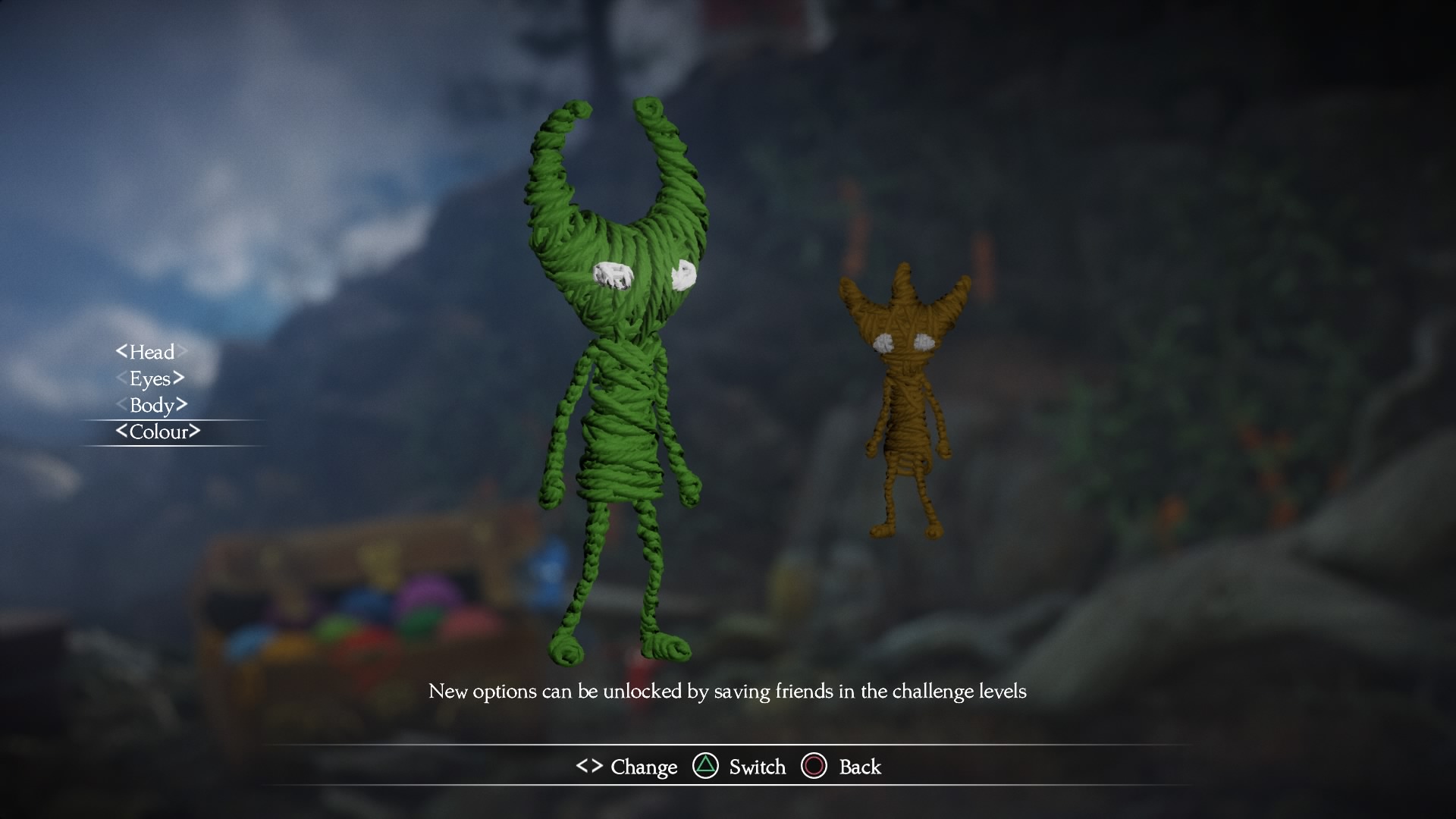 Wspomniałem, że kooperacja jest lokalna, więc możemy do gry zaprosić dowolną osobę, która będzie sterować drugą postacią za pomocą dodatkowego kontrolera. Wielka szkoda, że nie pokuszono się także o kooperacje online. W przepadku braku przyjaciół w pobliżu możemy sterować oboma włóczkami jednym kontrolerem. Postaci przełączamy wciskając trójkąt, a przytrzymując ten przycisk nasi bohaterowie łącza się w jedną postać. Dzięki wprowadzeniu drugiej postaci urozmaicono łamigłówki oraz ciekawiej rozwinięto obszary, które możemy pokonać za pomocą huśtania się na nitce. Cały czas na naszej drodze pojawią się przeszkody, które będziemy musieli pokonać z pomocą rozbujania jednego włóczka, tak aby doleciał na wymaganą pozycję, a drugi zostanie wtedy już po prostu wciągnięty. Plansze zostały urozmaicone o ruchome elementy, np jeden włóczek musi coś popchać, aby drugu mógł dostać się wyżej. Dodano wrzutnie, które wzbiją nas w powietrze- możemy wspomniane wyrzutnie także delikatnie obracać. Miły dodatkiem jest odbijanie się od wąskich ścian, aby dostać się na wyższe poziomy.