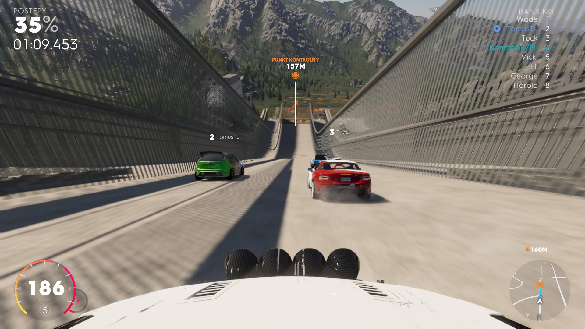 Pamiętacie Driveclub i irytujący, wręcz niesprawiedliwy poziom trudności z tamtej gry? Tutaj sytuacja wygląda podobnie. Gdy gracz prowadzi, to często ktoś siedzi mu na ogonie, ba! nawet wyprzedzą przed samą metą, co niestety spotkało mnie kilka razy. Gdy graczowi źle idzie i jedzie po prostu słabo, to boty czekają na niego, dają się wyprzedzić a następnie znowu trzymają się na ogonie. W The Crew 2 boty są bardzo słabe na prostej, łatwo im odjechać na kilka sekund lub po prostu nadrobić stratę, ale dramat gracz zaczyna się, gdy wjeżdżamy w sekwencje zakrętów. Grając na padzie praktycznie każdy zakręt pokonujemy driftem, słychać pisk i leci dym z opon. Boty natomiast zakręty pokonują płynnie, jak przespawane na całkiem dużej prędkości. Kolejny problem z zakrętami jest taki, że system kolizji jest tez tutaj bardzo słaby, auta nie ulegają uszkodzeniom, ale za to odbijają się od sobie jak piłeczka ping-pongowa. Jeszcze gorzej jest gdy najedziemy na poboczu na jakiś kamień czy inną przeszkodę, to auto momentalnie wystrzeliwuje w powietrze. To mi się nie podoba, auta powinny być w grach zręcznościowych zdecydowanie cięższe.