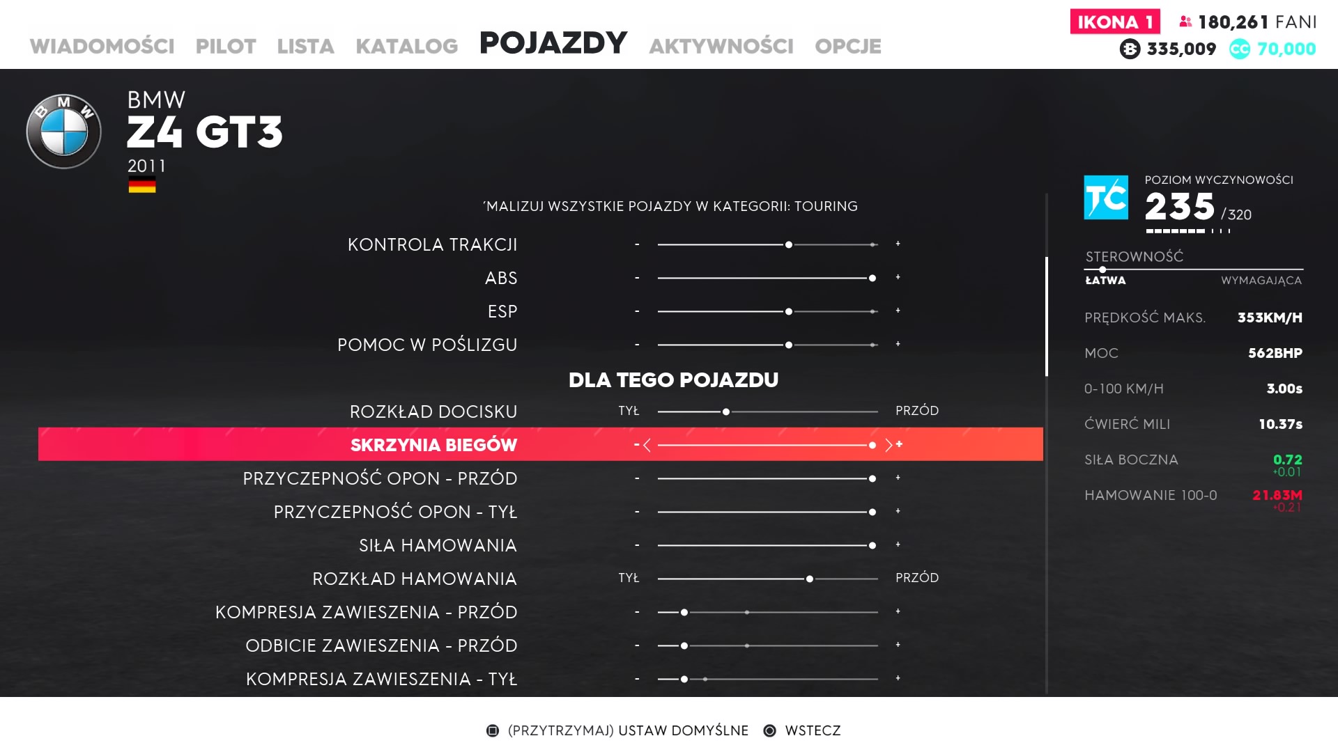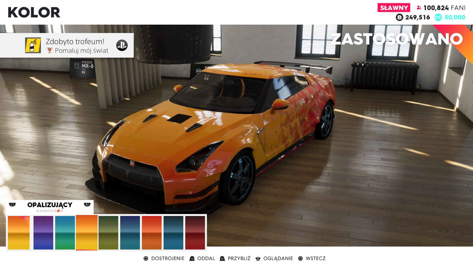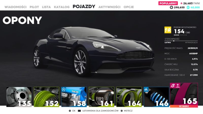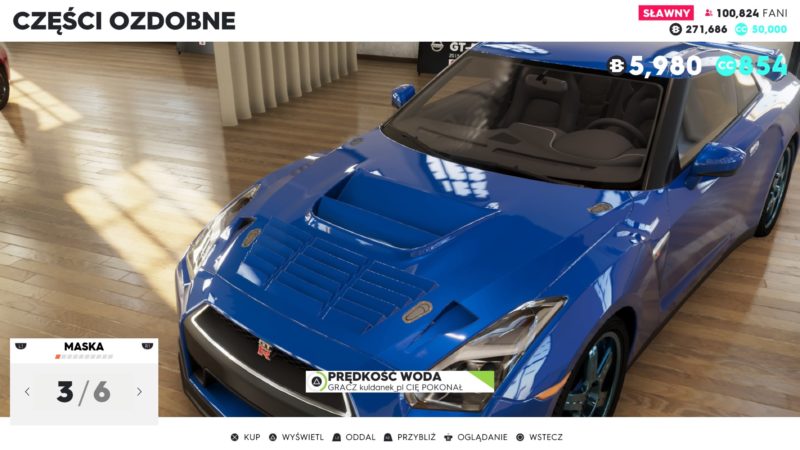 Każdy pojazd w The Crew 2 podlega tuningowi mechanicznemu. Lepsze części zdobywamy losowo po ukończeniu każdego wyścigu lub popisach freestylowych. Części podzielone są wedle jakości na zwykle, epickie, rzadkie, legendarne, etc. Farmienie części polega na tym samym co podnoszenie mocy w Destiny 2. Każdy pojazd ma określoną maksymalną liczbę punktów mocy. Przykładowo kupiłem Nissana GTR, który maksymalny poziom części ma ustawiony na 280. W sklepie zamontowane ma standardowe części na poziomie 180, wygrywając kolejne wyścigi uliczne zdobywamy nowe lesze części, które podnoszą mi całkowity poziom samochodu. Dodatkowo do wielu pojazdów jest dostępny tuning wizualny, za zdobyte kredyty możemy kupić nowe maski, zderzaki, felgi spoilery, etc. Każdy pojazd możemy także pomalować i ozdobić naklejkami. Nie brakuje rynku pracy na którym możemy kupić fantastyczne projekty zdolnych graczy.