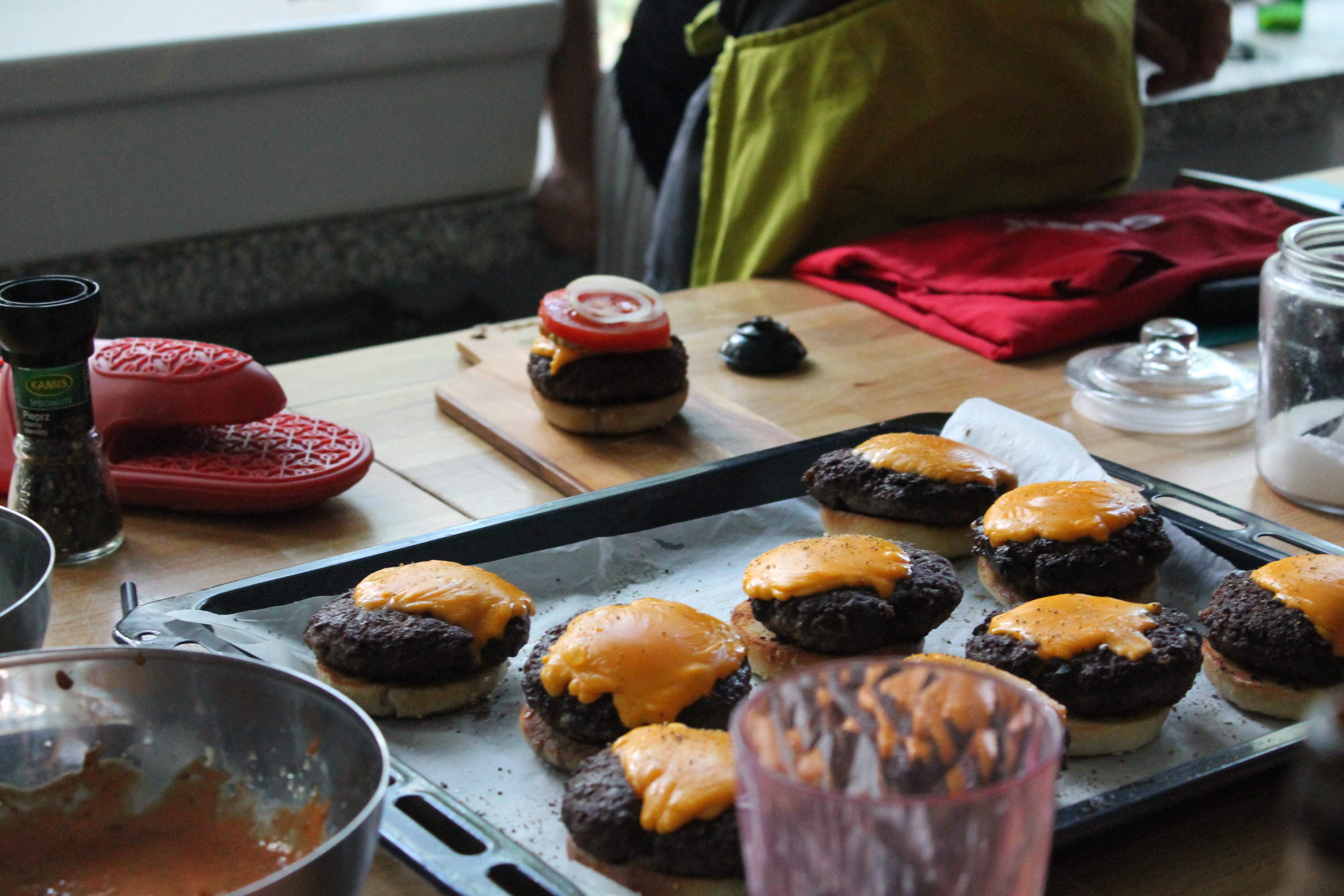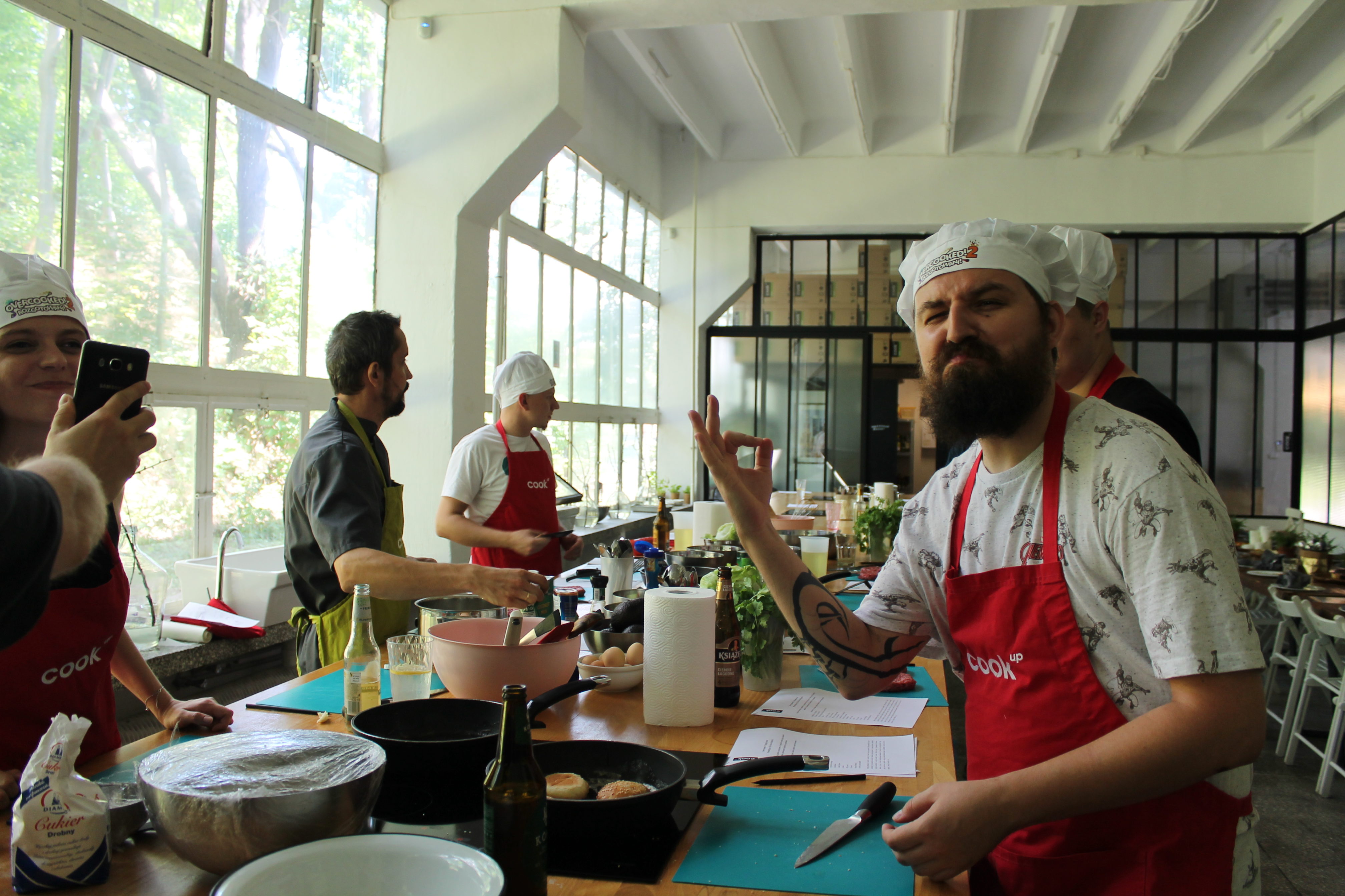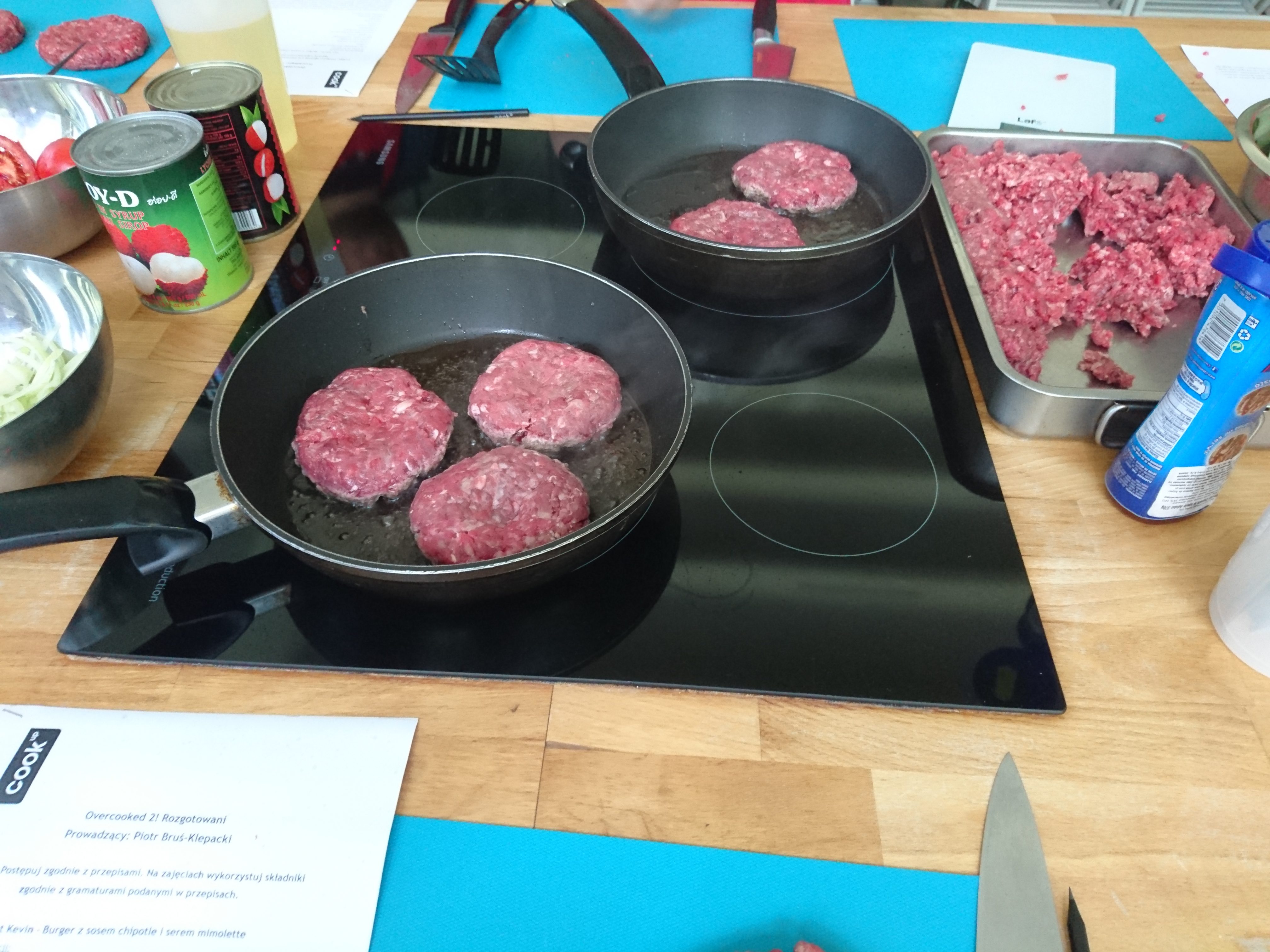I teraz przechodzimy do części stricte kulinarnej. Otóż, pierwsza grupa skończyła swoje wojaże przy gotowaniu, więc przyszła pora abyśmy to my założyli stylowe czapki z logiem gry oraz gustowne czerwone fartuchy. Na początek otrzymaliśmy krótkie wprowadzenie, co mamy oddane do naszej dyspozycji podczas gotowania i kilka słów wprowadzenia. I po tym się zaczęło. Na początek mieliśmy odmierzyć odpowiednią ilość mięsa, które miało być sercem naszych burgerów. Oczywiście każdy zabrał się ochoczo do pracy i widać było, że wszyscy mieli ogromny ubaw podczas tych warsztatów. Tutaj jakieś komentarze na temat tego, co nawzajem robimy, żarty i ogólnie świetna atmosfera, której nie mogła pokonać nawet pogoda (wysoka temperatura plus gotowanie nie zawsze idą w parze). Bez większych problemów udało nam się stworzyć nasze małe dzieła sztuki i każdy mógł cieszyć się własnoręcznie zrobionym burgerem, który sam w sobie był przepyszny. Po radosnej konsumpcji przyszedł czas na podsumowanie naszych warsztatów. Tym podsumowaniem miało być rozdanie dwóch voucherów na warsztaty kulinarne w Akademii COOK UP. Jeden z nich miał być przekazany osobie, która według naszego prowadzącego wykazywała się największym zainteresowaniem w związku z warsztatami. Druga natomiast miała zostać wyłoniona na podstawie losowania. Po przyznaniu nagród (tutaj gratulacje dla Radka i Krzycha) przygoda z eventem Overcooked 2 mogła zostać uznana za zakończoną z ogromnym sukcesem.