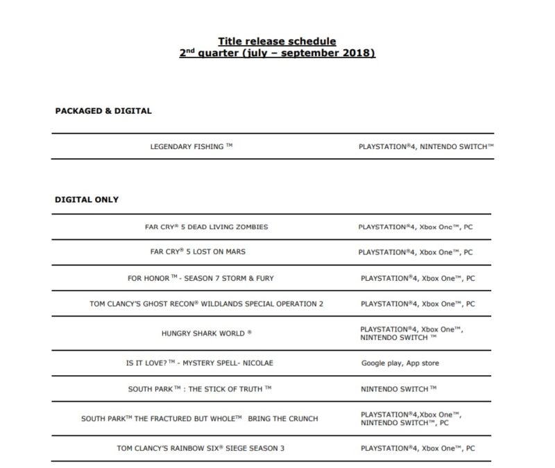 Ostatnia strona udostępnionego przez Ubisoft dokumentu zdradza listę nadchodzących produkcji na wszystkie platformy podczas drugiego kwartału roku fiskalnego 2018-2019. Jak można zobaczyć poniżej, na liście znajduje się gra South Park: Kijek Prawdy dla konsoli Nintendo Switch. Dokładna data premiery nie została tutaj podana. Tytuł powinien zadebiutować między lipcem a wrześniem 2018. Będzie on dostępny wyłącznie w wersji cyfrowej.