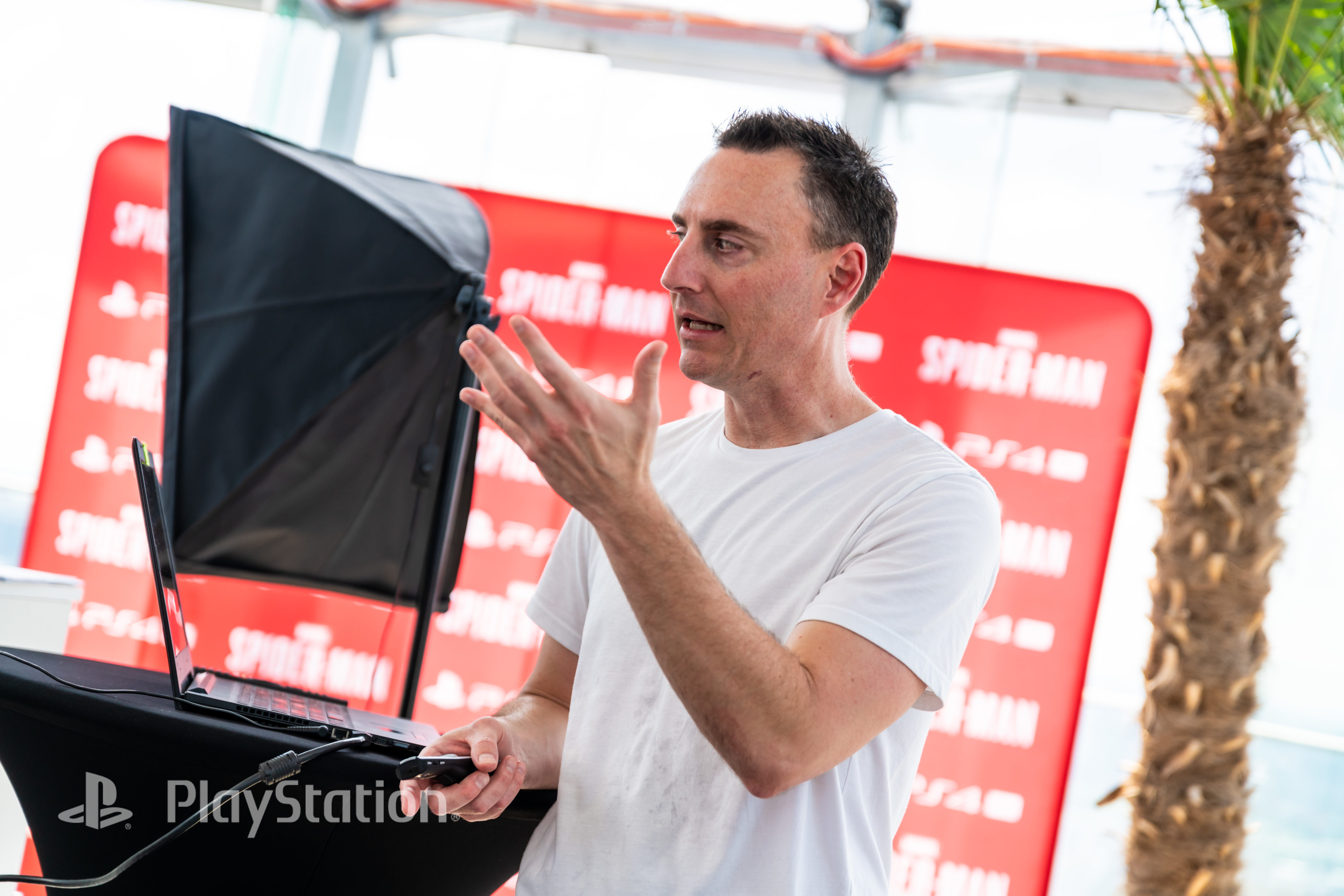 Pierwsza, widoki jakie nam towarzyszyły dodawały całemu pokazowi odpowiedniego kopa. Okazało się, że będziemy ogrywać nowe przygody Spider-Mana na 32 piętrze, więc każdy z nas mógł się poczuć jak nasz ulubiony bohater z sąsiedztwa. Drugą był niestety fakt, że pogoda postanowiła dołożyć do pieca dodatkowe stopnie i cóż, określenie, że jest gorąco weszło na zupełnie nowy poziom. Ale nie mogło to powstrzymać nikogo, w tym mnie, od dobrej zabawy, która już na nas czekała. Trochę po 13 główny scenarzysty gry Jon Paquette poprowadził krótką prezentację, która miała nam przybliżyć jaka wizja przyświecała ludziom z Insomniac Games podczas pracy nad “Marvel’s Spider-Man”.