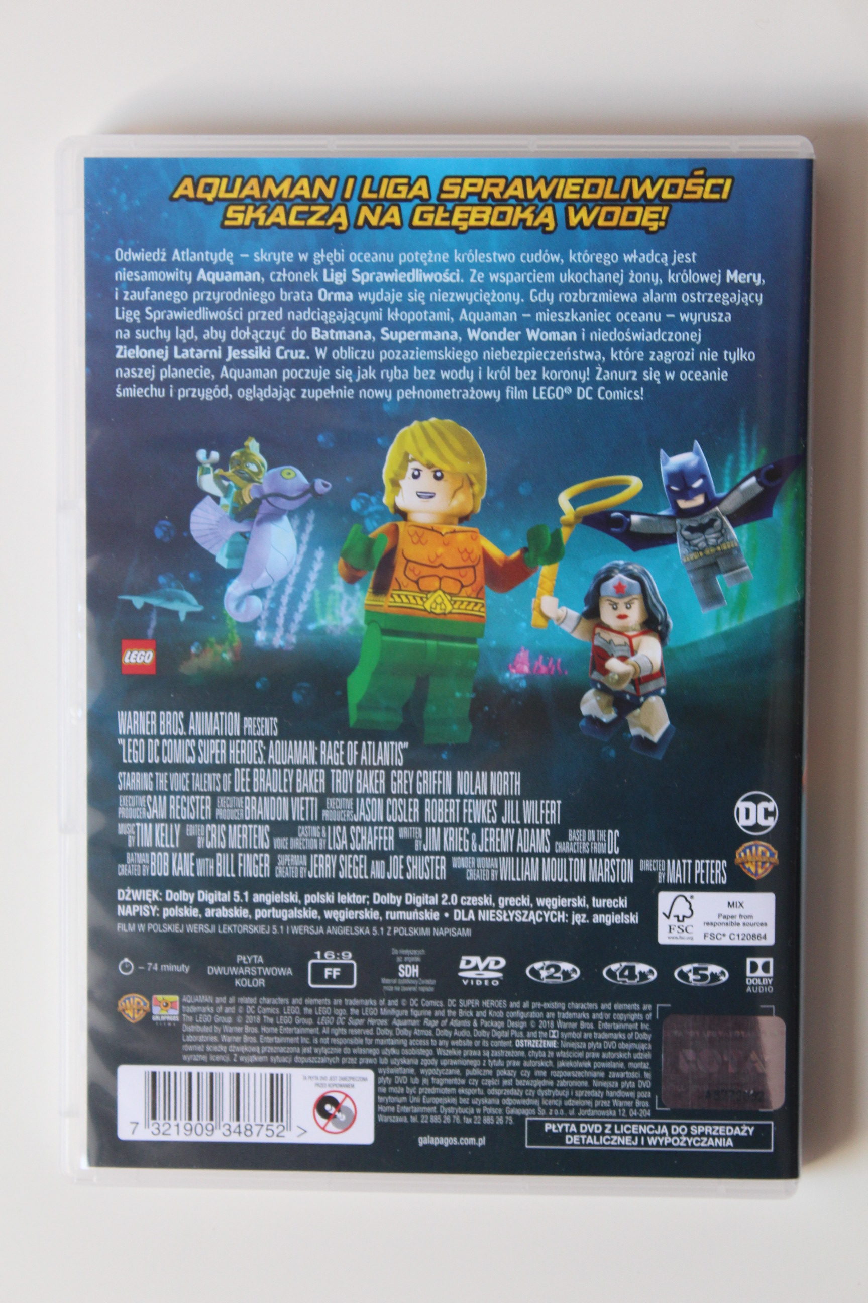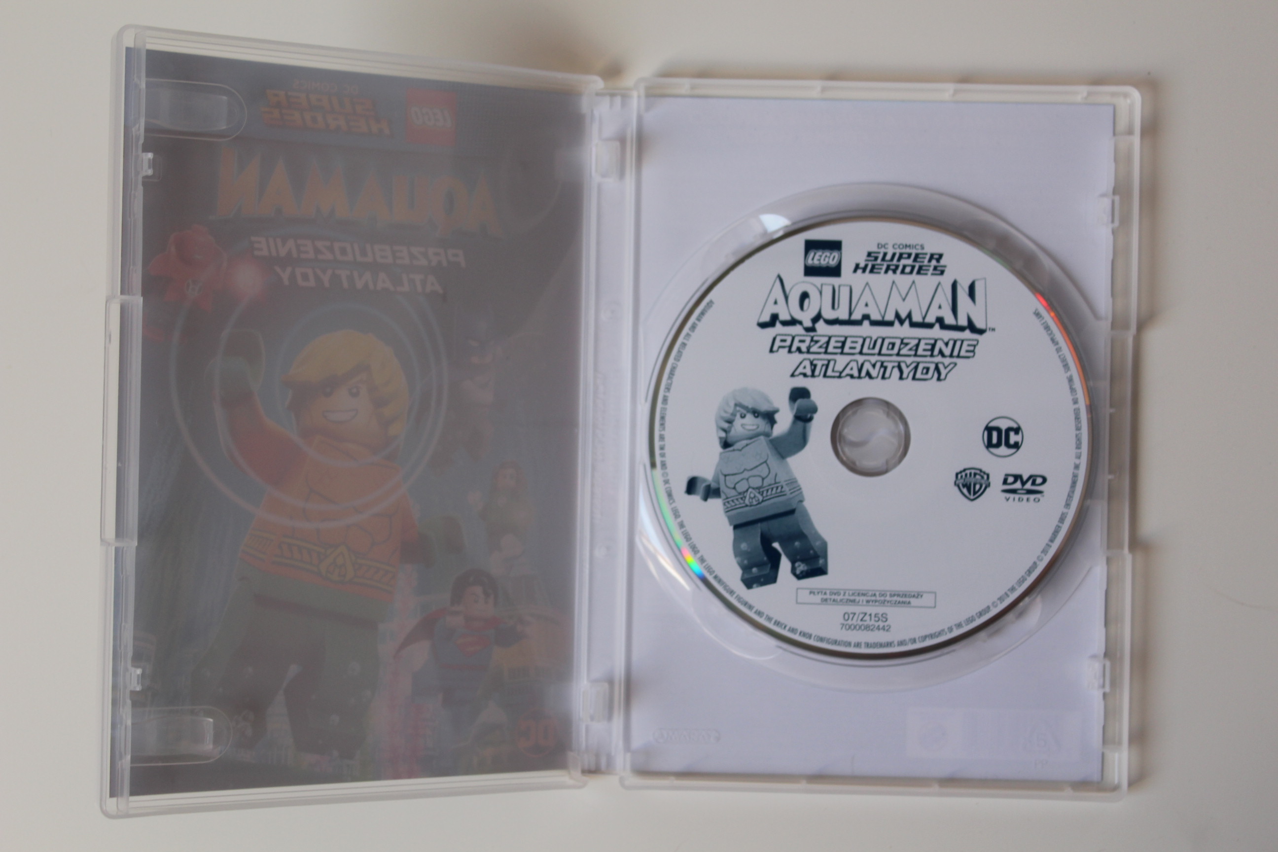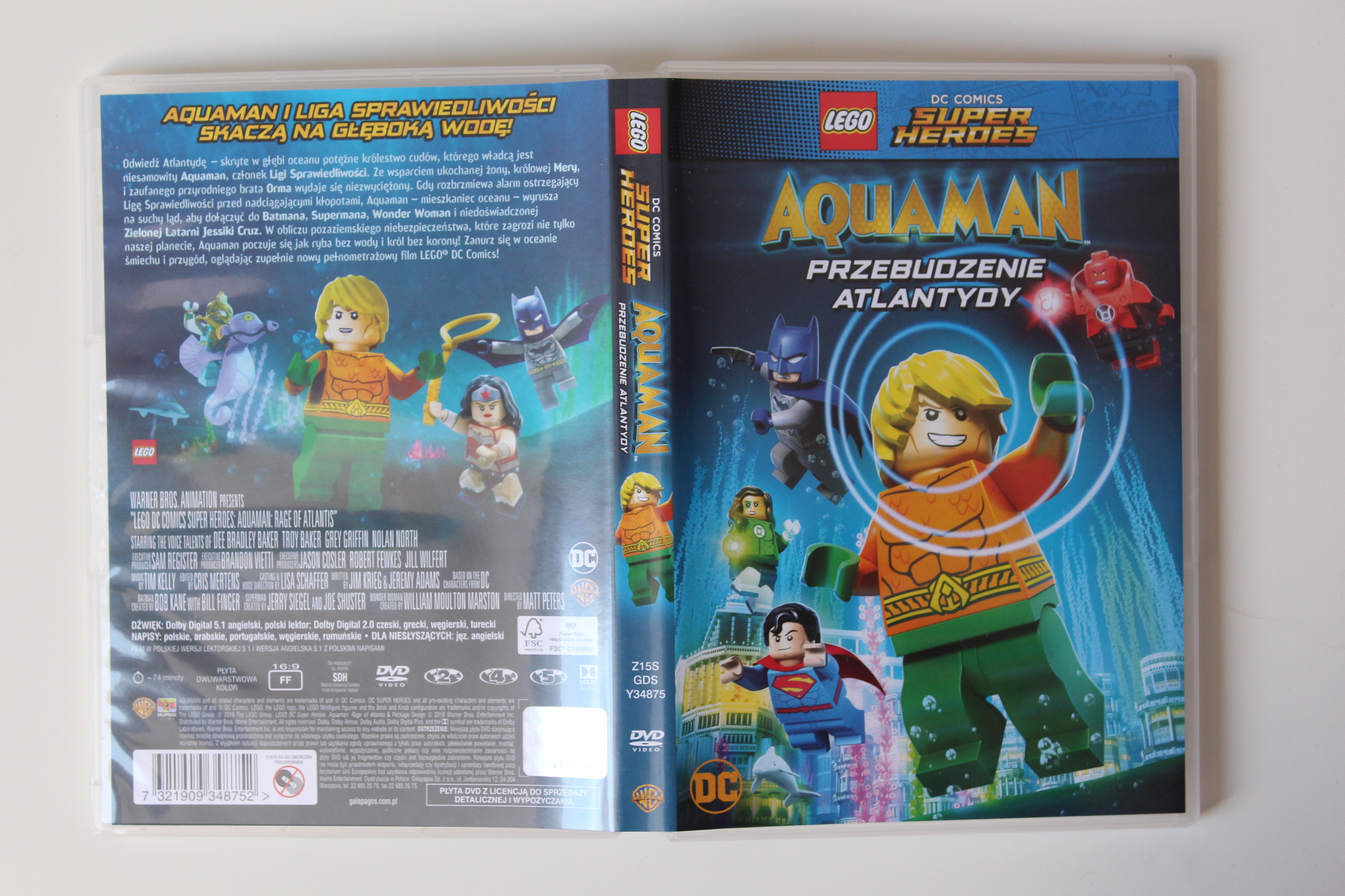Na froncie znajdziemy standardową grafikę promocyjną filmu z logiem umieszczonym w górnej części okładki. Z tyłu znajduje się krótki opis dystrybutora, specyfikacja oraz jeden kadr z naszymi bohaterami. Na boku natomiast znajdziemy sporo informacji – nazwa filmu, postać Aquamana, logo Warner Brosa i DVD oraz numer wydania.