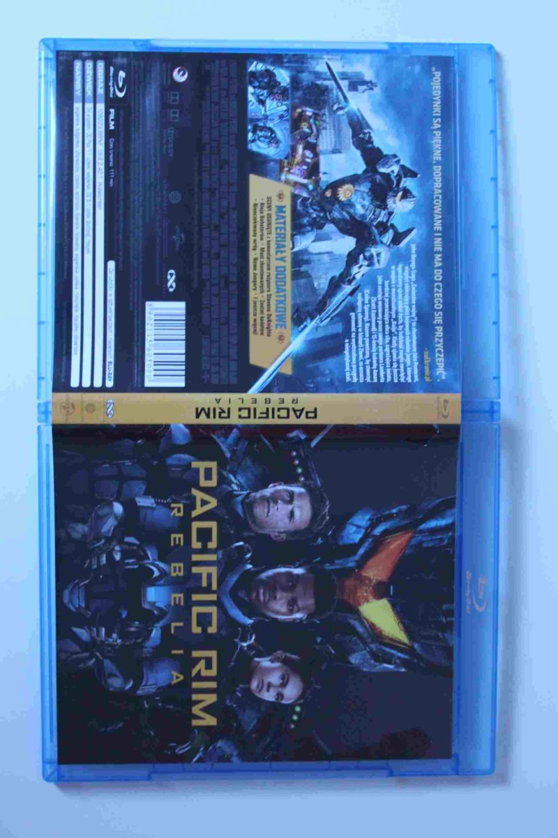 Okładka to niewątpliwie duży plus. Z przodu nie znajdziemy nic więcej niż grafikę z trzeba bohaterami, Jaegerem i tytuł. Piękno tkwi w prostocie. Żadnych cytatów, nazwisk bohaterów – po prostu schludny front. Przepiękny kontrastowy bok, na którym znajduje się praktycznie tylko nazwa filmu. A z tyłu znajdziemy kolaż z trzech zdjęć, nad którymi znajduje się cytat z jednego z czołowych polskich portalów o filmach. Poniżej standardowo znajdziecie opis dystrybutora i specyfikacją filmu.