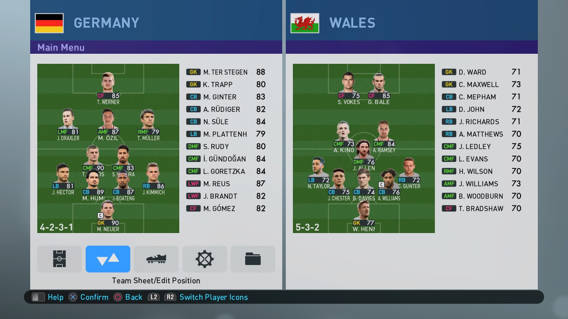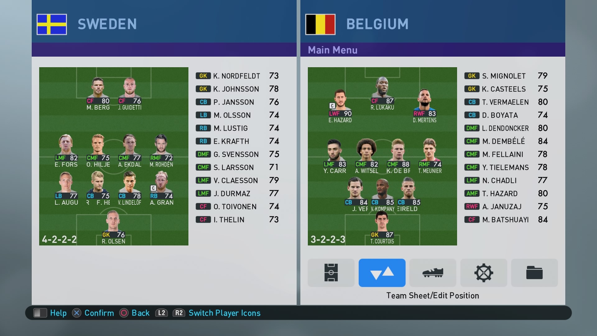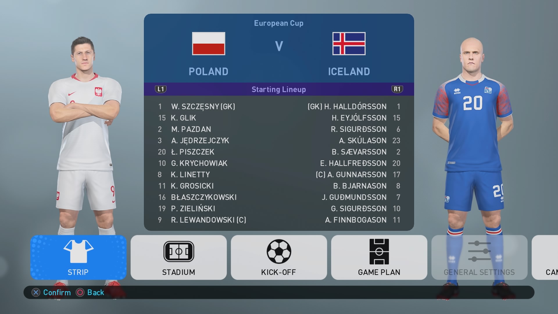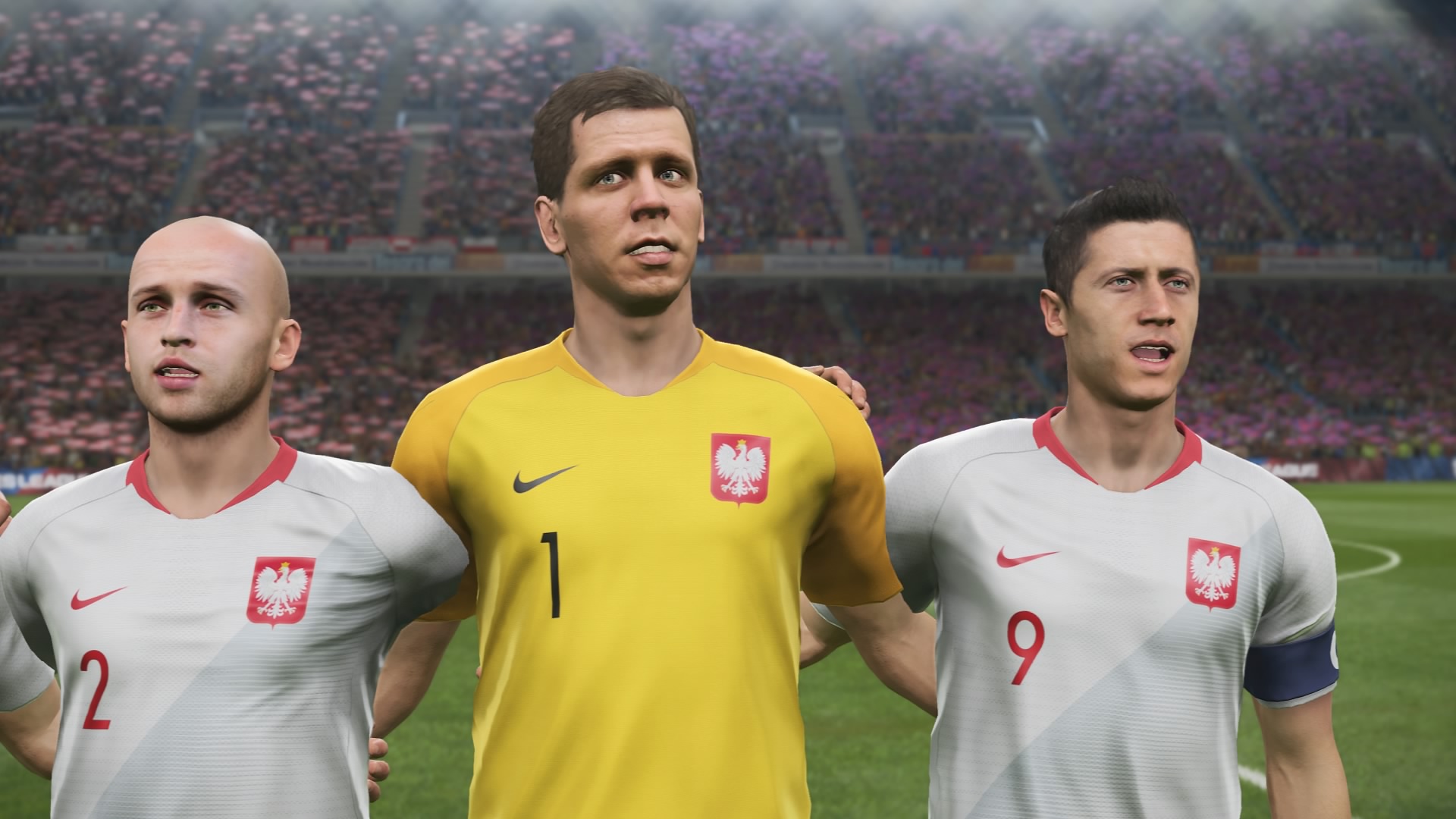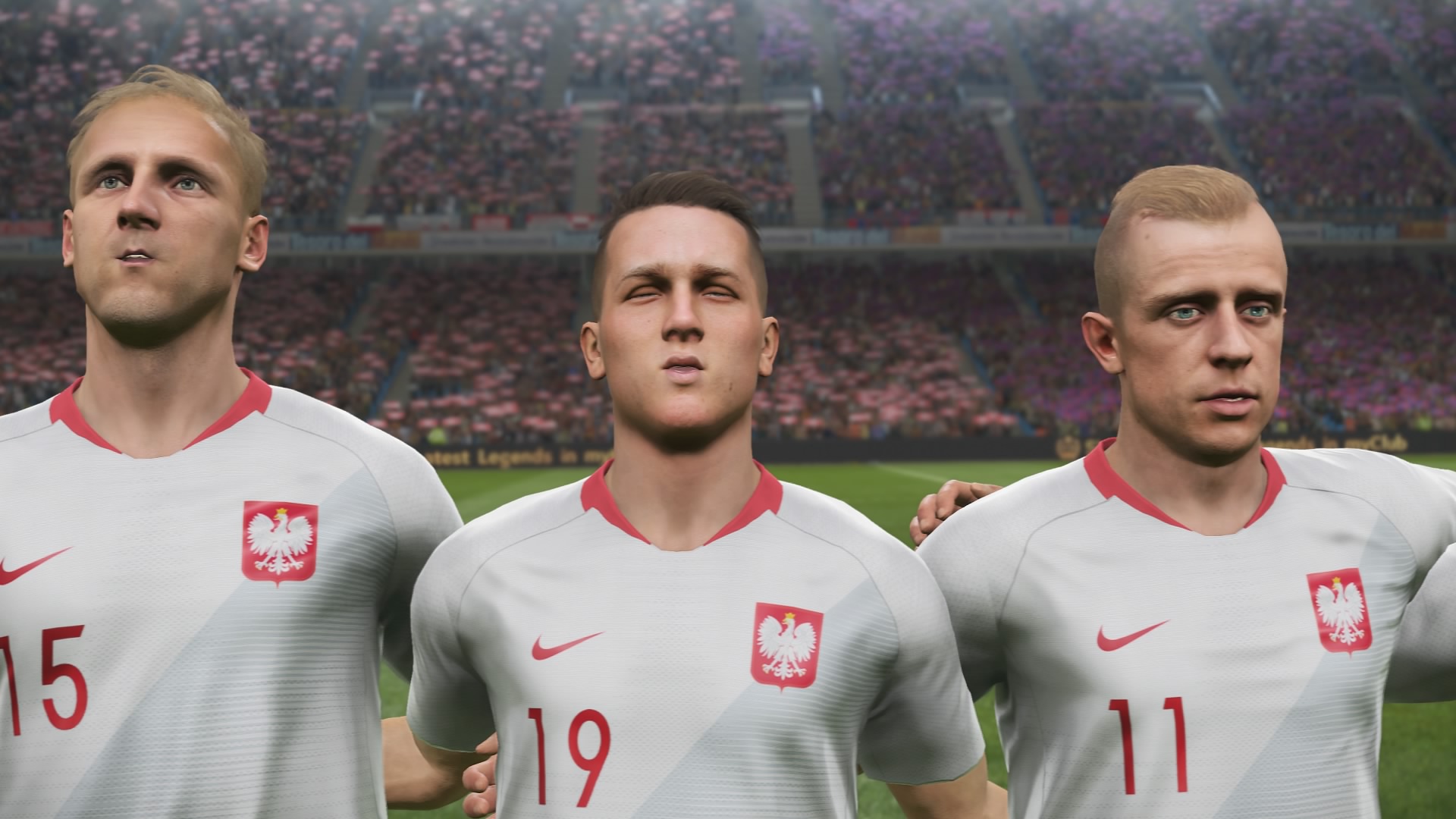 Co znajdziemy w rozgrywkach pucharowych? Europen Club Championship i Europen Master Cup – odpowiedniki utraconej Ligi Mistrzów i Ligi Europy. ECC niestety już bez popularnej “kaszanki” oraz otoczki związanej z LM, szkoda, bo Konami robiło naprawdę świetną robotę z całą oprawą Ligi Mistrzów. Pocieszające jest, że w International i European Cup, czyli odpowiednikowi Mistrzostw Świata i Europy znajdziemy wielu licencjonowanych piłkarzy w swoich reprezentacjach. Tutaj warto podkreślić, że nasza kadra reprezentantów Polski jest naprawdę dobrze odzwierciedlona. Skład przypomina ten z WorldCup 2018 w Rosji, każdy piłkarz ma wstawione zdjęcie, a jak kogoś brakuje, np Rafała Kurzawy, to jest jego praktycznie idealny model 3D. Na boisku podczas odgrywania hymnu bez żadnego problemu powinniście rozpoznać wszystkich naszych piłkarzy z wyjściowej “11” – graficy Konami wykonali kawal dobrej roboty.