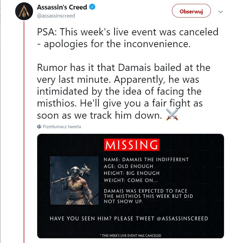 Udając się na Twittera Assassin’s Creed, możemy dowiedzieć się, że pierwsze sieciowe wydarzenie jest anulowane: