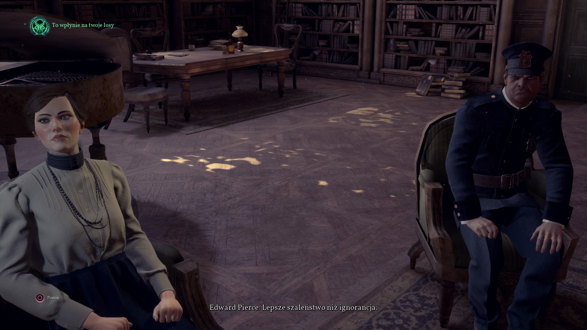 Nie bez powodu wspomniałem o rozmowach z mieszkańcami Darkwater, bo jest ich w Call of Cthulu naprawdę sporo. Nie ma się czemu dziwić, przecież nasz bohater to prywatny detektyw, więc przesłuchiwanie świadków jest dla niego na porządku dziennym. Poszlaki, które możemy wykorzystać w rozmowach odnajdujemy leżące w świecie gry lub poprzez doświadczanie retrospekcji. Niekiedy mamy możliwość prześledzenia, co stało się w danym miejscu. Gdy zobaczymy niebieskawą winietę na ekranie, możemy nacisnąć jednocześnie i przytrzymać oba spusty pada, by móc zbadać, co zaszło. Nie miałbym do tego elementu niczego do zastrzeżenia, gdyby nie to, że retrospekcje są zbyt szczegółowe i zaburzają poczucie zanurzenia w świecie. Pierce wyciąga z tych wspomnień stanowczo za dużo informacji na podstawie zbyt mało znaczących tropów.