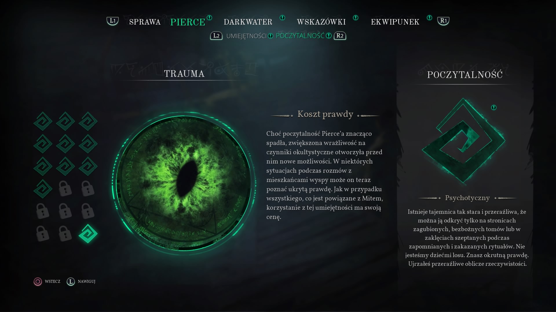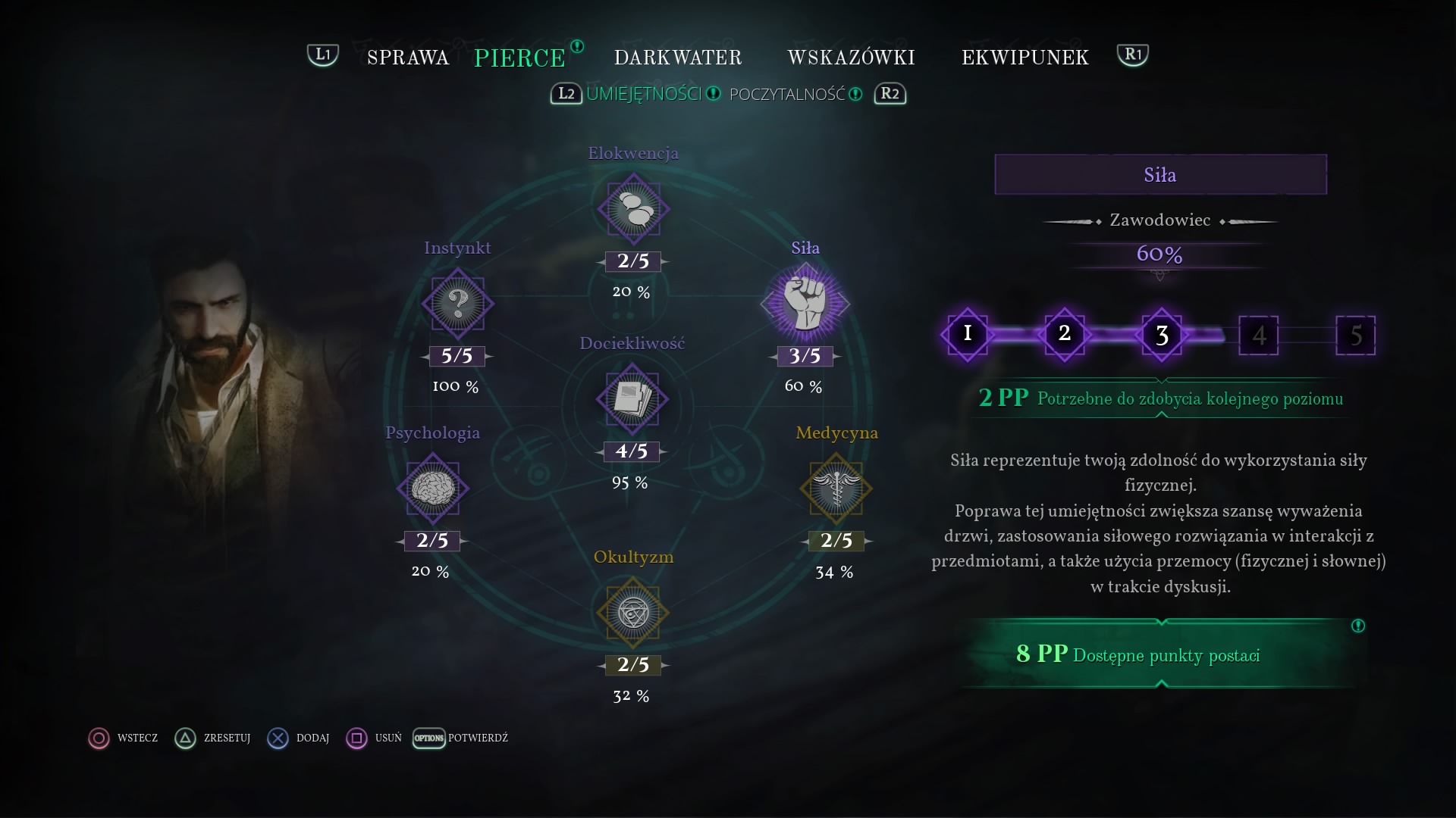 Z RPG-ów studio Cyanide zapożyczyło rozwijanie postaci i wybory. Wykonywanie celów zadań – również celów pobocznych – zapewnia nam co jakiś czas punkty rozwijania postaci – PP. Możemy je wydawać, by ulepszyć nasze umiejętności elokwencji, siłę, dociekliwość, instynkt i psychologię. Odpowiednie rozwinięcie biegłości w każdej z kategorii otwiera przed nami nowe możliwości rozwiązywania problemów. Przykładowo wysoki współczynnik dociekliwości pozwoli nam znajdować więcej ukrytych przedmiotów, co może się przydać w rozmowach z napotykanymi postaciami. Oprócz tych cech mamy też Medycynę i Okultyzm. Te rozwijamy jednak nie wydając punkty postaci, a wchodząc w interakcję z odpowiednimi przedmiotami w Darkwater. Warto jednocześnie być ostrożnym z Okultyzmem – zbytnie rozwijanie tego aspektu może doprowadzić Pierce’a do szaleństwa,a nawet zablokować jedno z zakończeń gry.