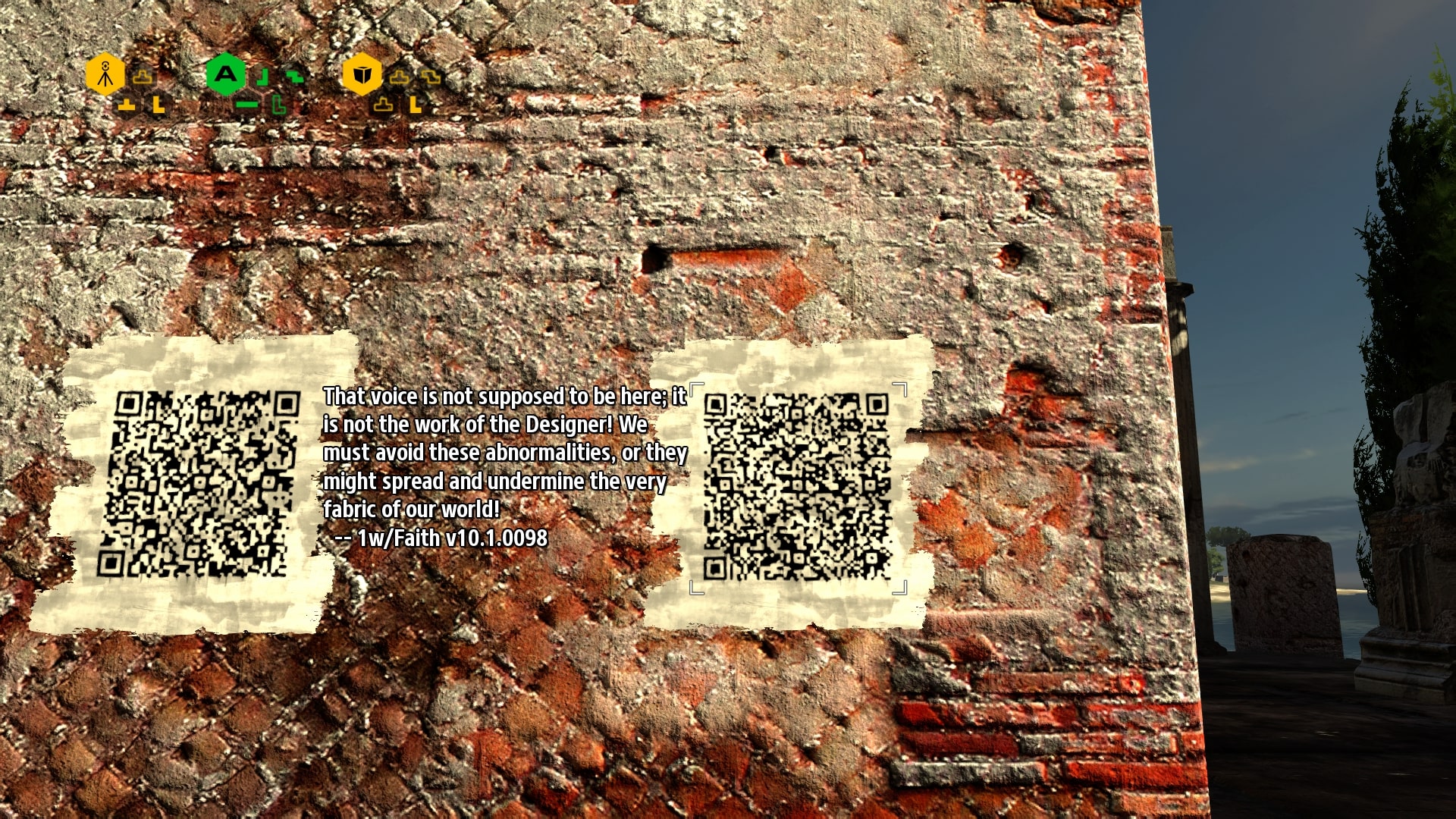 Na ścianach ruin w różnych miejscach możemy znaleźć kody QR, które po nakierowaniu pokażą nam zakodowaną w nich wiadomość. Teksty, które tam zobaczymy, są napisane przez ludzi, którzy testowali tę grę na Steamie podczas tworzenia The Talos Principle. Fajnie, nie? Niektórzy szczęśliwcy mogą zobaczyć tam swój nick, co dodatkowo zwiększa sentyment względem tego tytułu.