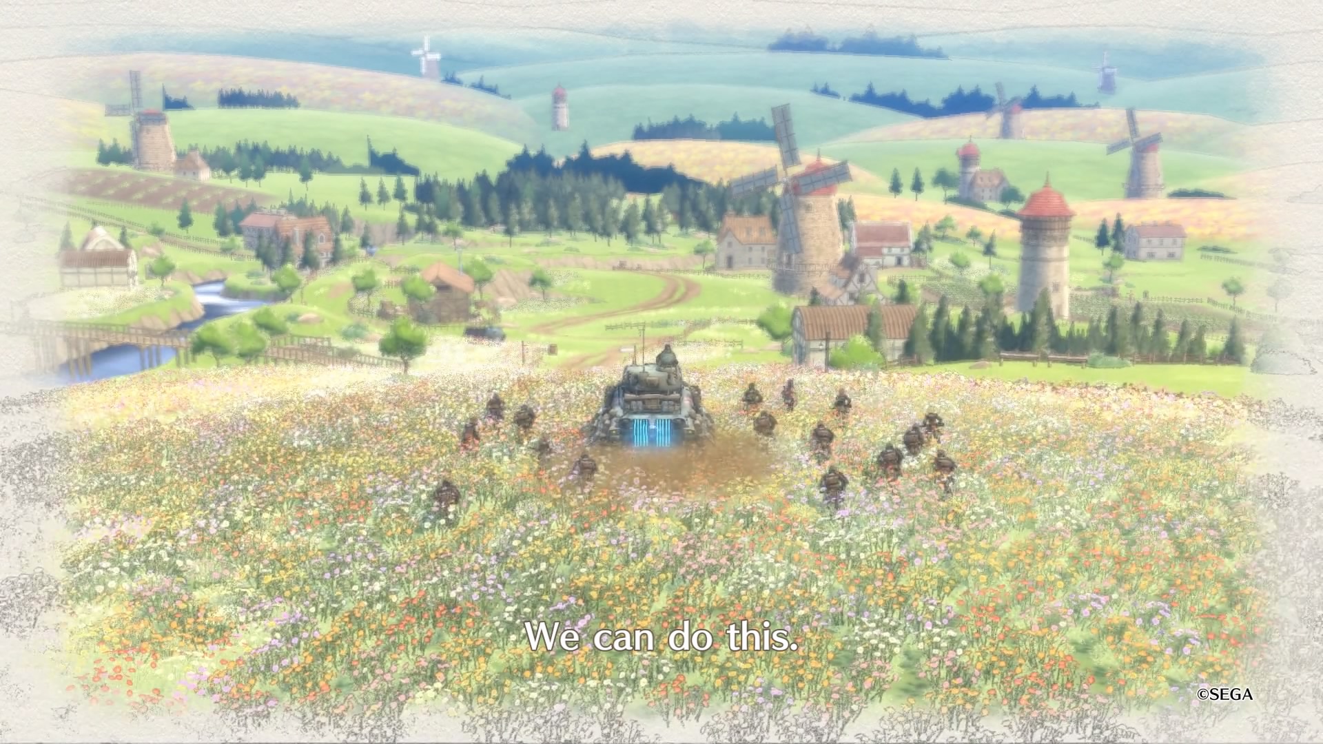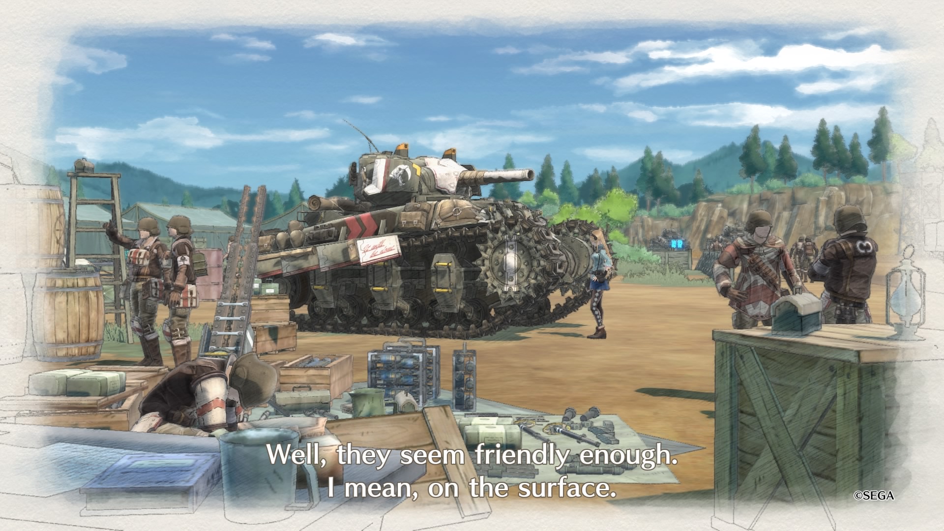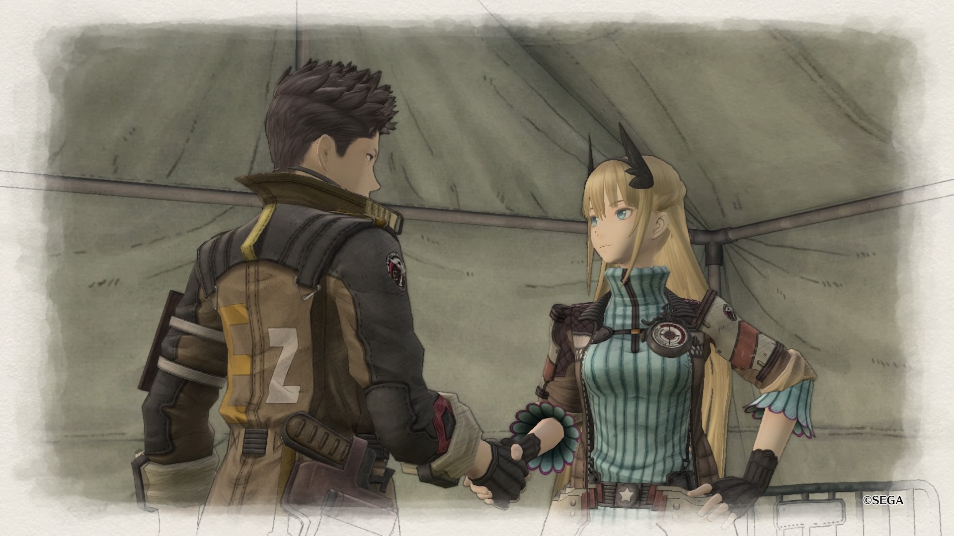 Wracając jeszcze do samego przedstawienia fabuły. Przez większość czasu widzimy całkiem niezłe ukazanie, tego, że wojna zmienia ludzi oraz wpływa na ich światopogląd oraz ogólnie przyjęte wartości. Przez to, że mamy jednak do czynienia z produktem stworzonym w Japonii, to w misjach pobocznych pojawia się już typowy japoński humor. Najbardziej uderzyło mnie to w momencie, w którym najpierw słyszę jak to wojna jest zła, że nie można porzucać swoich towarzyszy a za tło tego wszystkiego robi szpital polowy, gdzie mamy wielu rannych żołnierzy. Po tej sugestywnej scenie, odpaliłem jeden z dodatkowych epizodów i zostałem uderzony żartami na temat damskiej bielizny. Oczywiście nie są one obowiązkowe do przejścia fabuły, jednak jak człowiek już odpali taki epizod to nagle cały klimat wywraca się z impetem na plecy.