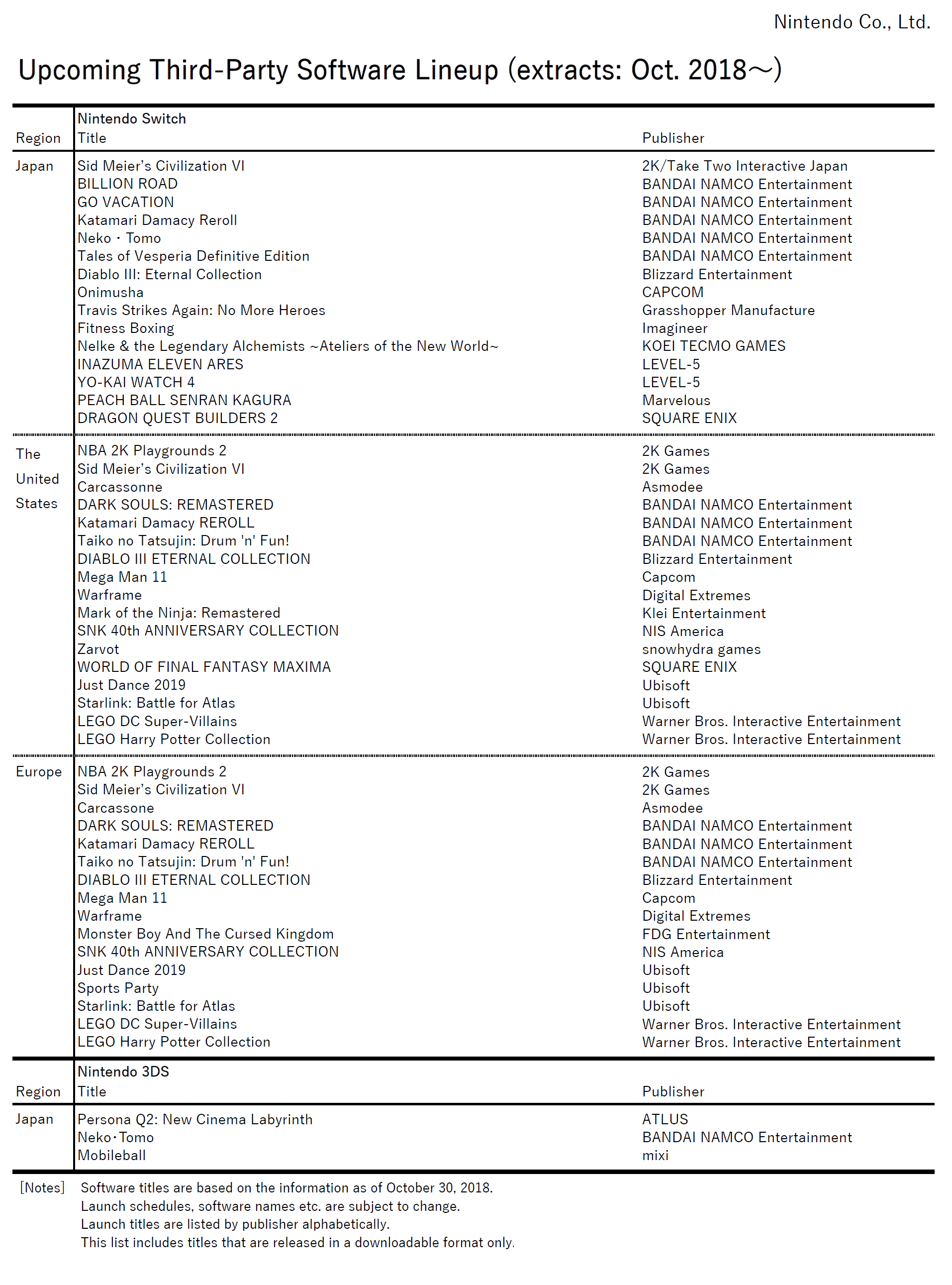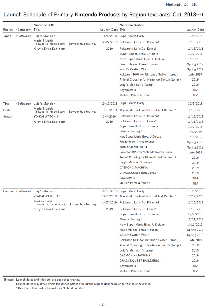 Ciekawostką jest fakt, że wciąż sprzedają się produkcje na Nintendo Wii. Podczas drugiego kwartału roku fiskalnego 2018, sprzedano kolejne 40 tysięcy kopii Mario Kart Wii, dając łącznie wynik 37,14 miliona kopii. Sprzedano też dodatkowe 20 tysięcy kopii Super Smash Bros. Brawl.