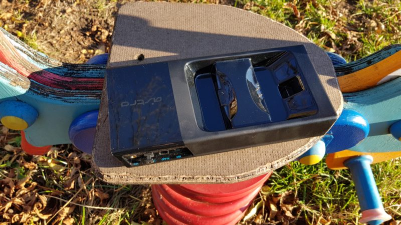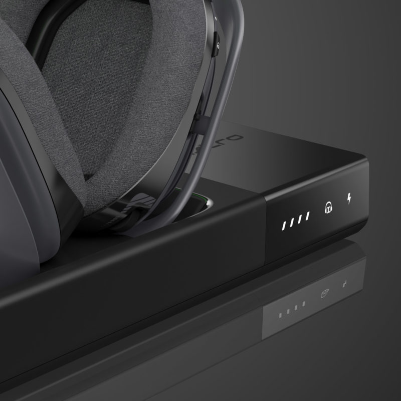 W pudełku znajdziemy oczywiście słuchawki, stacje dokującą, kabel USB oraz kabel optyczny wraz z instrukcją. Stacja dokująca jest wielkości tabliczki czekolady i bardzo dobrze komponuje się w pobliżu konsoli lub przy telewizorze. Po prawej stronie mamy malutki wyświetlacz, który pokazuje stan baterii w sluchawkach – cztery kreski to pełne naładowanie.
