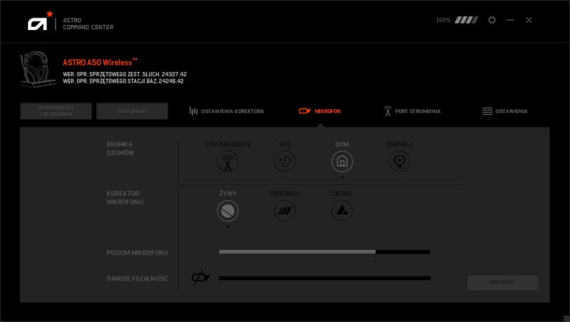 Astro A50 po wyjęciu z pudełka niestety nie są od razu przygotowane do użytkowania z PS4. Raz, że trzeba sprzęt od razu zaktualizować, a dwa poprawnie ustawić mikrofon, który przynajmniej w moim przypadku przekazywał dźwięk niewyraźnie, ale co gorsze w słuchawce słyszałem swój wracający głos. Problem ten udało się rozwiązać w aplikacji Astro Comand Center, która pozwala zarządzać słuchawkami podpiętymi przez port USB do PC. Kluczowe okazało się całkowite wyłączenie słyszalności, brak szumów na pozycji „dom” oraz kreator mikrofonu na „żywy”.