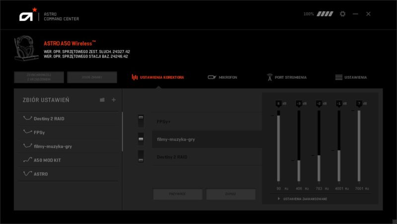 Astro A50 mogą mieć zaprogramowane w sobie trzy dowolne programy dźwięku, te domyślnie zaproponowane przez producenta nie do końca mnie przekonały i zacząłem szukać własnych ustawień oraz czytać w internecie, co proponują inni gracze. I tak oto w programie pierwszym udało mi się dostosować perfekcyjne ustawienia do gier akcji, szczególnie FPSów, w których wybuchu rozsadzające czaszkę mają być na pierwszym miejscu. Na tych ustawieniach bardzo dobrze grało mi się w Destiny 2, Overwatch i Call of Duty: Black Ops 4.