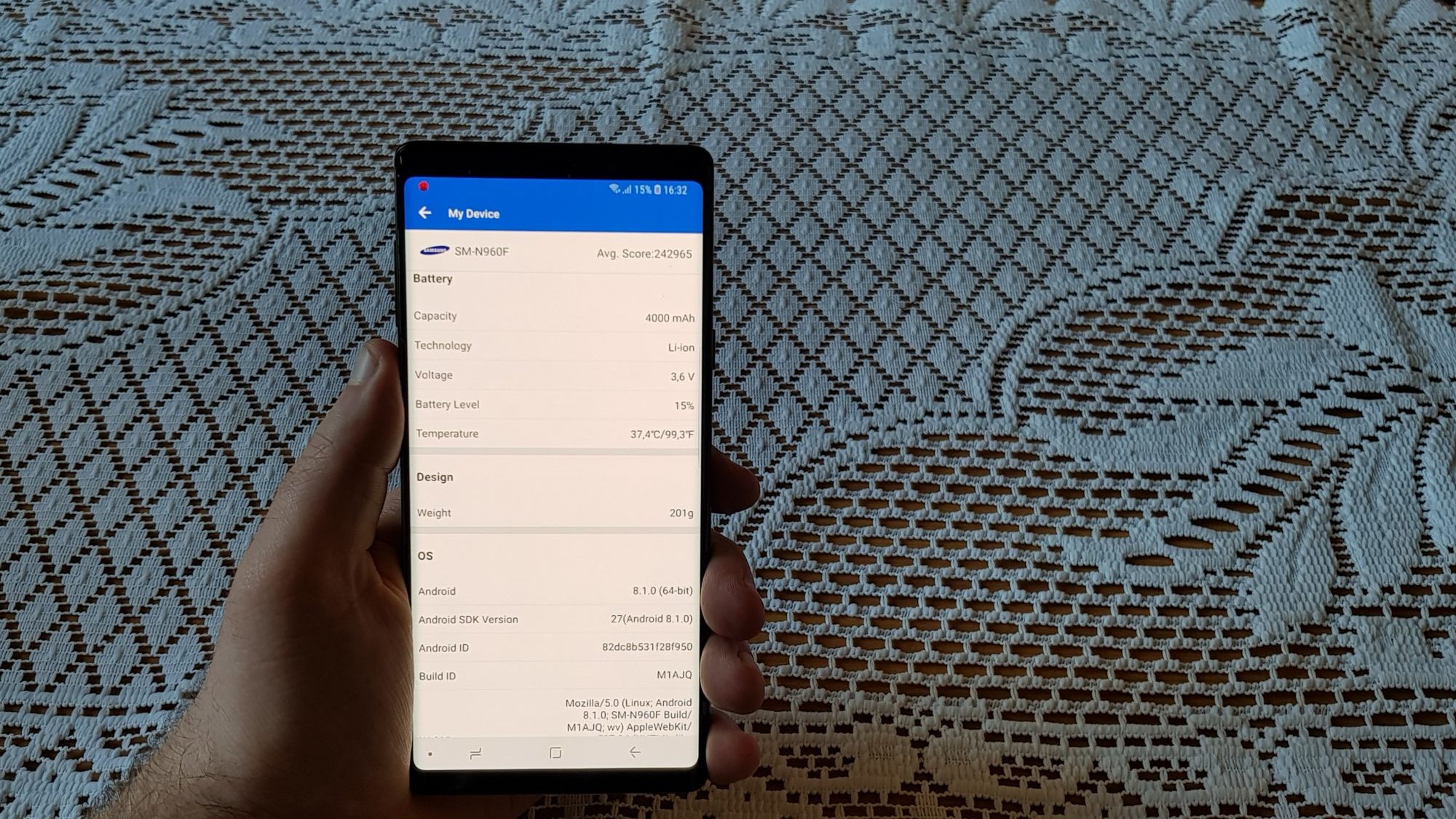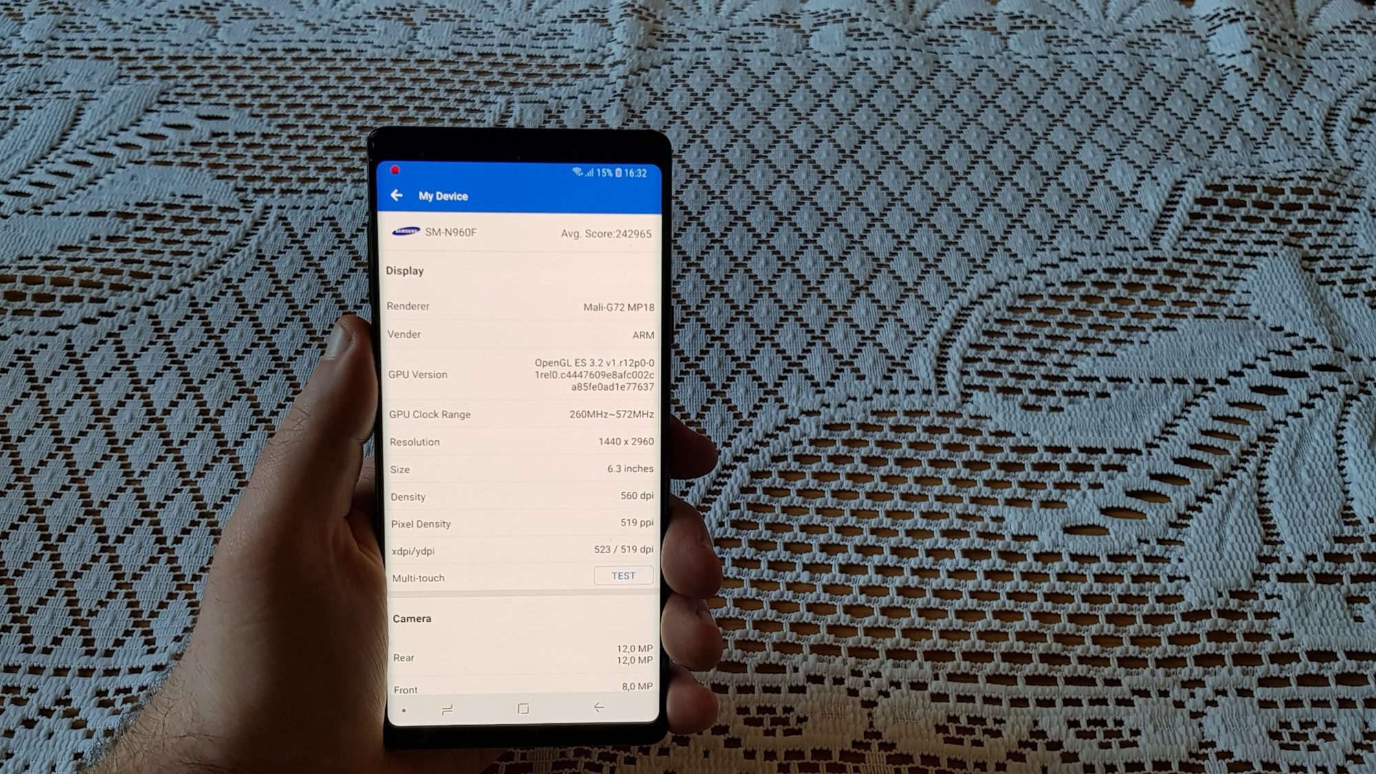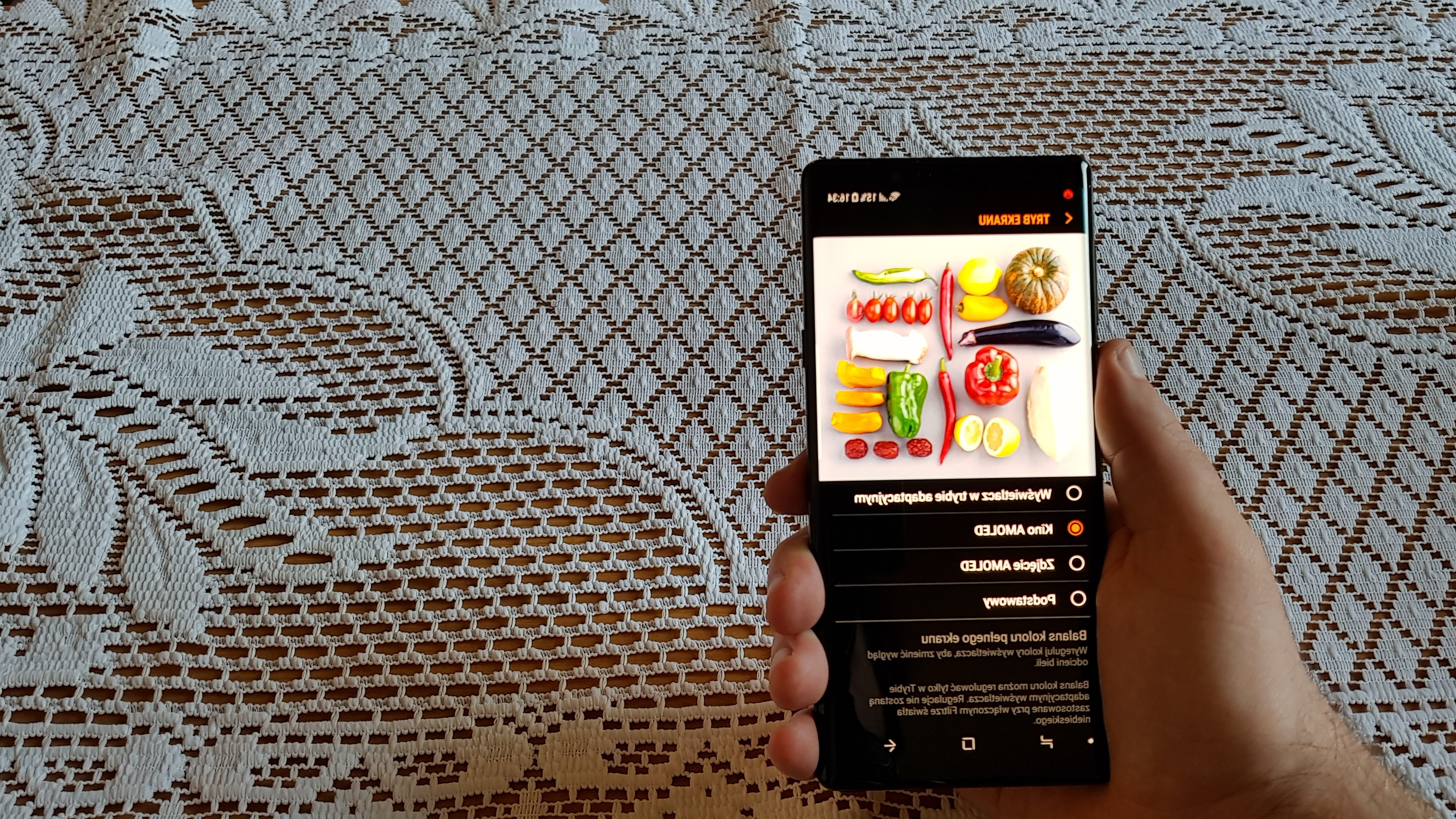 Maksymalna rozdzielczość wyświetlacza Note 9 wynosi 2960×1440 pikseli, jednak domyślnie ustawiona jest na 2220×1080, aby oczywiście wydłużyć czas pracy baterii. Osobiście ciężko było mi dostrzec różnice między FHD+ a WQHD+, więc dłuższy czas pracy urządzenia jest tutaj priorytetem i cały czas używałem smartfonu z rozdzielczością FHD+. Maksymalna jasność wyświetlacza wynosi do 700 cd/m2, a jego wielkość to aż 6.4 cala – proporcje 18,5:9. Wymiary w mm 161.9 x 76.4 x 8.8, waga 201 gram. Wyświetlacz i plecki chroni szkło Gorilla Glass. Tutaj warto przypomnieć dla porównania, że najpopularniejsza obecnie przenośna konsola na rynku Nintendo Switch ma ekran wielkości 6.2 cala przy rozdzielczości 1280×720.