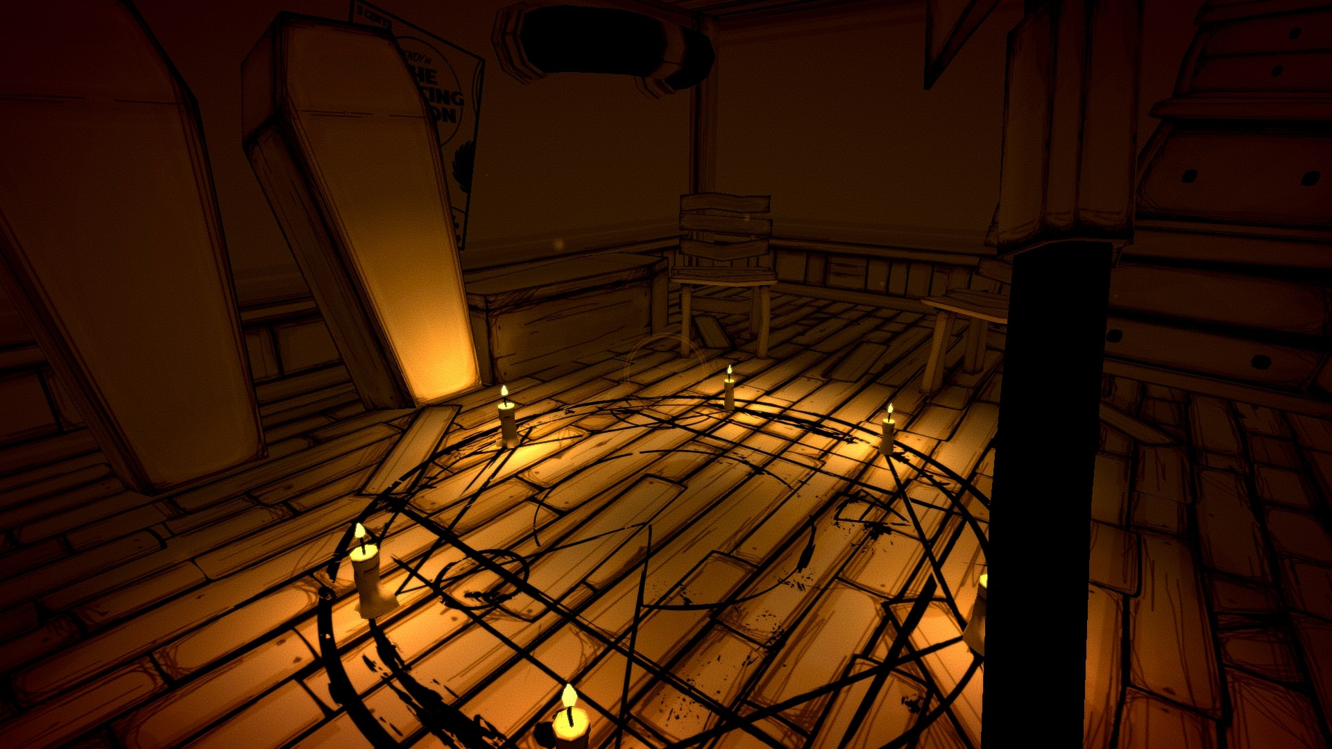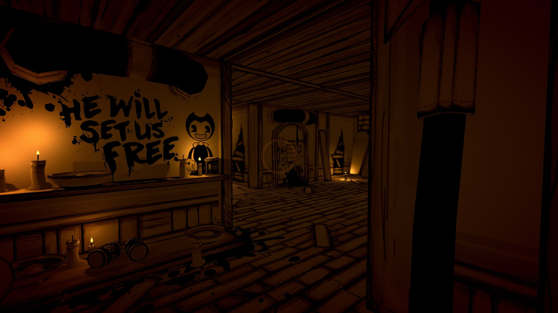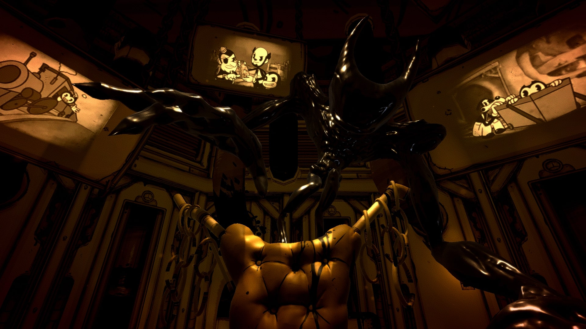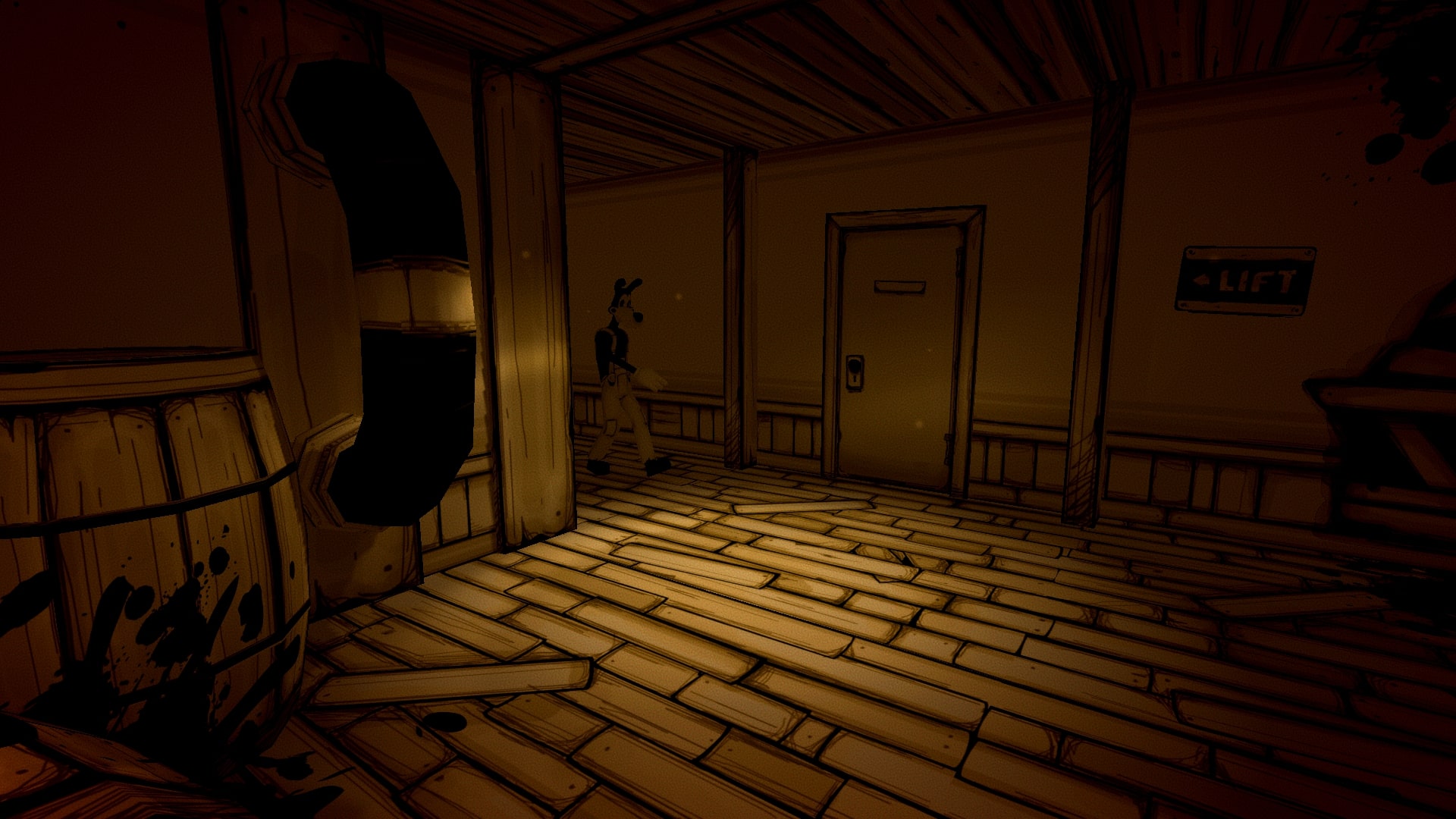 Strachów w grze jest trochę, Ink Bendy jest straszny, trafimy na parę innych potworów, a także natkniemy się na zwłoki. Przez filtry i sam typ grafiki nie jest to jednak aż tak przerażające, jak byłoby z pełnoprawnym 3D i prawidłowym odwzorowaniem kolorów. Przecież to tusz się leje z postaci, nie krew, prawda?