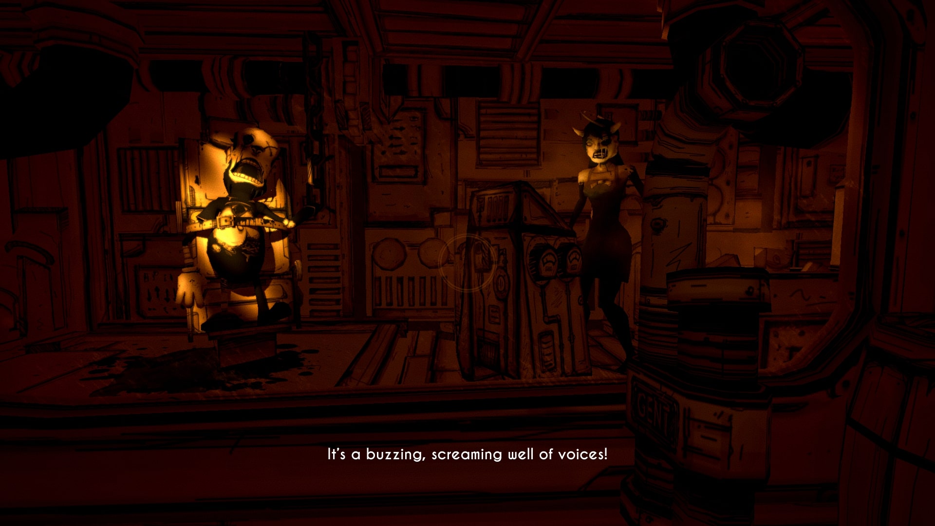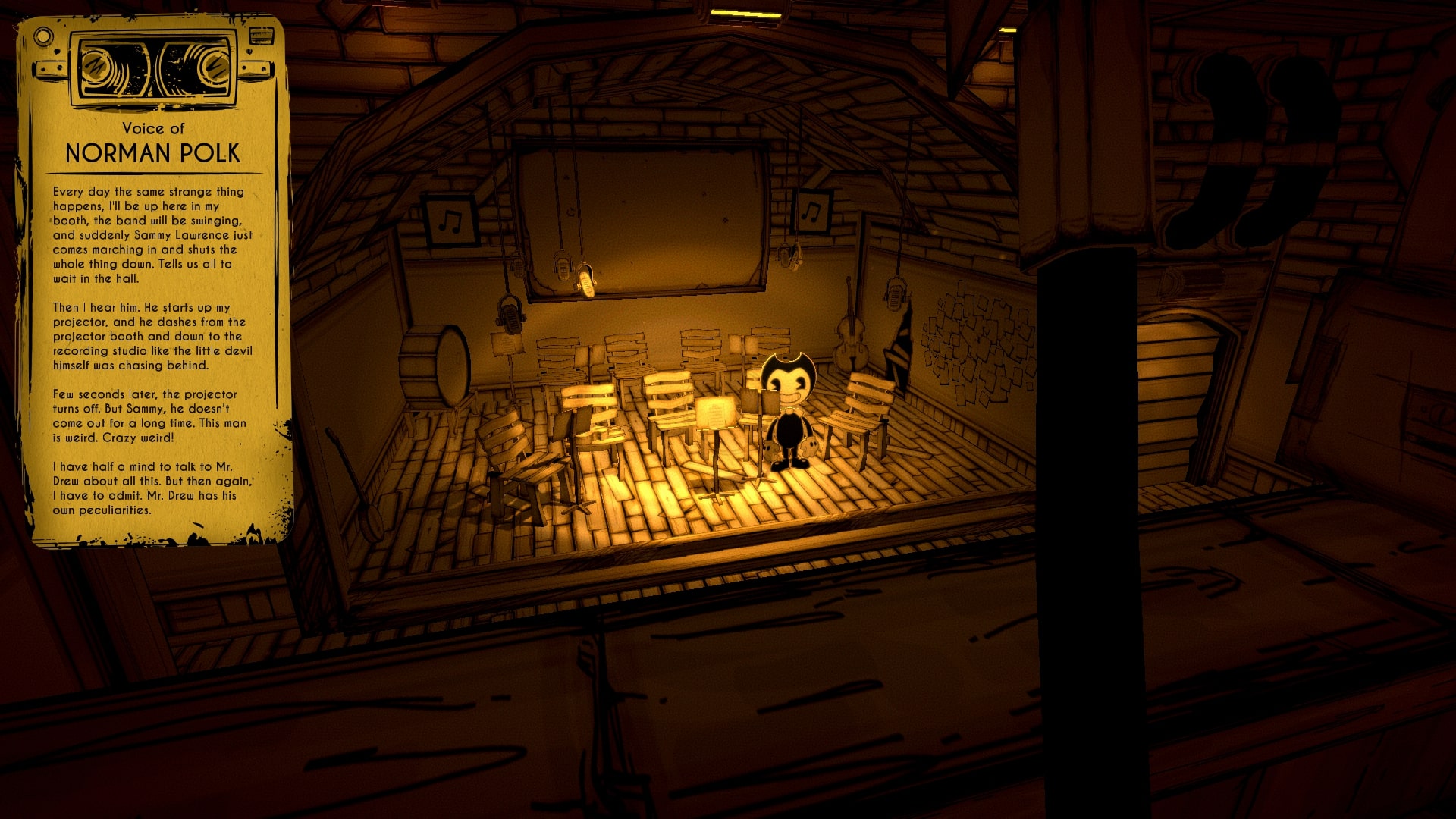Ink Machine to nie zwykły projektor, a postacie ze wspólnie stworzonych bajek zaczynają ożywać nie tylko na ekranie. Przed nami więc czytanie/słuchanie notatek nagranych przez Joey’a i innych pracowników studia. W ten sposób właśnie poznajemy historie kreskówki i wszystkiego, co się dzieje. Na taśmach znajdziemy też wskazówki dotyczące tego, co mamy zrobić.