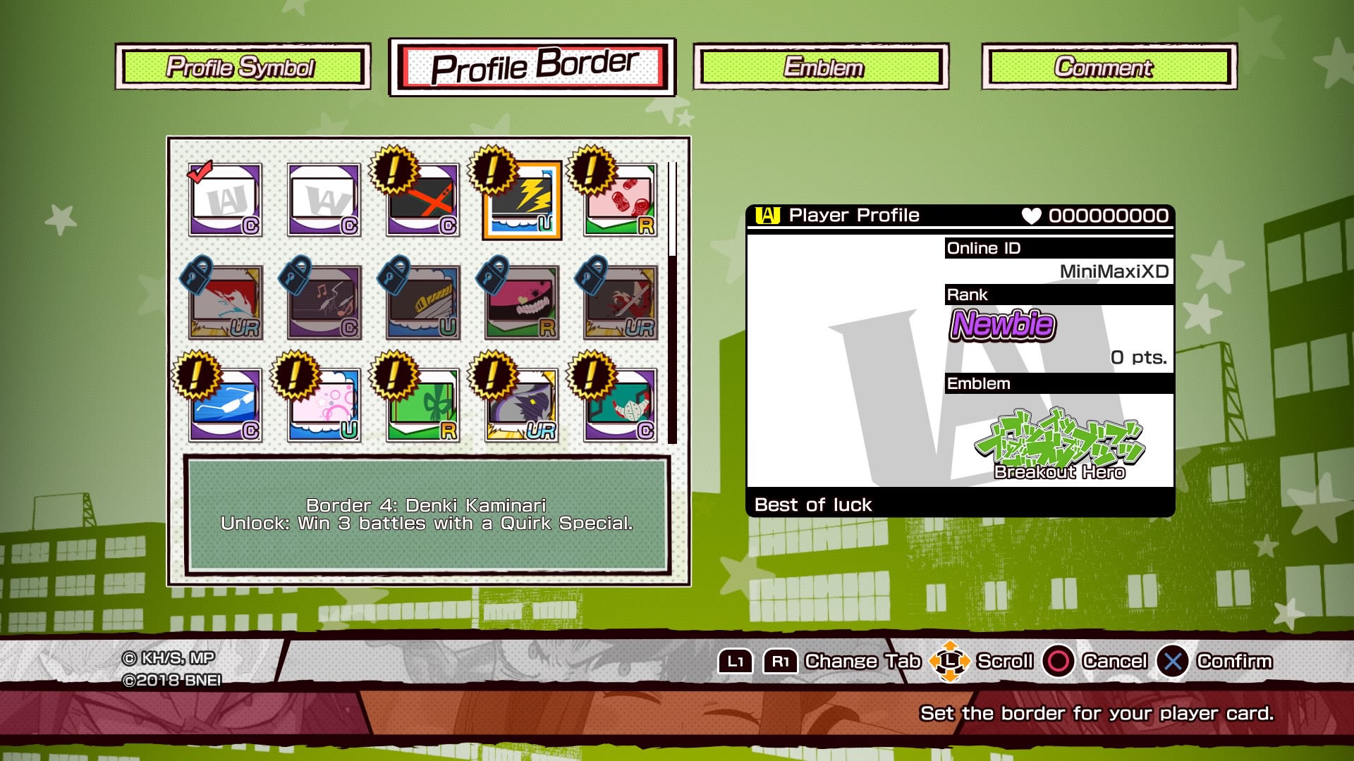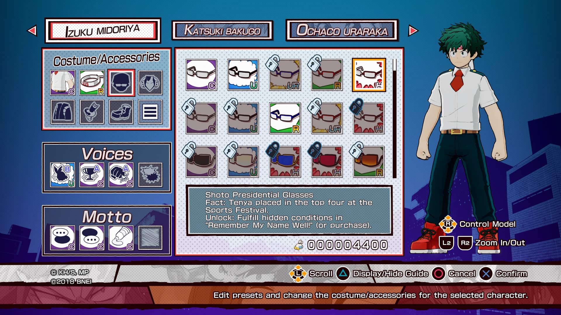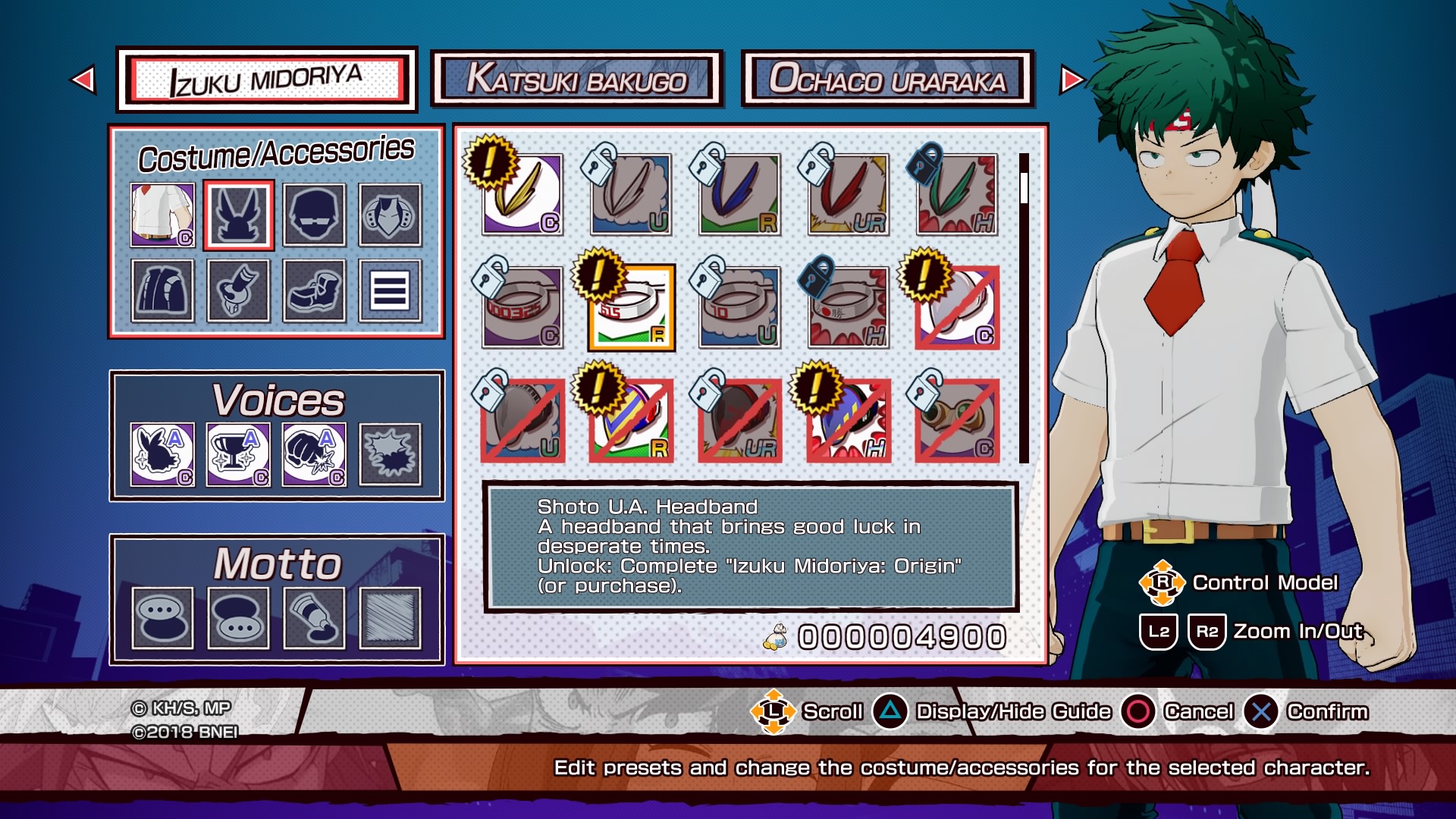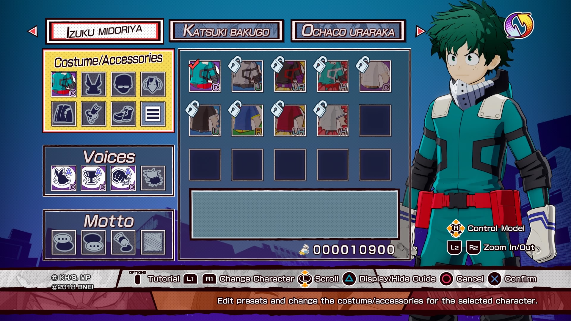 Na koniec zostawiłem sobie aspekt, który był promowany podczas reklamowania produkcji. Chodzi o możliwość ubierania naszych postaci w różne wymyślne kreacje. Wszyscy, którzy spodziewali się kreatora rodem z Tekkena 7 czy Tag Tournament 2 mogą się rozejść. Całość jest prosta, żeby nie powiedzieć banalna. Dostępne kostiumy są nudne i bez polotu (duża część z nich to jeden ubiór w różnych kolorach). Dostaliśmy też wiele dodatkowych gadżetów i cóż, jeśli ktoś uważa, że widok takich postaci jak Bakugo z czapką z podobizną innego bohatera serii jest czymś leżącym blisko definicji „dobre”, to zazdroszczę takiej dozy optymizmu. Tutaj chcę zaznaczyć, że lubię kreatory w bijatykach, które oddają w moje ręce ubranie ulubionych wojowników na mój styl, jednak One’s Justice daleko do tych produkcji.