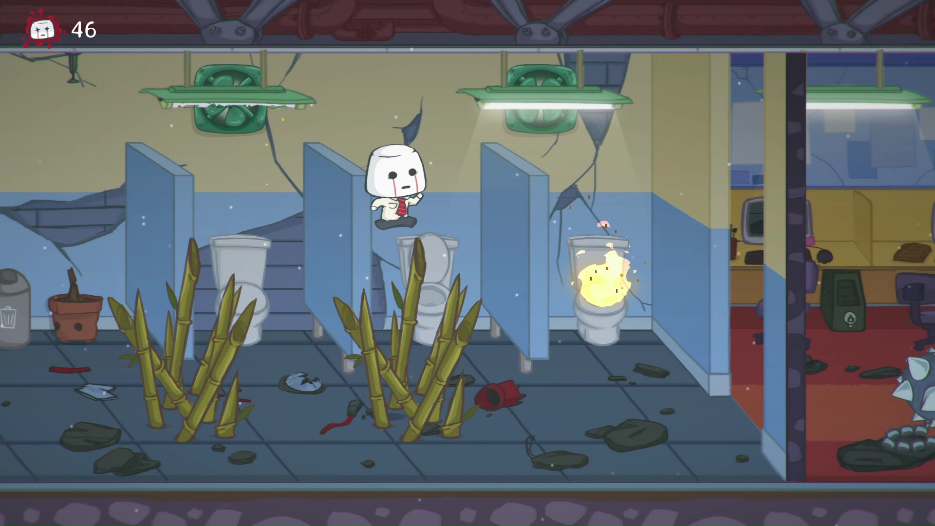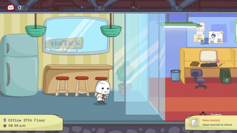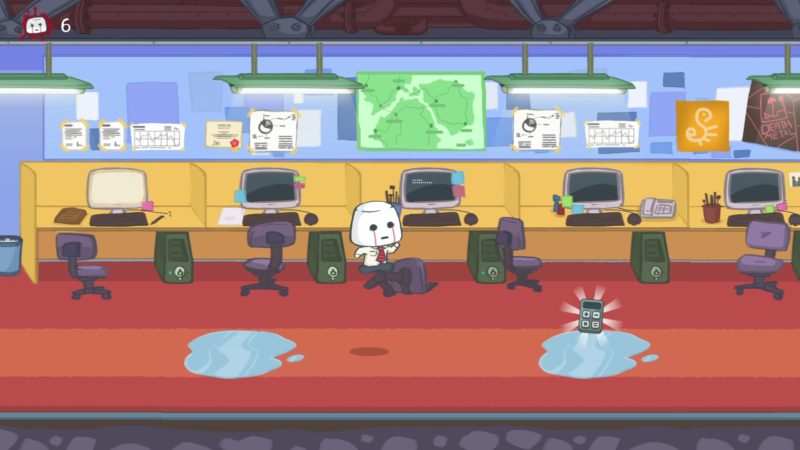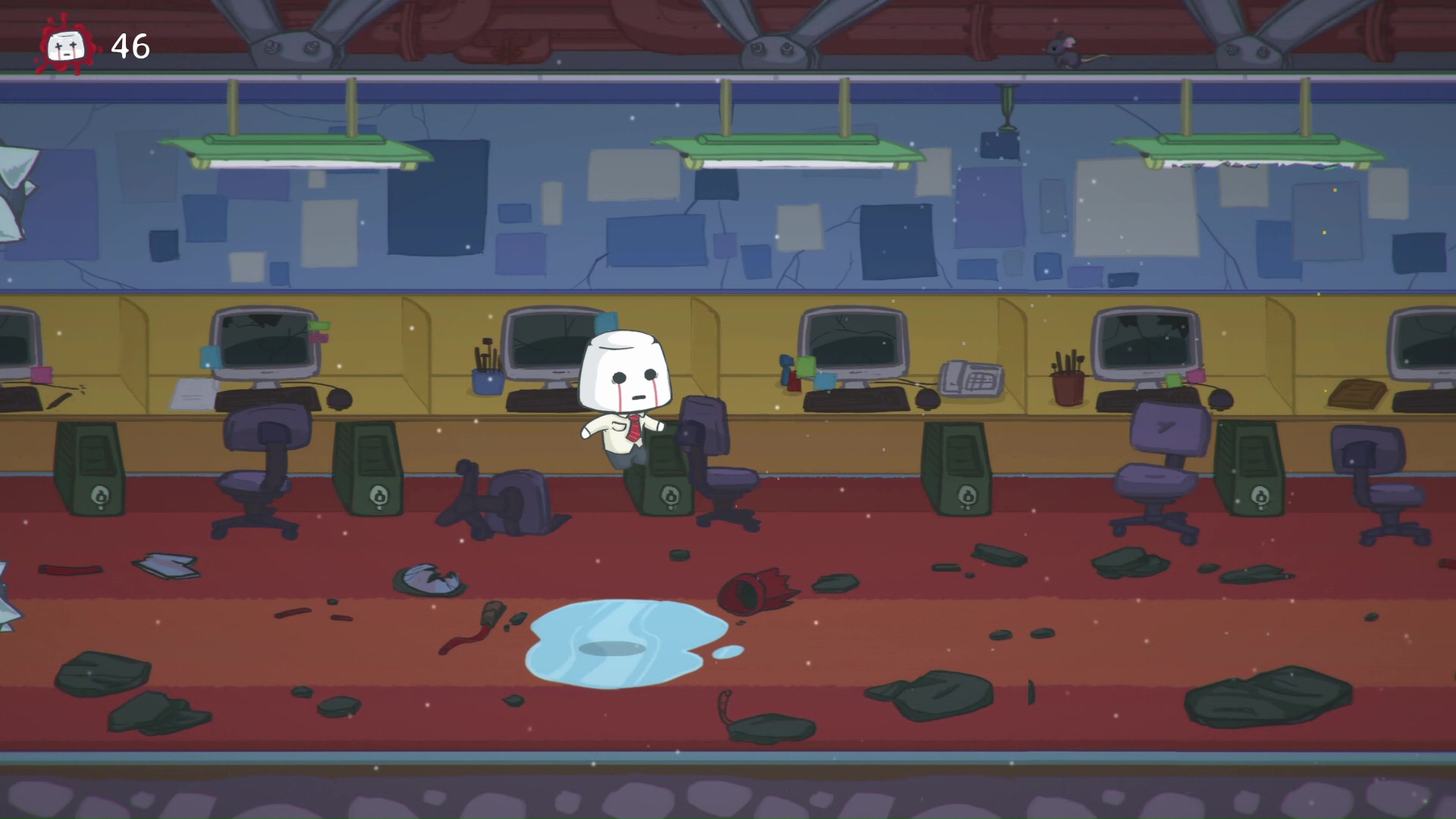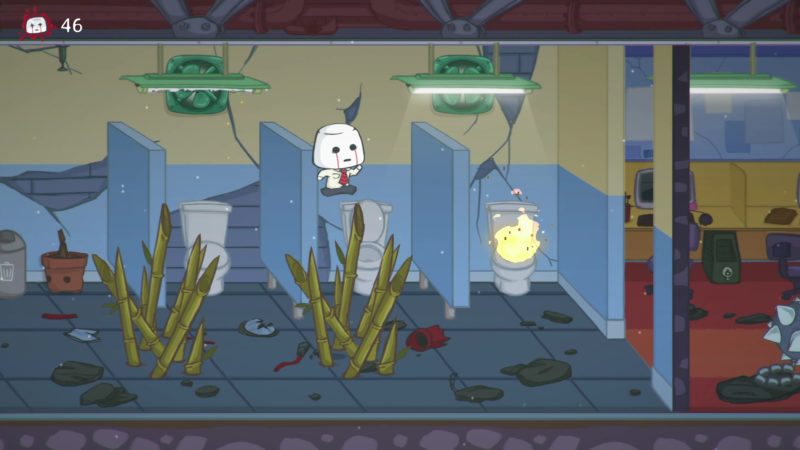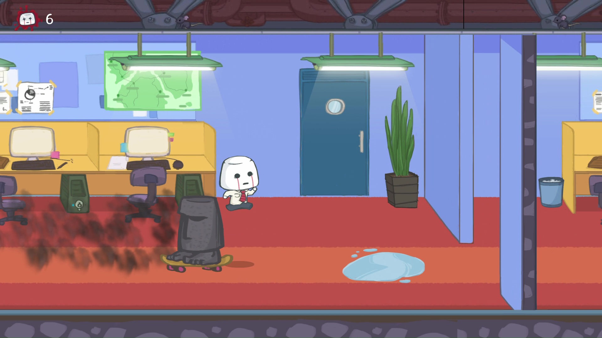 Choć na pierwszy rzut oka mamy tutaj do czynienia ze zwyczajną platformówką, już parę pierwszych kroków w biurze pokazuje czym wyróżnia się ten tytuł. Podczas zabawy będziemy ginąć na potęgę. Twórcy na całej trasie poukrywali ogromną liczbę śmiercionośnych przeszkód. Praktycznie każdy widoczny na ekranie obiekt może skrywać morderczą pułapkę. Spacerując mogą znikąd wyskoczyć nam na podłodze kolce. Deskorolki z rzeźbami nagle mogą zacząć pędzić w naszym kierunku. Pod sufitem znajdziemy czasem kolczastą kulę, która zabije bohatera przy zbyt wysokim skoku. Niemałym zaskoczeniem może okazać się także zawartość kałuży.