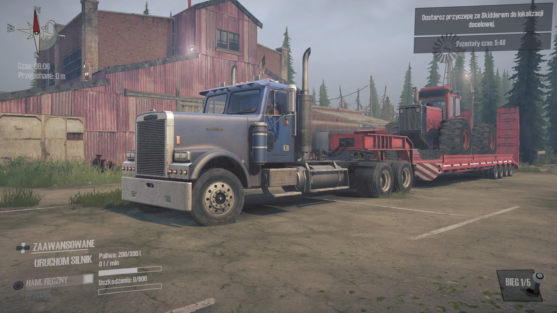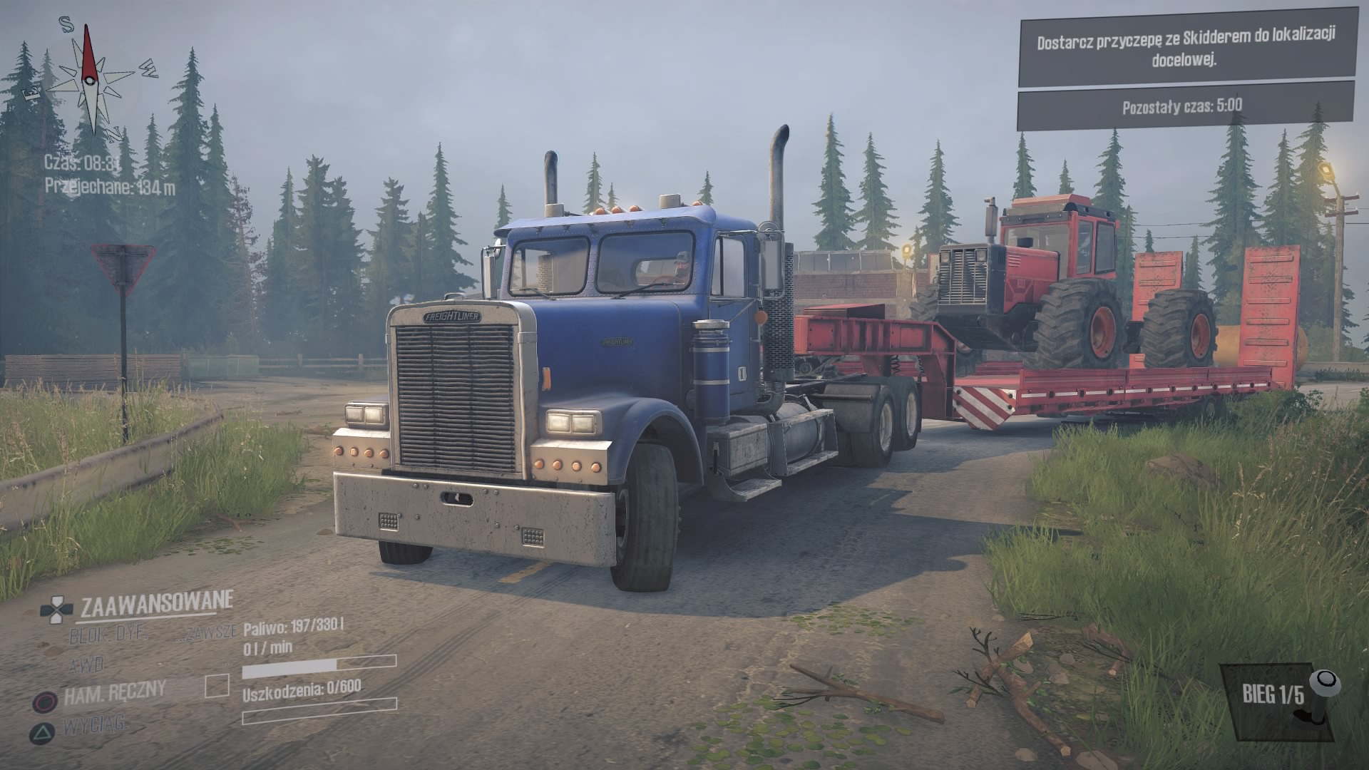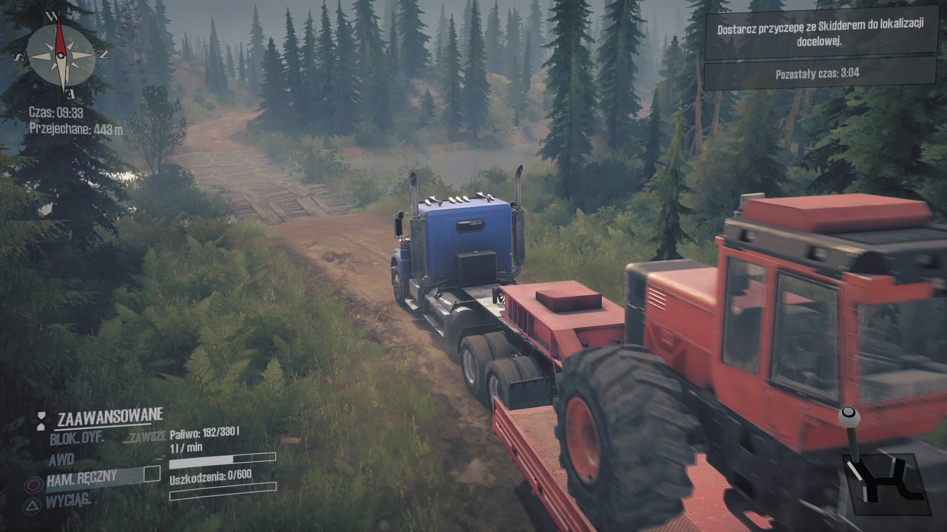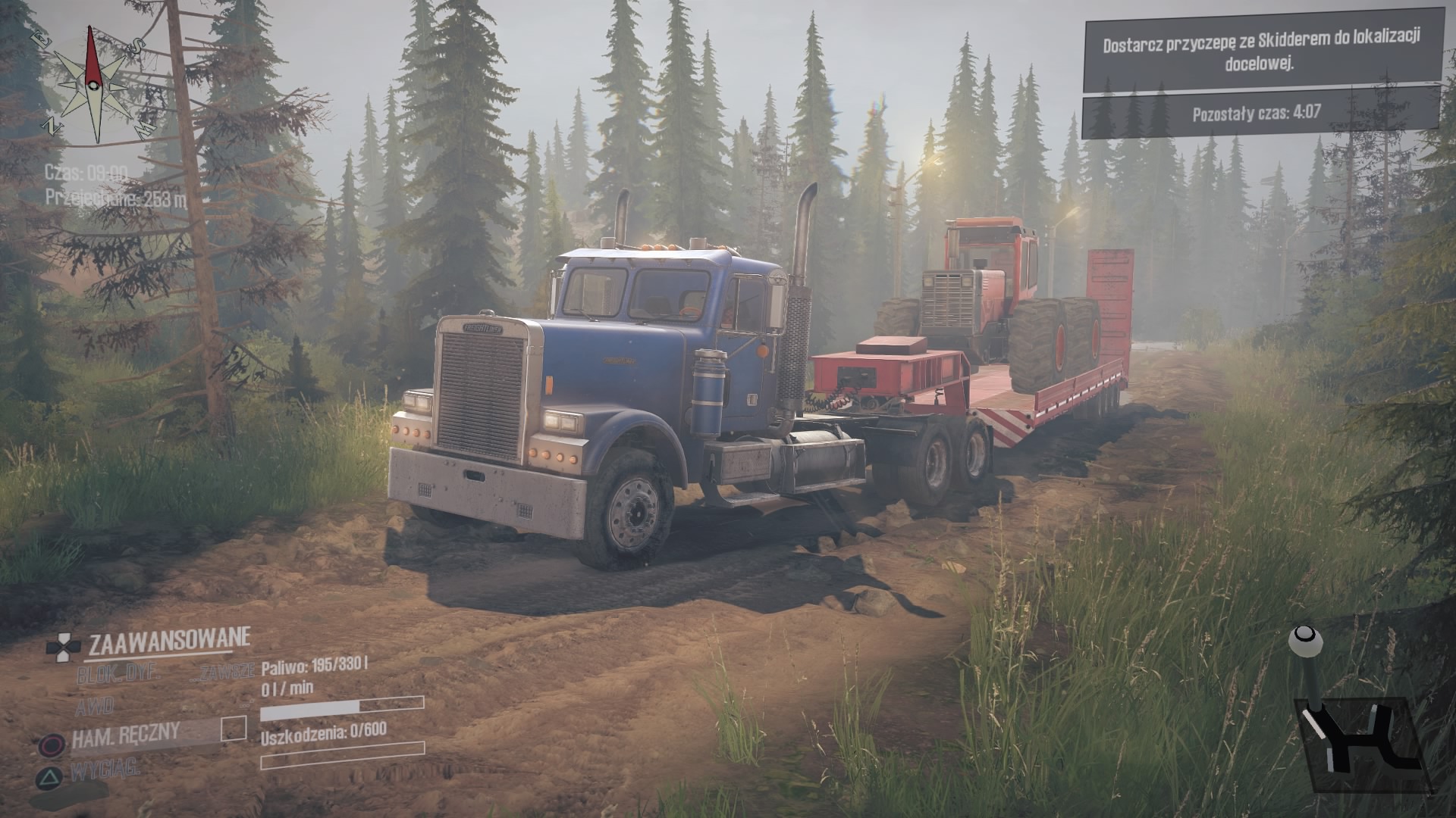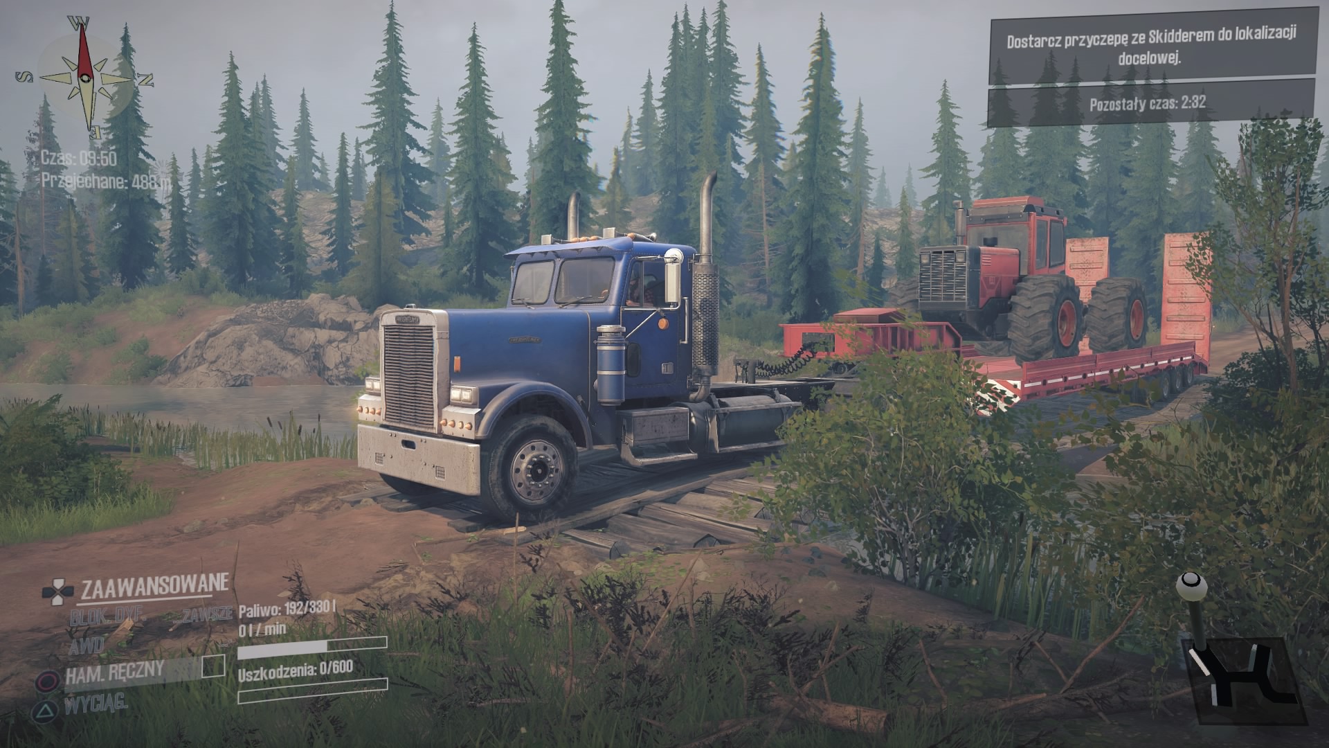 Drugie wyzwanie “Freightg-EX” jest absolutnie kapitalne i spodoba się każdemu fanowi American, czy Euro Truck Simulator. Zasiadamy w kabinie ciężarówki a na długiej naczepie mamy zamontowanego ogromnego Skiddera. Zestaw jest naprawdę długi a druga kręta i jak to bywa w Spintires: MudRunner asfalt szybko się kończy i musimy poruszać się bo bardzo grząskim gruncie. Lusterka niestety nadal nie działają, a zza oko także nie możemy się wychylić, więc widoczność mamy znacznie ograniczoną. Ta misja, to najlepsze, co mnie spotkało w Spintires: MudRunner American Wilds.