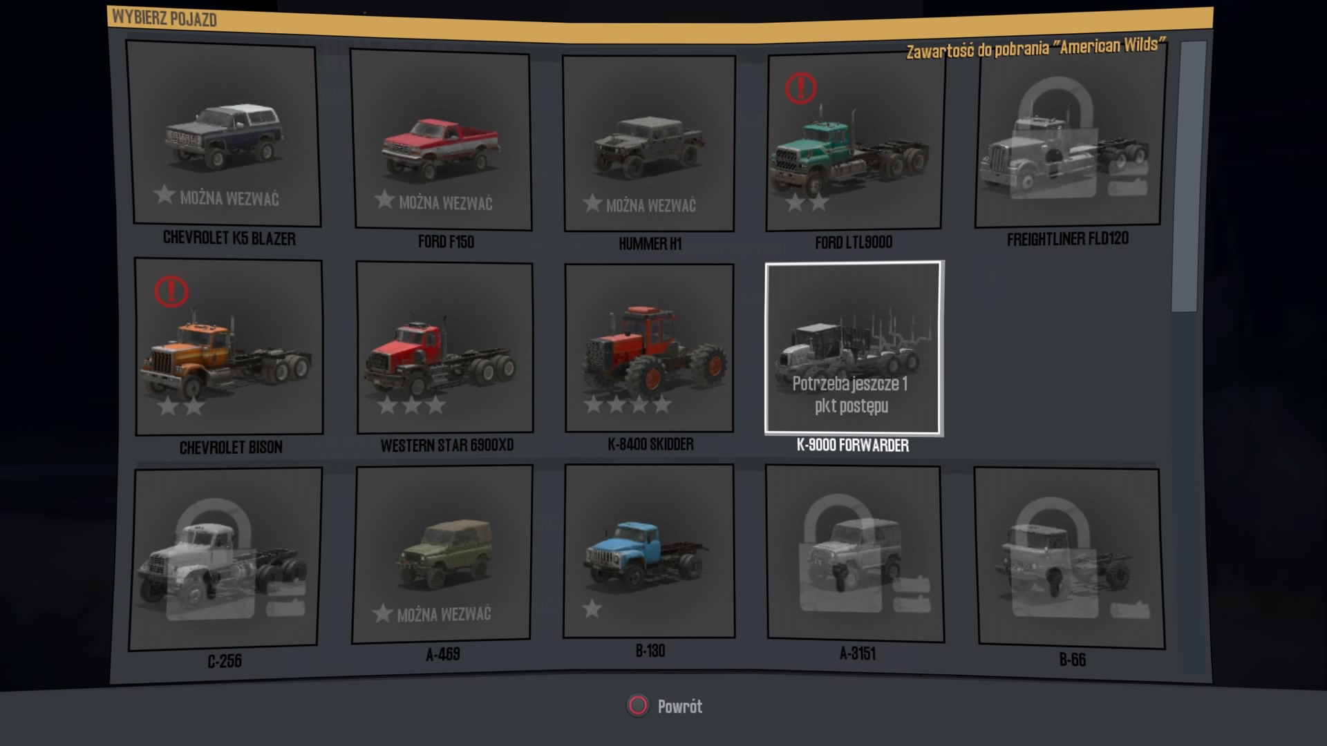 American Wilds to także dziewięć nowych samochodów, w tym jest bardzo popularny pojazd terenowy stworzony na potrzeby amerykańskiej armii – Hummer H1. Dodano pięć ciężarówek, takich firm jak: Ford, Freightliner, Western Starm, czy Chevrolet do których możemy zamontować rożne naczepy, czy paki na mniejsze kłody drzewa. Z “farmerskich” samochodów terenowych dodano Forda F150 i Chevroleta K5 Blazer.