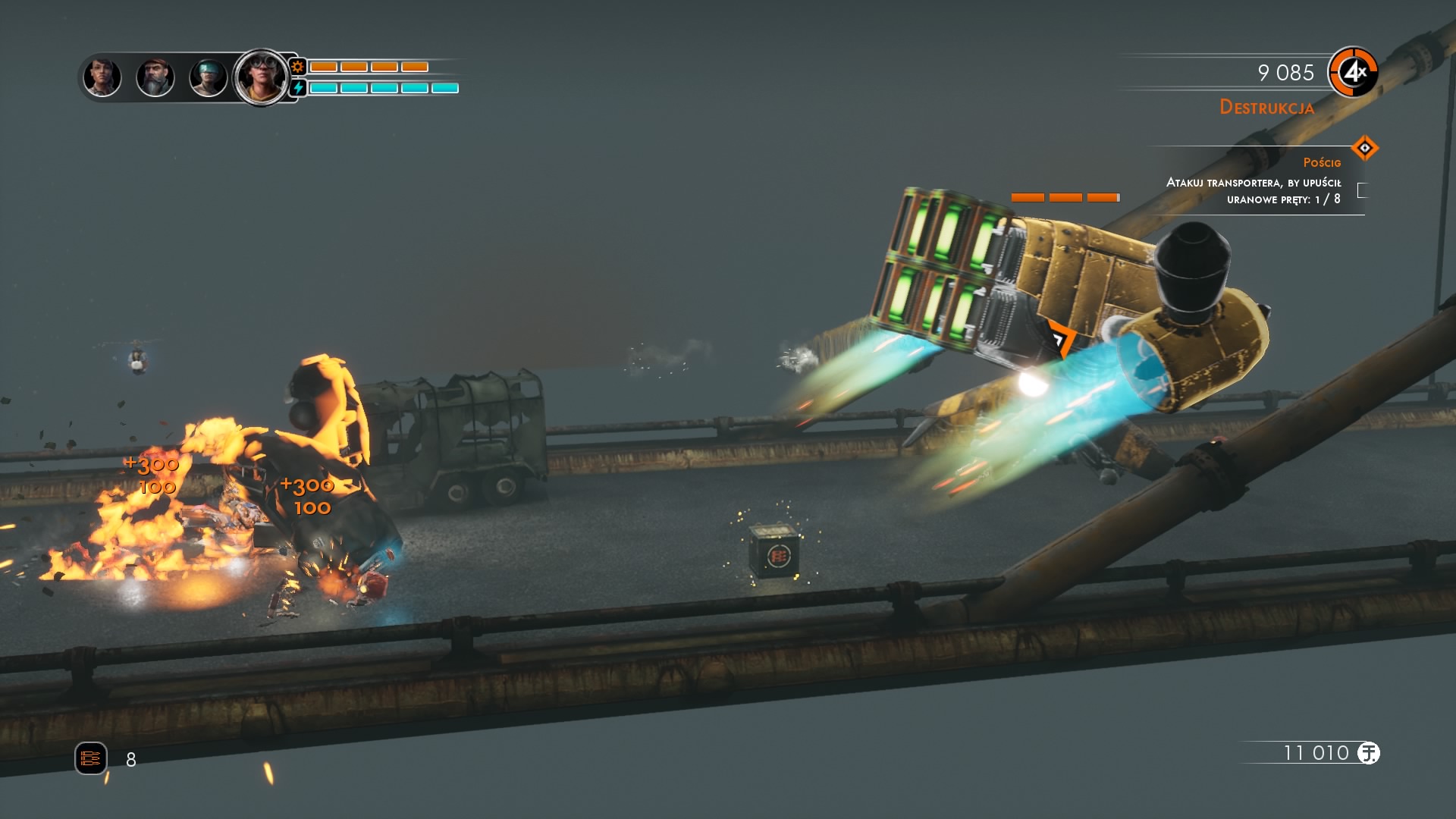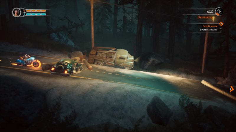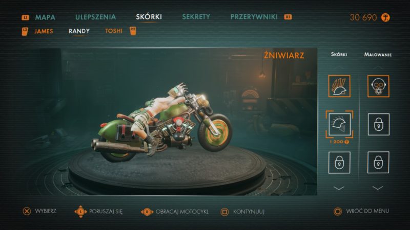 James, to mój ulubiony kierowca, może mieć najwięcej punktów zdrowia , a z robotami rozprawia się za pomocą fali uderzeniowej, może także ogłuszać przeciwników – jego motocykl jest niczym młot Thora! Randy jest moim zdaniem najmniej przydatną postacią, używa harpuna, którym może przyciągać do siebie roboty, aby łatwiej było je rozjechać. Toshi lubi bawić się prądem i ma drona, który razi przeciwników, jednak jego celność zostawia sporo do życzenia. Może także niszczyć roboty minibombami.