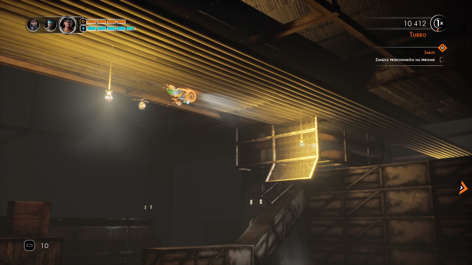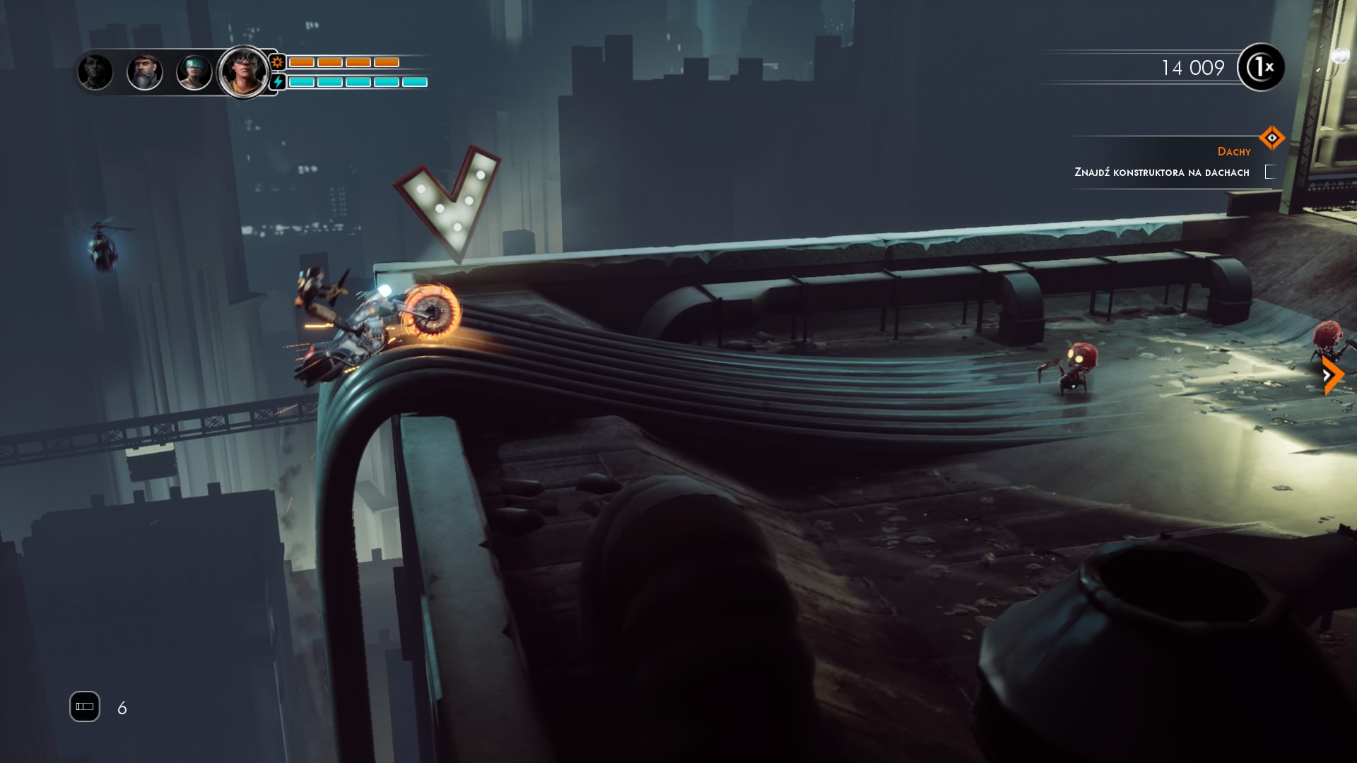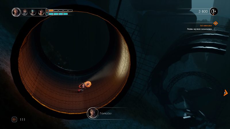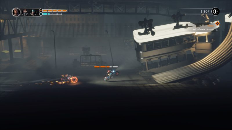 Wszystkie motocykle, jak już wspomniałem mają róże umiejętności. Jednak łączy je jeden wspólny skill, to turbo z piłą, które z jednej strony pozwala szybciej jechać, a z drugiej pozwala wspinać się po stalowych rurach w normalnie niedostępne dla kierowców miejsca, a z trzeciej oczywiście niszczyć mniejsze roboty. Dla naszych bohaterów nie ma niedostępnych miejsc, no chyba, że nie ma tam specjalnych rur po których nasza płonąca przednia opona będzie mogła się poruszać. Musze przyznać, że taki pomysł na przyspawanie motocykla do ścian bardzo mi się spodobał.