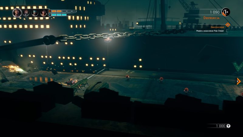 Steel Rats zostało wykonane na silniku Unreal 4 i najnowsza gra Tate Multimedia prezentuje się na nim naprawdę ładnie oraz działa płynnie na PS4 Pro. Poziomy są wykonanie fantastycznie, tym bardziej, że Coastal City jest podzielone na kilka ciekawych dzielnic, jak kopalnia, centrum handlowe, wysokie budynki, dzielnica przemysłowa, port, park i złomowisko. Port, to chyba moja ulubiona plansza, uciekamy przed kotwicą, która ciągnie się za statkiem i niszczy wszystko na naszej drodze. A niszczyć możemy nie tylko roboty, ale i inne elementy otoczenia, jak zaparkowane samochody. Co ważne gracze nie są ograniczeni do jednej ścieżki, często do celu prowadzi kilka dróg. Podoba mi się to, że gra nie zmusza gracza do ciągłego pędzenia po planszach, ale wręcz czasami zachęca do zatrzymania i eksploracji innych miejsc, niż droga główna. Czas nie jest tutaj priorytetem, chociaż jest sporo wyzwań, aby ukończyć poziom w określonym czasie i zdobyć dodatkowy złom. Głównym aspektem jest rozwałka i nabijanie dużej ilości punktów. Na duży plus zasługuje także muzyka oraz przerywniki filmowe, które zostały wykonane w stylu lat 40tych, w których toczy się akcja gry.