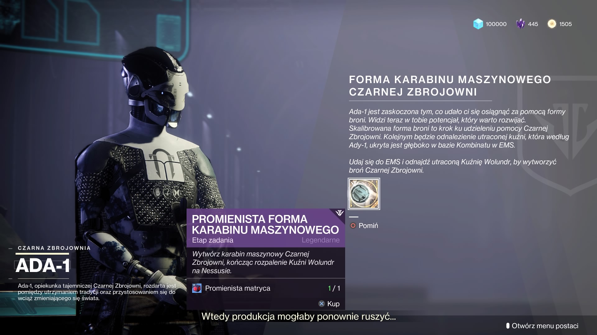 Dodatek Czarna Zbrojownia rozbudowuje nam trochę huba – Wieżę. W jej prawej części – Aneksie zostanie odblokowane nowe pomieszczenie – Czarna Zbrojownia, którą zarządzać będzie nowy NPC – Ada-1. Aby uzyskać dostęp do tego pomieszczenia musimy udać się do Pająka na Splątanym Brzegu. Otrzymamy od niego specjalny klucz, którym otworzymy drzwi do Czarnej Zbrojowni. W środku będzie czekać wspomniana Ada-1, która poprosi nas o odzyskanie i rozpalenie pierwszej kuźni Wolundr na EMS. Tym samym rozpoczynamy sezon kuźni w Destiny 2.