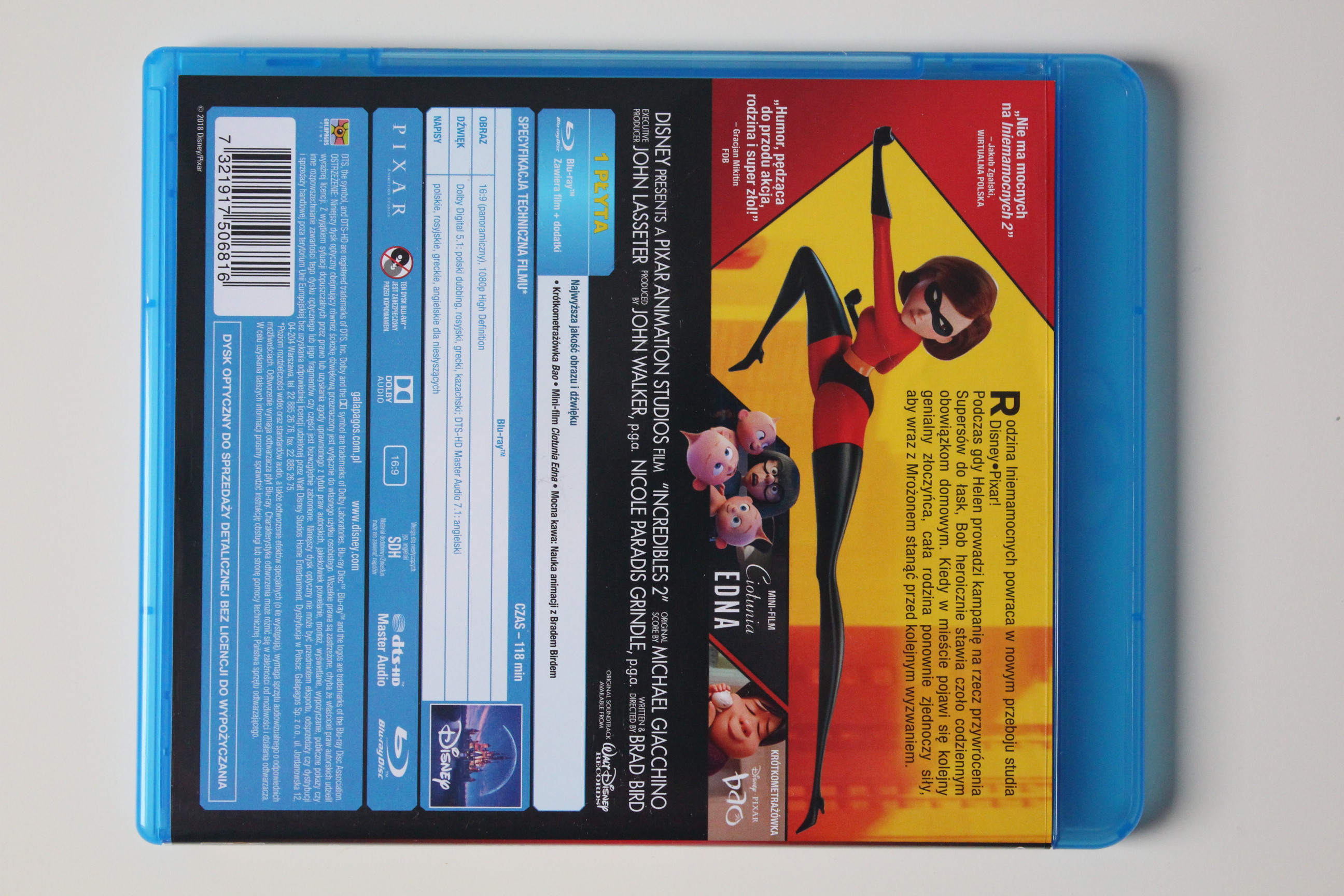 Okładki wydań Galapagosa ostatnio idą w bardzo dobrym kierunku – jak możecie zauważyć, na froncie nie ma zbędnych cytatów czy informacji – tylko tytuł filmu, loga studia Disney Pixar i tyle. Bok jawi się standardowo z prostokącikiem z postacią, tym razem z Elastyną. Z tyłu również ta bohaterka stanowi główny element szaty graficznej, która wyłamuje się z schematu standardowych kolaży. Oczywiście – jak zawsze zresztą znajdziemy tutaj opis filmu i specyfikację wydania.