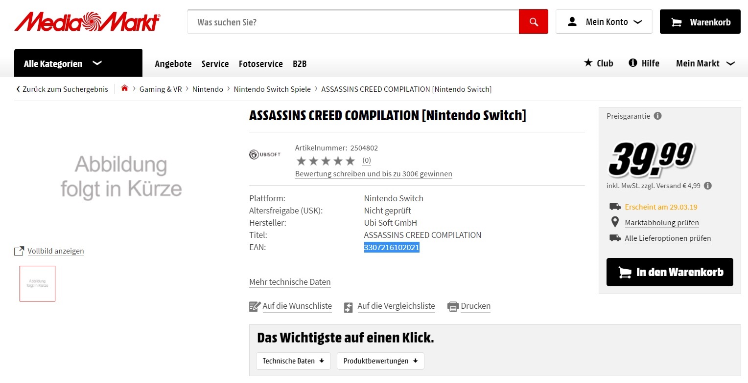 W bazie niemieckiego sklepu Media Markt znalazły się wpisy dla gry Assassin’s Creed Compilation dla konsol PlayStation 4, Xbox One oraz Nintendo Switch. Produkcja na wszystkich platformach została wyceniona na niecałe 40 euro.