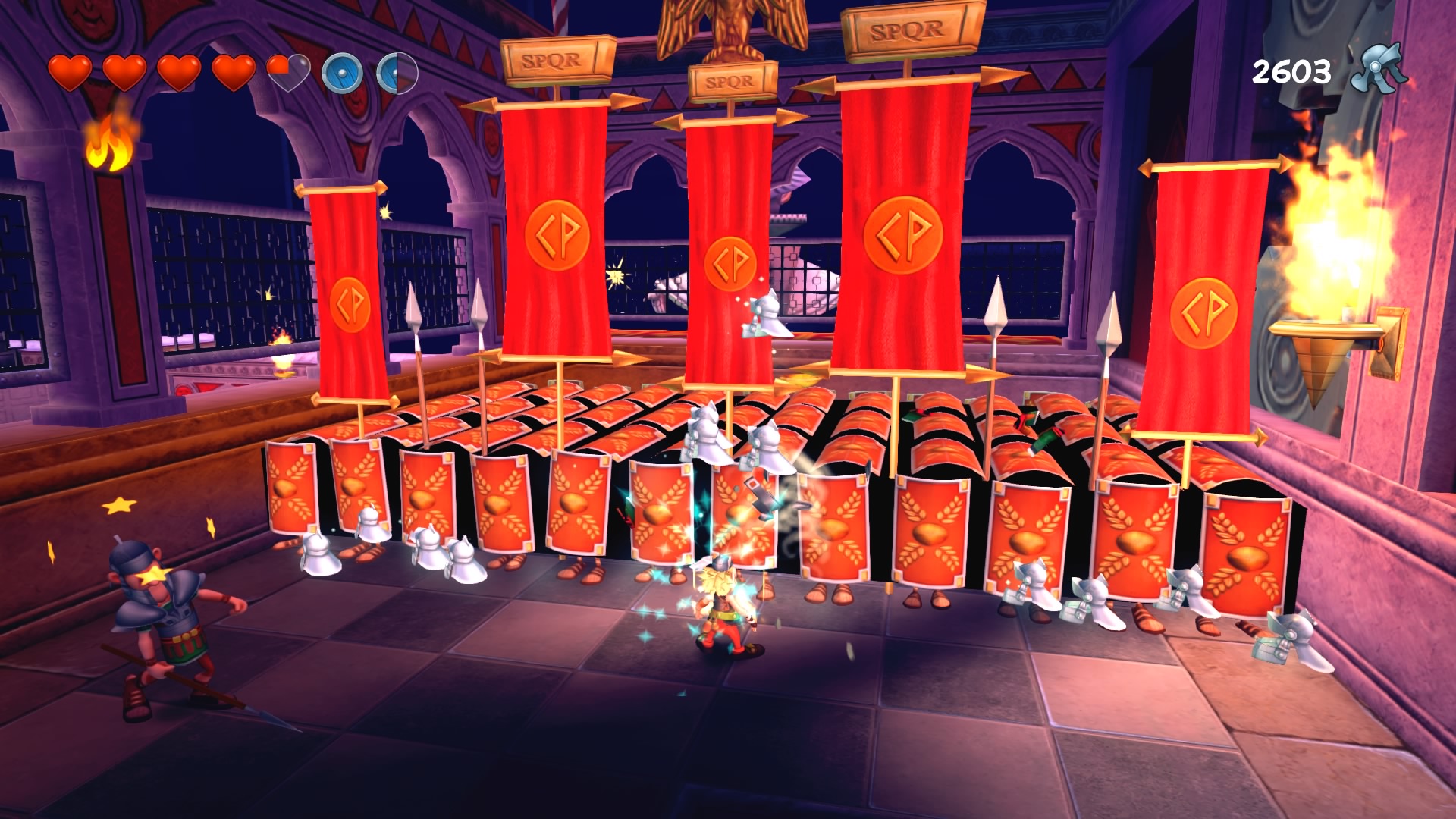Te zdobywa się na kilka sposobów. Pierwszym jest rozbijanie porozrzucanych tu i ówdzie skrzynek. Zniszczenie ich zawsze dodaje na nasze konto kilka hełmów. Możemy również zbierać zawieszone w próżni srebrne (standardowe) i złote (o wiele bardziej wartościowe) nakrycia głowy. Jednak najwięcej dadzą nam po prostu walki z Rzymianami. Podczas rozgrywki możemy swobodnie przełączać się między Asteriksem, a Obeliksem po naciśnięciu przycisku R1 na padzie. Mało tego, takie zmiany aktywnego bohatera możemy łączyć w kombinacje – przykładowo Obelix ogłusza Rzymianina, bierze go i zaczyna nim kręcić, po czym wyrzuca go, a Asterix wyskakuje i kopie go, nokautując przeciwnika. Wygląda to naprawdę ciekawie. A oponentów warto ogłuszać i chwytać, bowiem służą nam wtedy za oręż. Obaj Galowie kręcą przeciwnikami dookoła, raniąc okolicznych Rzymian. Po naciśnięciu przycisku X smagamy ogłuszonym oponentem jak batem. Możemy też cisnąć nim jak kulą do kręgli, czy skoczyć z nim w powietrze i uderzyć nim z ogromną siłą o ziemię, czy przeciwników pod nami. Rzymianie występują też w znanej między innymi z komiksów i filmów animowanych formacji żółwia. Musimy co jakiś czas unikać ataków żołnierzy, by później rozbijać rzędy żółwia i tak aż do dotarcia do ostatniego rzędu. Asterix może sobie dodatkowo ułatwić walkę dzięki napojowi magicznemu. Obelix nie ma takiej możliwości – przecież wpadł do kociołka z magicznym wywarem jako dziecko.