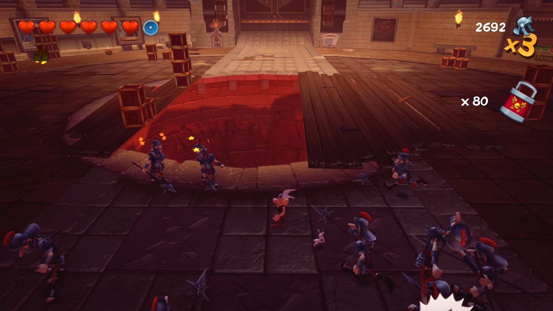 Pozostając jeszcze w temacie aspektów wizualnych, nie mogę nie zauważyć szeregu animacji, które pozytywnie wpływają na odbiór całości. Nasi bohaterowie poruszają się bardzo skocznie, wręcz groteskowo. Nie rujnuje to jednak wrażeń estetycznych płynących z grania w Asterix i Obelix XXL 2: Remastered, przeciwnie, działa na ich korzyść. W produkcji występuje całe mnóstwo delikatnych uśmiechów kierowanych w stronę gracza. Obelix przytrzymuje swój hełm podczas skoku, Asterix nieco się rozpłaszcza, wykonując podwójny skok, Idefix wzbija tumany kurzu podczas biegu i szukania ciekawych przejść, a atakowani przez nas Rzymianie zostawiają na chwilę sandały, po czym dopiero są wyrzucani z nimi wyżej. Wygląda to wszystko bardzo dobrze i stanowi jedną spójną całość.