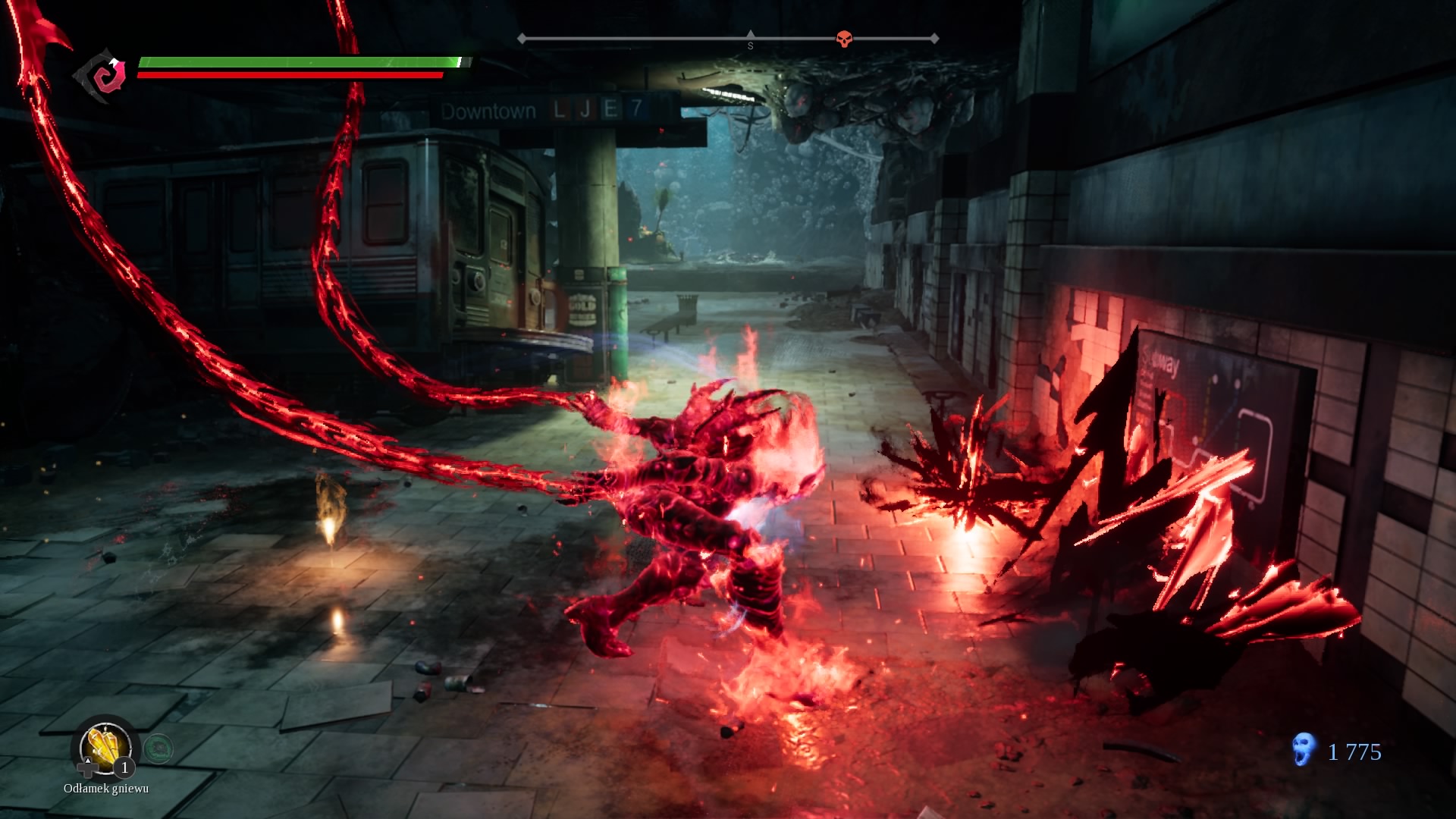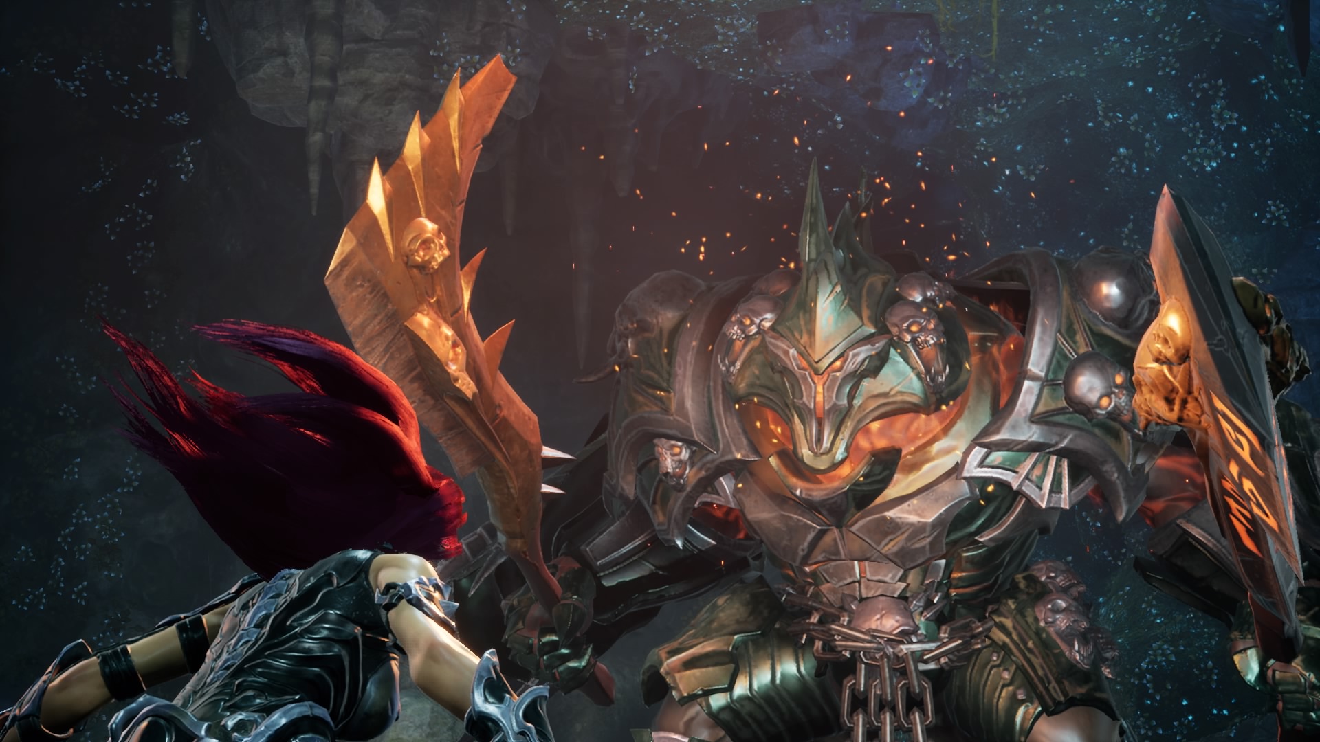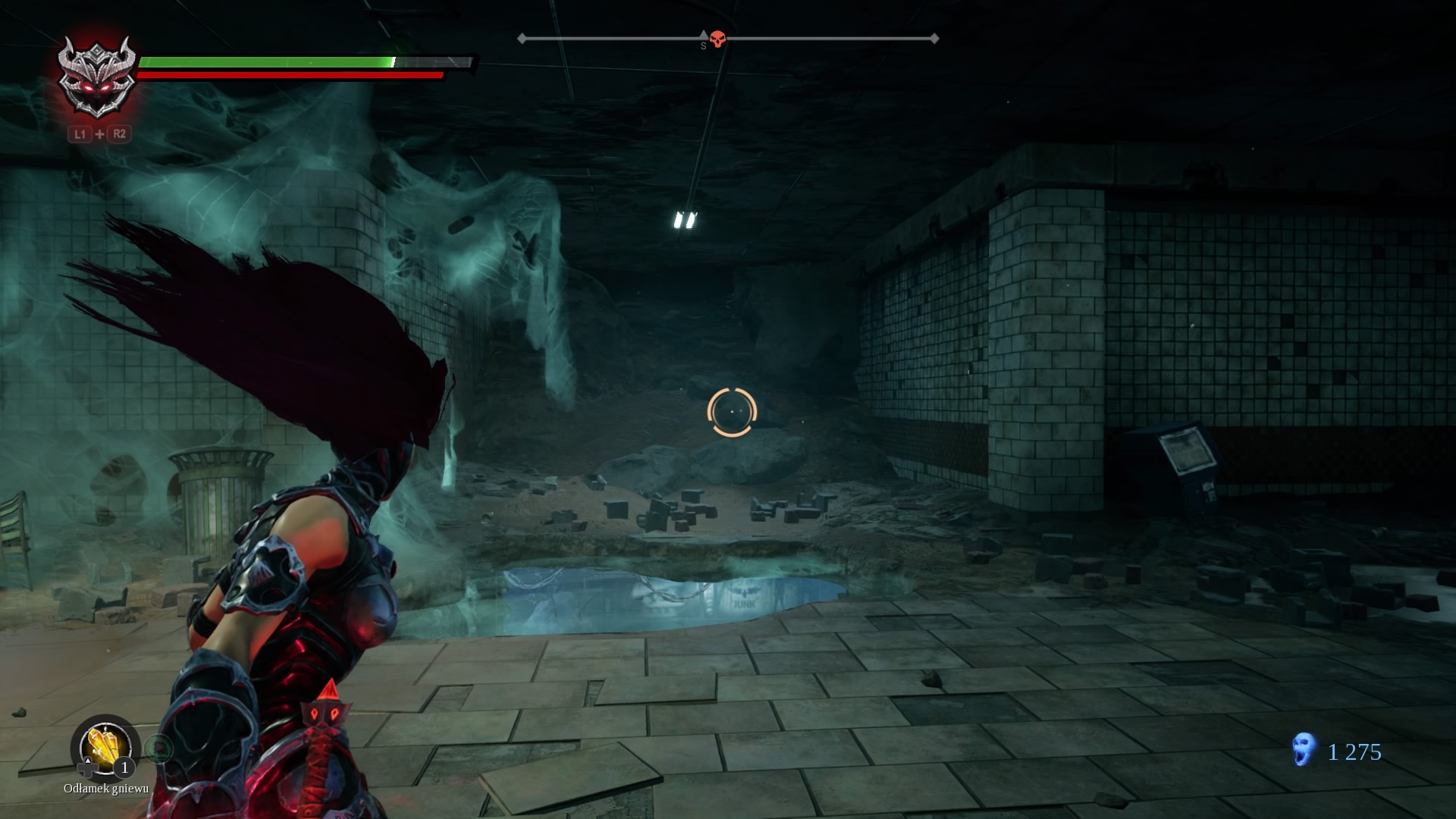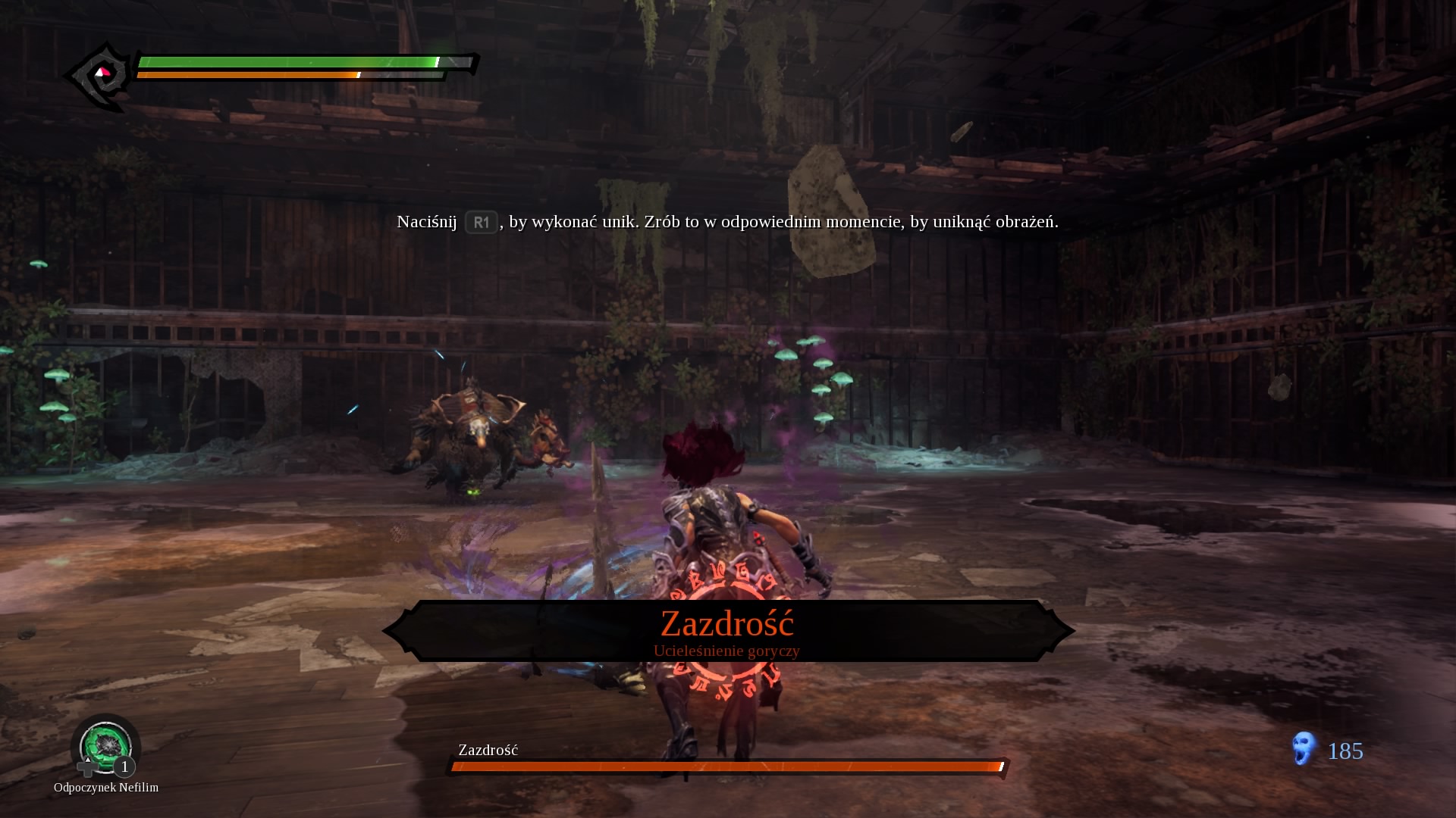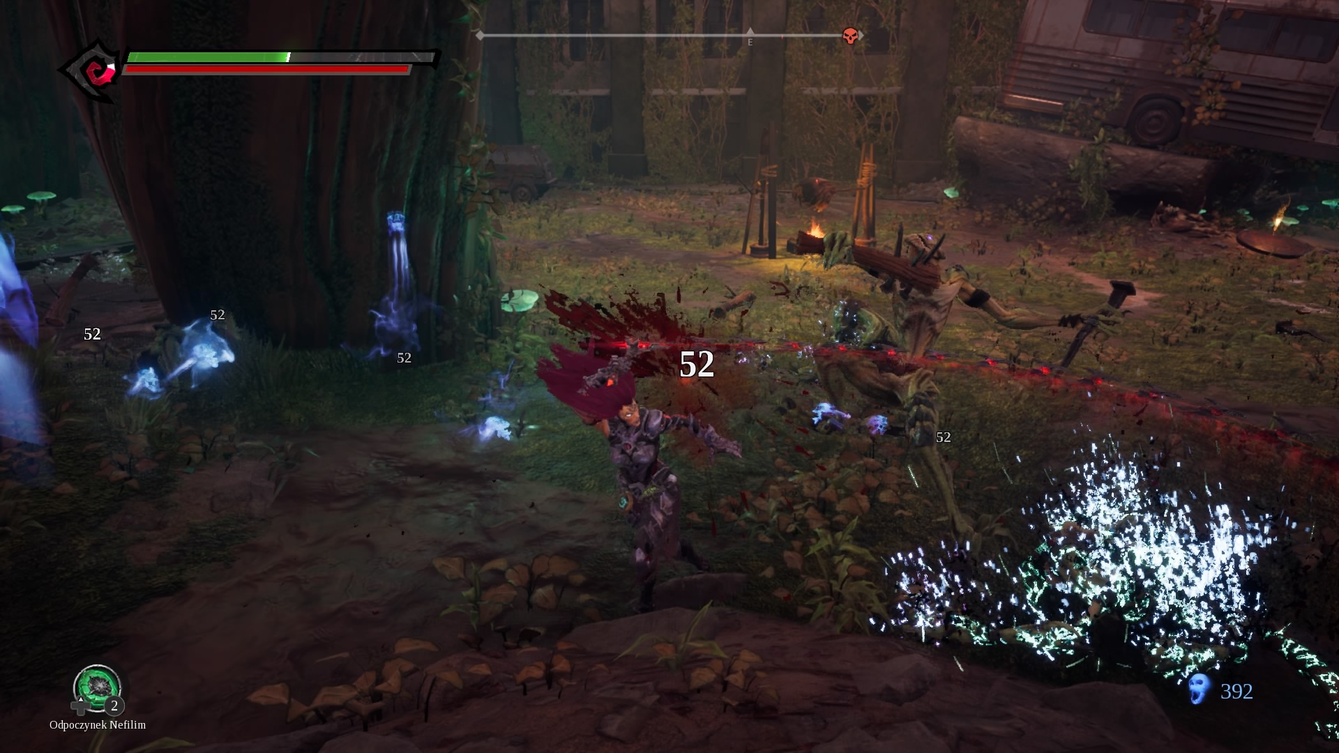 Możemy także regenerować swoje zdrowie, niszcząc odłamki lecznicze i Nefilim. Odłamków w ogóle jest sporo – mamy odłamki cierni, siły, agonii, fragmenty adamantynu, zbiory mar i więcej. Mogłoby się więc wydawać, że Darksiders III to RPG pełną piersią. Niestety, rozwój postaci jest bardzo prosty. Po zebraniu odpowiedniej liczby kęp mar (które tracimy zaraz po śmierci – widać wyraźne inspiracje serią Dark Souls (nawet wygląd znajdziek jest zbliżony do elementów ze wspomnianego cyklu)) możemy udać się do Vulgrima i wydać je na punkty rozwoju.