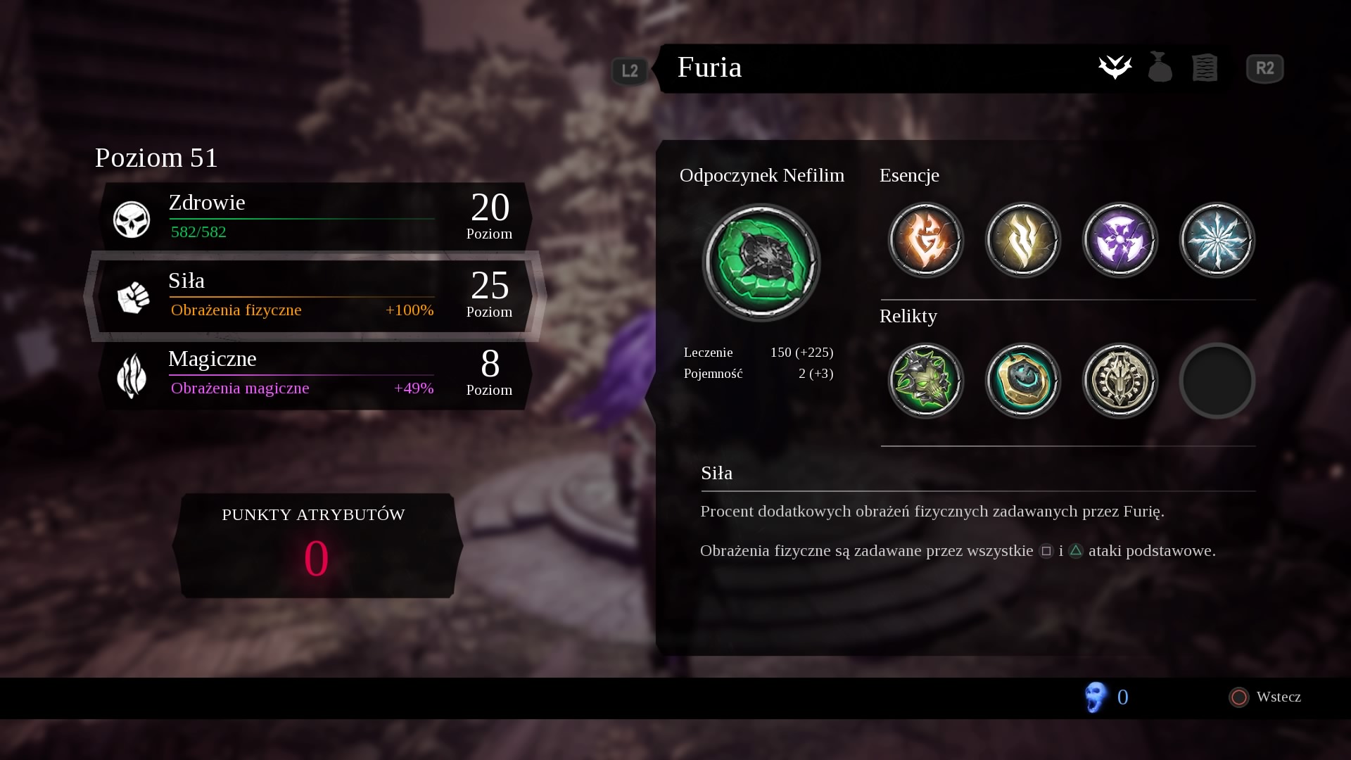 Wróćmy jeszcze do zdecydowanie mojej ulubionej postaci w całej serii Darksiders – Vulgrima. Ten demon żywi się duszami, a za określoną w jego sklepie cenę chętnie sprzeda nam przedmiot jednorazowy, czy składniki rzemieślnicze. Te z kolei (oczywiście możemy je także znaleźć w świecie gry) przydają się do rozwijania uzbrojenia Furii i umiejętności oraz awansowania na kolejne poziomy. W Darksiders III występuje rozwój postaci, aczkolwiek jest to dość marginalny proces. Możemy ulepszać tylko i wyłącznie 3 umiejętności – zdrowie, ataki fizyczne i ataki magiczne. Te ostatnie odpowiadają za obrażenia zadawane przeciwnikom w Spustoszenia Furii i Gniewnym Ataku, wyzwalanym po jednoczesnym naciśnięciu L1 i R1. Siła to parametr, który jest chyba najbardziej znaczącym w recenzowanej grze. Odpowiada on za wartość obrażeń, jakie zadajemy przeciwnikom. Ja zdecydowanie najbardziej ochoczo inwestowałem w siłę i zdrowie (ta cecha jest chyba najłatwiejsza do zrozumienia – im wyższy parametr, tym lepiej).