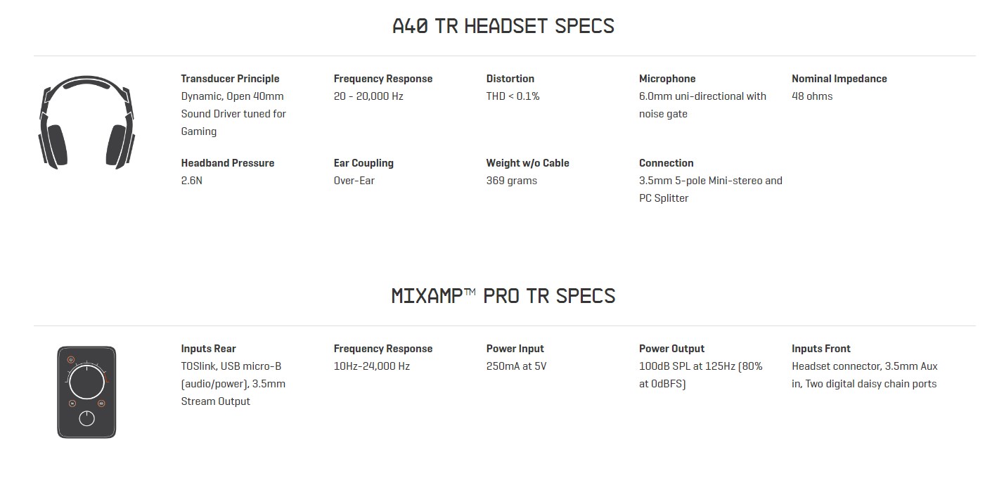 Astro A40 zapakowane są w duże czarne pudełko, które otwiera się jak książka. Od razu rzucają nm się w oczy słuchawki oraz wzmacniacz. W schowku po prawej stronie zostały ładnie ukryte wszystkie potrzebne papiery, odpinany mikrofon oraz kable, a ich mało nie jest. W zestawie mamy kabel optyczny, kabel USB oraz kabel cyfrowego połączenia szeregowego. Ten ostatni kabel służy do spięcia kilku wzmacniaczy MixAmp PRO TR, aby zbudować zamknięty LANowy czat, do którego nikt z zewnątrz nie będzie miał dostępu. Jest to bardzo przydatna opcja w przypadku zawodów e-sportowych.