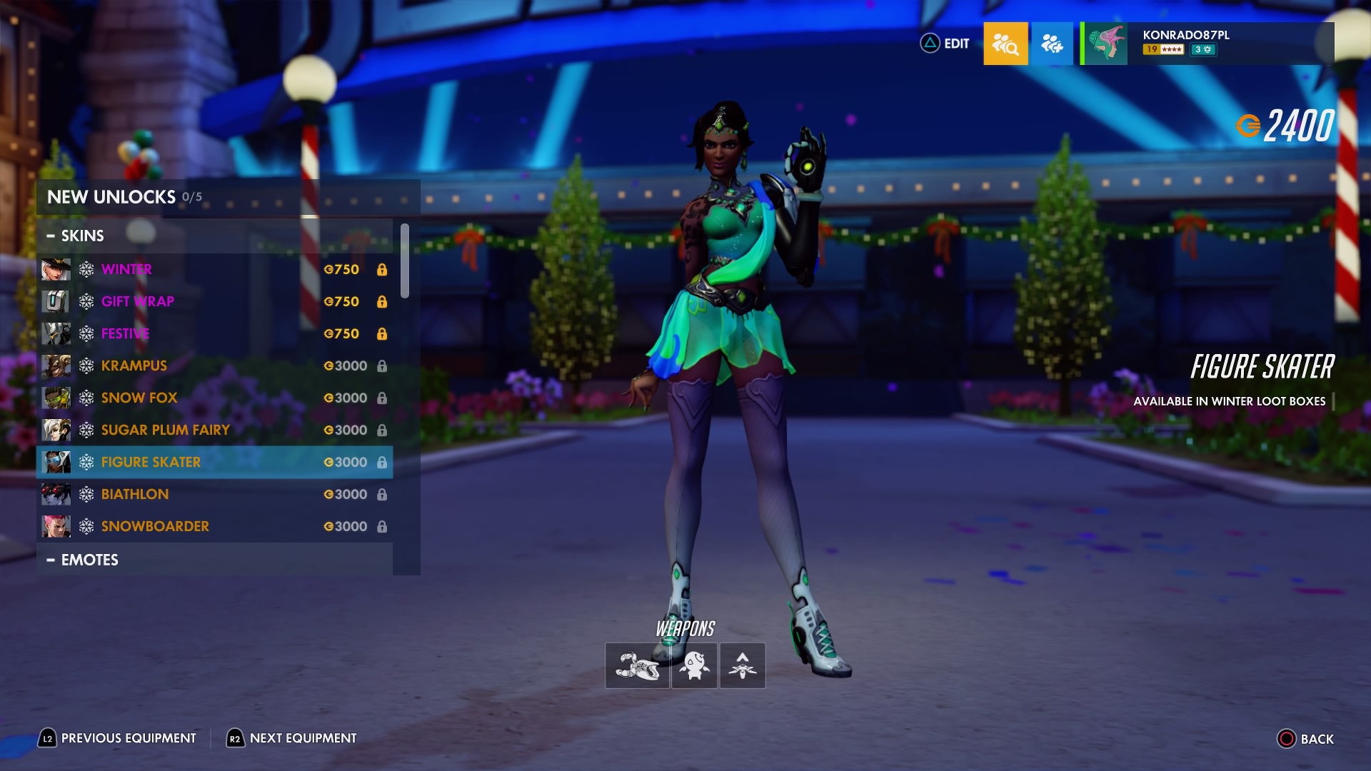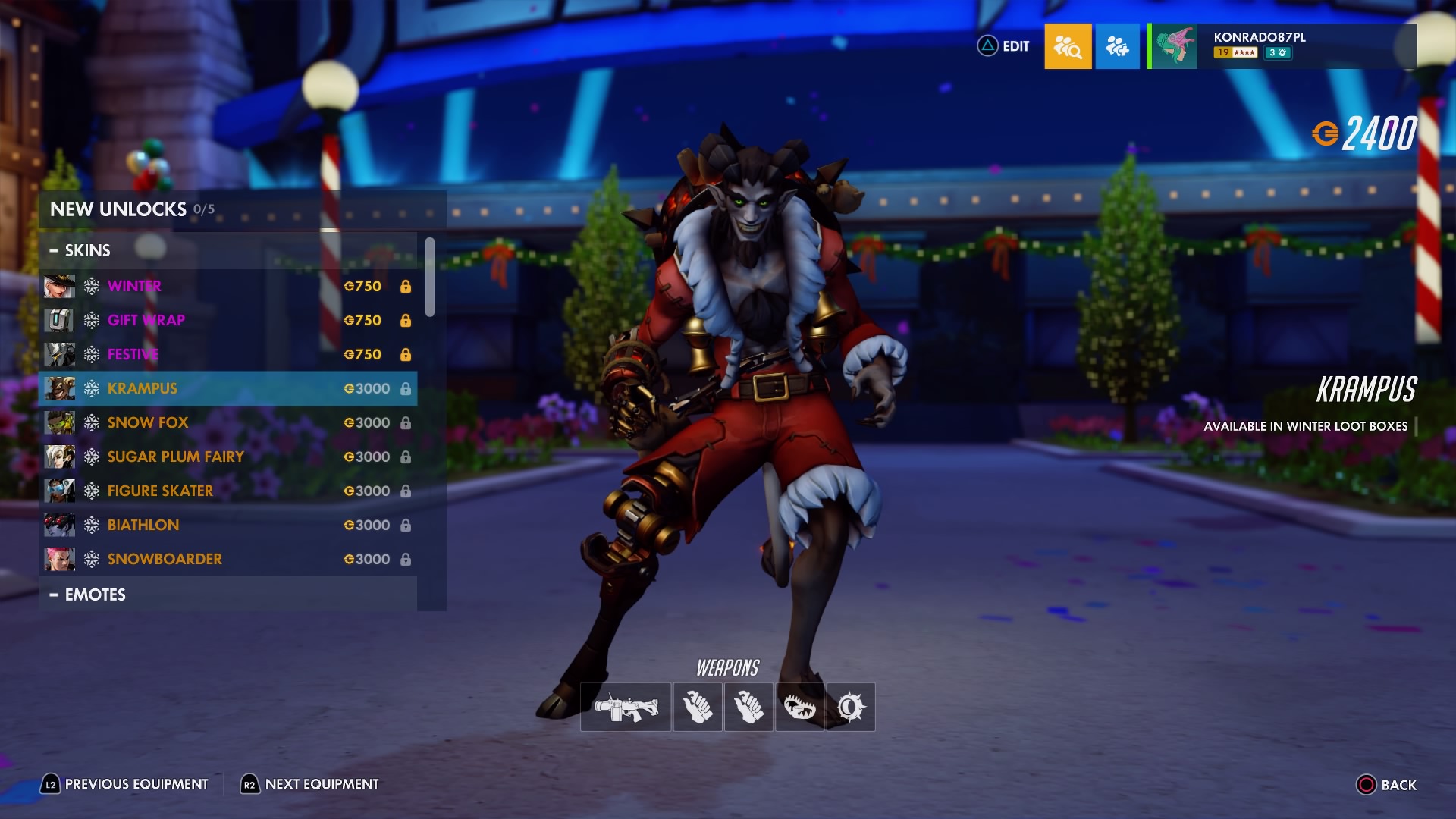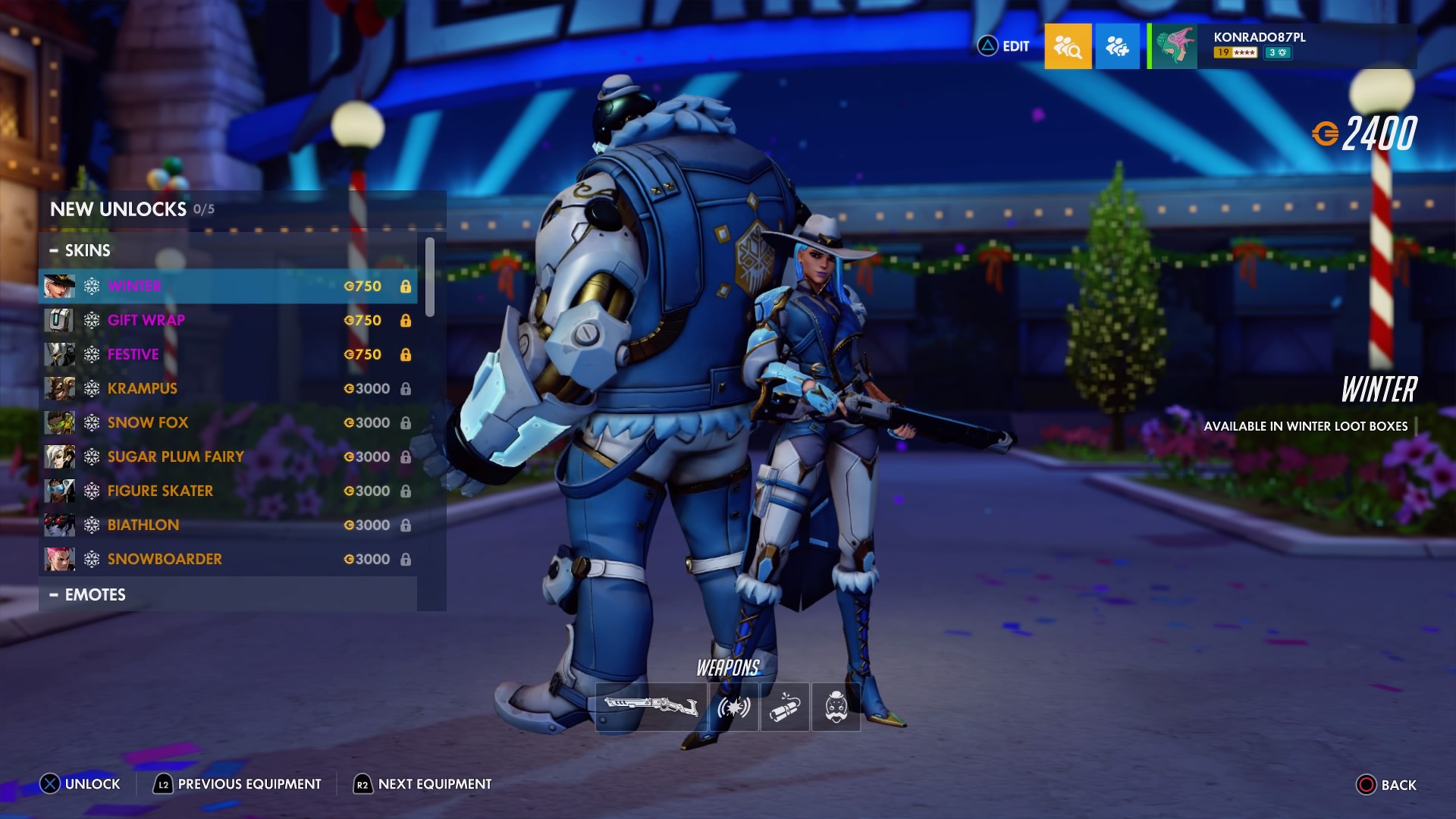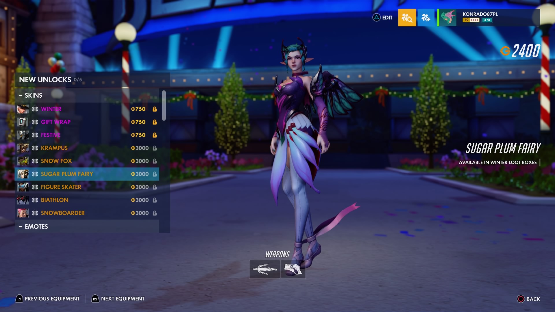 W trakcie zimowej Krainy Czarów można odblokować nowe przedmioty sezonowe – w tym legendarne skórki, takie jak Krampus dla Złomiarza, Łyżwiarka figurowa dla Symmetry, Lis polarny dla Lúcia, Snowboardzistka dla Zarii, Cukrowa Wróżka dla Łaski i Biatlonistka dla Trupiej Wdowy.