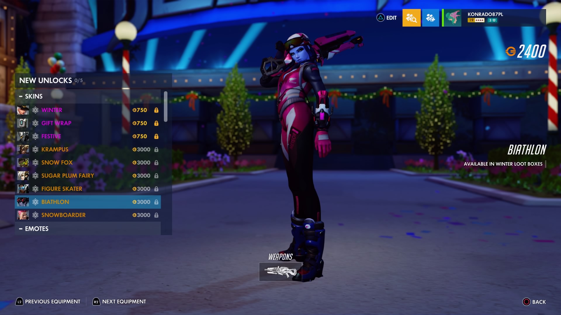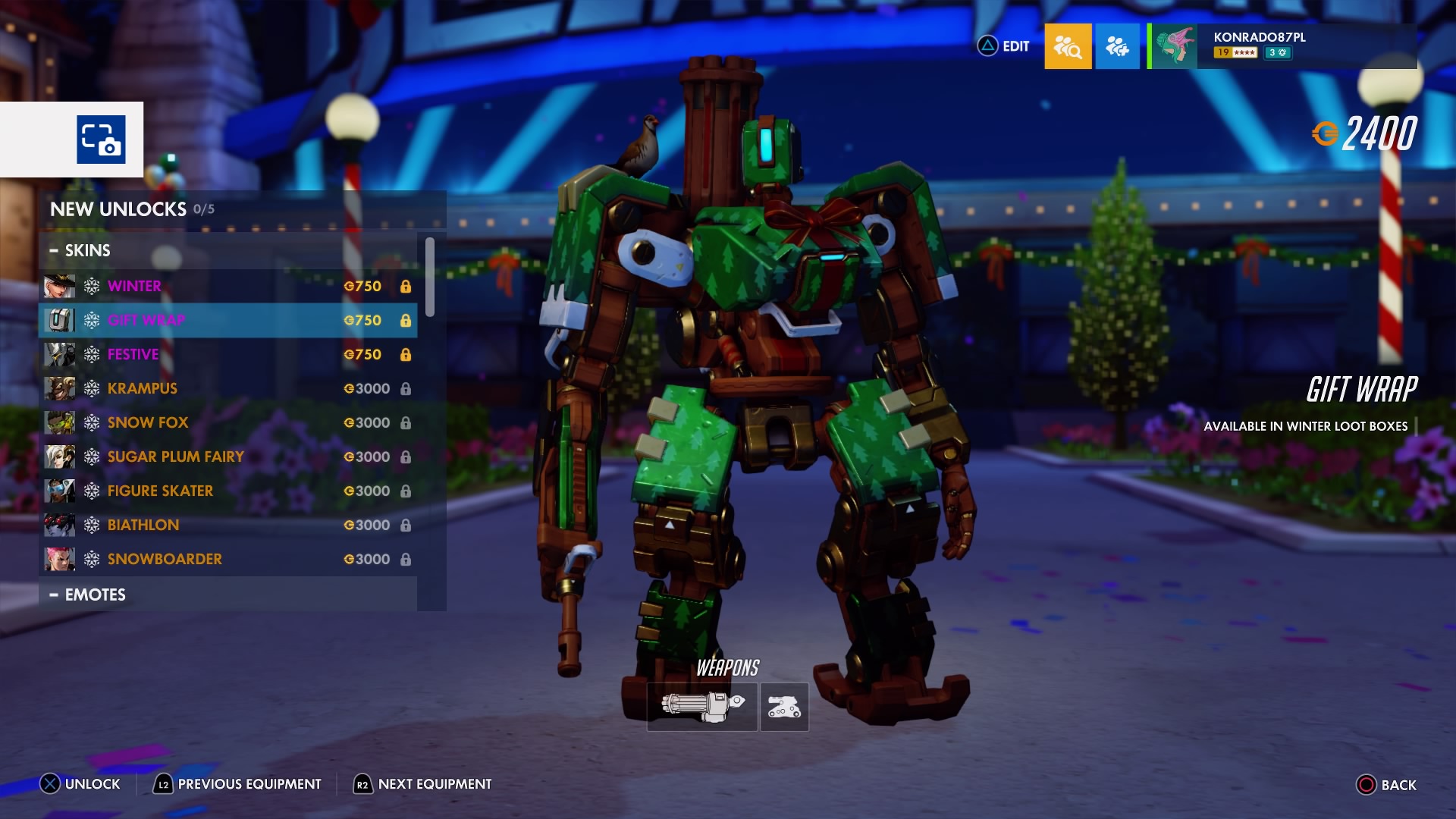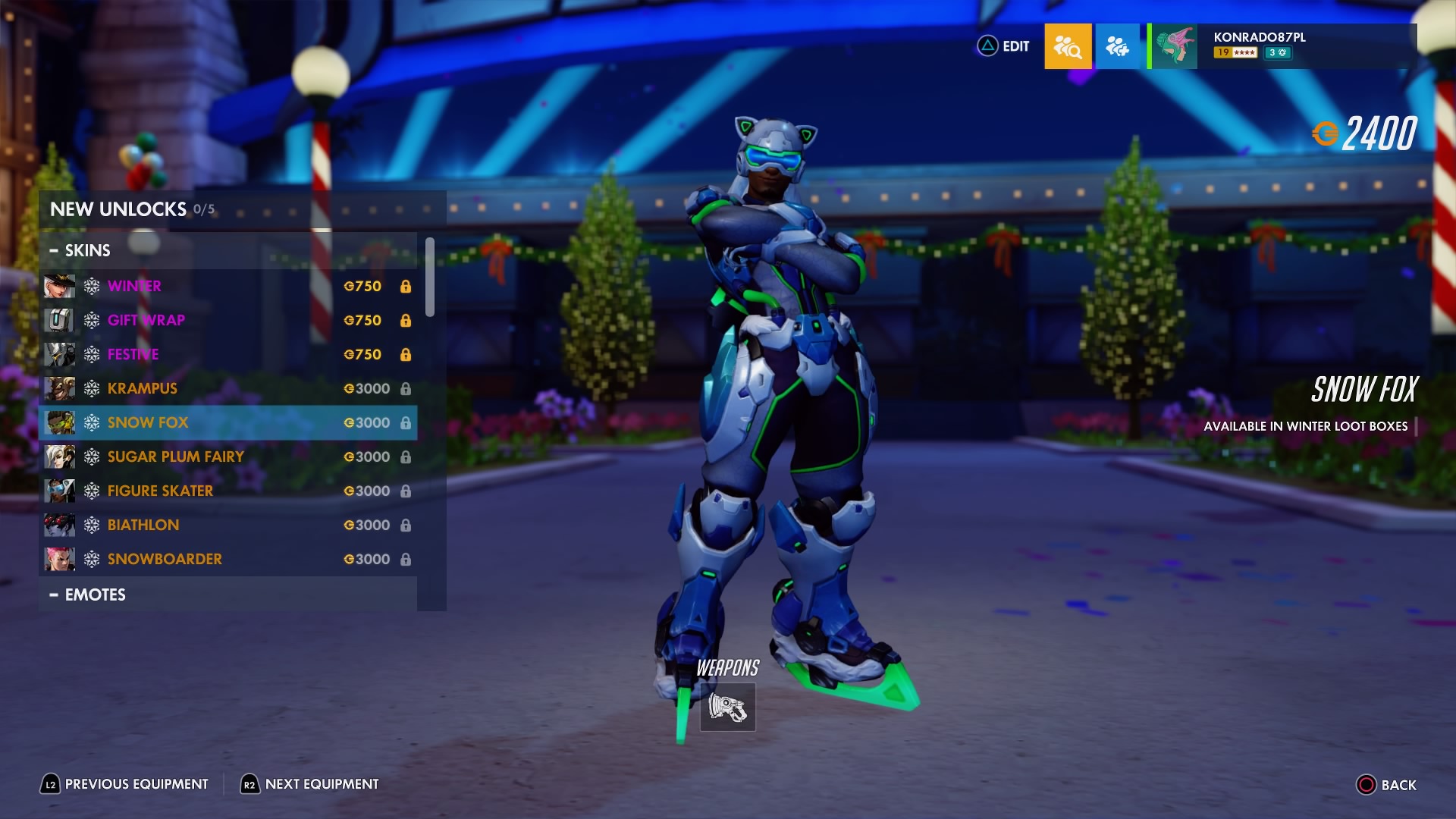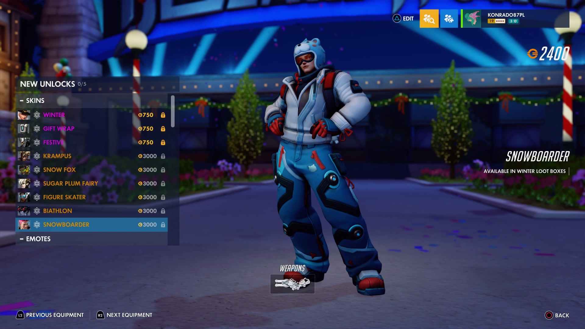 W trakcie zimowej Krainy Czarów można odblokować nowe przedmioty sezonowe – w tym legendarne skórki, takie jak Krampus dla Złomiarza, Łyżwiarka figurowa dla Symmetry, Lis polarny dla Lúcia, Snowboardzistka dla Zarii, Cukrowa Wróżka dla Łaski i Biatlonistka dla Trupiej Wdowy.