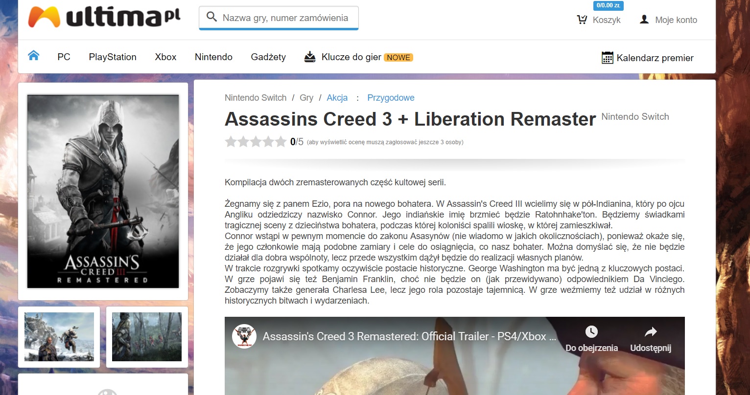 Plotki o możliwym wydaniu odświeżonej kolekcji gier z serii Assassins Creed na Nintendo Switch są obecne w sieci od jakiegoś czasu. Od dwóch miesięcy co jakiś czas kompilacja trafia do oferty kolejnych sklepów. Jako pierwszy do swojej oferty dołączył zestaw niemiecki MediaMarkt, a niedługo później pakiet Assassin’s Creed 3 + Assassin’s Creed: Liberation HD pojawił się w francuskim sklepie wtt.biz.