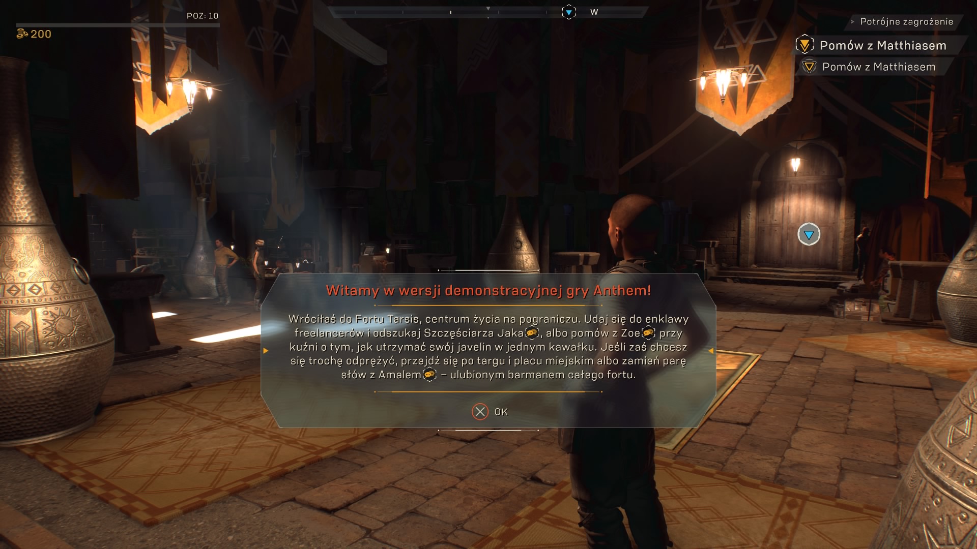 Tuż po zalogowaniu i wybrania płci postaci trafiamy do Fortu Tarsis. Zaczynamy na 10 poziomie i podczas weekendu mogliśmy wbić dodatkowe pięć poziomów. Po Forcie przechadzamy się korzystając z widoku pierwszej osoby, mimo, że gra jest w trzeciej osobie. To całkowite przeciwieństwo dla Destiny 2, którego porównania od pierwszego ogłoszenia Anthem nie mają końca. W Destiny 2 po hubie, czyli Wieży lub Farmie poruszamy się w trzeciej osobie, a sama rozgrywka jest z pierwszej osoby. I tutaj dochodzimy do pierwszego problemu z VIP Demem Anthem, otóż poruszanie się Forcie Tarsis nie jest płynne, gołym okiem widać, że gra smuży i nie trzyma nawet 30 FPSów. W Forcie możemy porozmawiać z kilkoma NPCami, jak barman Alaman, czy Zoe, która zajmuje się naszymi javelinami, czyli pancerzami w których wyruszamy na misje. Niestety wybrane kwestie dialogowe nie mają żadnego znaczenia dla postępów fabularnych.