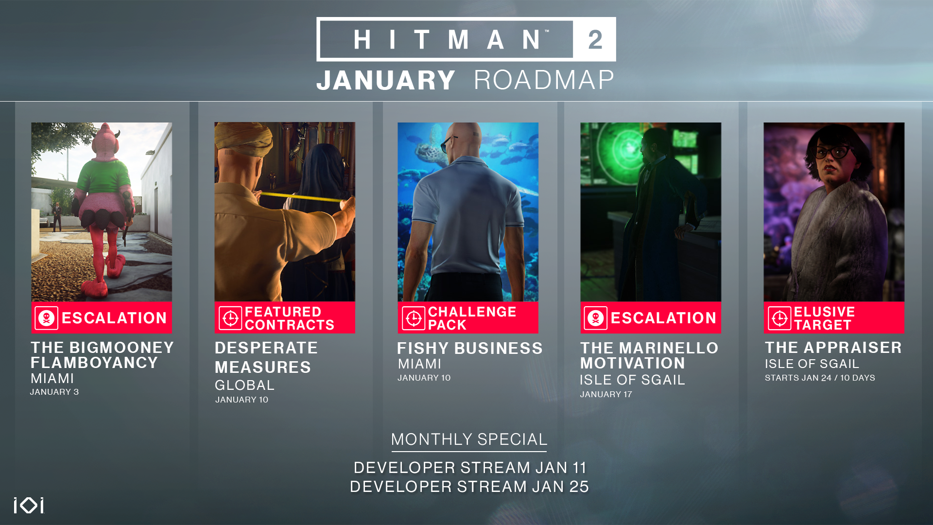 - 11 stycznia – transmisja na żywo z producentem – pierwsza transmisja z tego roku skupi się między innymi na kontraktach i trybie eskalacji. Już dziś można śledzić IO Interactive na Twitterze i serwisie Mixer. Wkrótce poznamy więcej szczegółów.