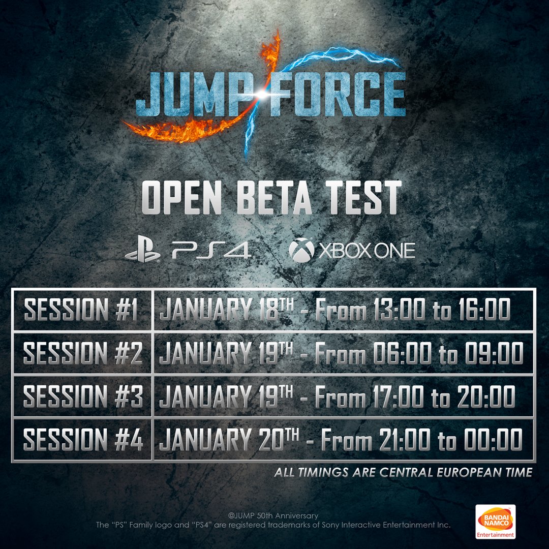 Bandai Namco zapowiedziało, że Jump Force otrzyma w styczniu otwartą betę dla wszystkich. Do dyspozycji graczy zostanie oddanych 17 bohaterów oraz 5 unikalnych aren. Cała beta będzie podzielona na cztery sesje, które będą trwały od 18 do 20 stycznia.