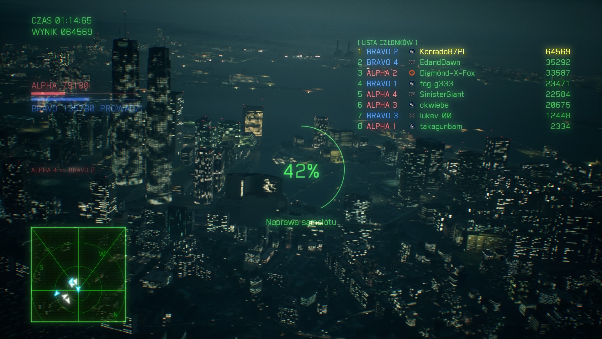 Kilka misji polega po prostu na zniszczeniu wszystkiego, co się rusza i do nas strzela, aby taka misja zakończyła się powodzeniem musimy pobić wymagany limit punktów w wyznaczonym czasie. Tak naprawdę każda misja jest na czas, tego zazwyczaj jest 15-20 minut, ale tylko w misjach na punkty może go nam zabraknąć. Nie brakuje tez misji eskortowania ważnego celu w powietrzu, a nawet osłaniana samochodu VIPa który jedzie przez wielkie miasto nocą – kapitalna i chyba moja ulubiona misja w Ace Combat 7. Są walki z bossami, ale jest ich bardzo mało, największe wrażenie wywarł na mnie pojedynek z Arsenal Bird (jego model jest w edycji kolekcjonerskiej), ogromnym statkiem powietrznym, napędzany wieloma śmigłami. Statkiem, który jest wyposażony w wiele bezzałogowych dronów, ogromny laser oraz ochronę pole magnetyczne o które możemy się nawet rozbić. Czasem przyjdzie nam nawet stoczyć pojedynek z jakimś futurystycznym myśliwcem, który jest zwinny niczym wspomniane wcześniej drony.