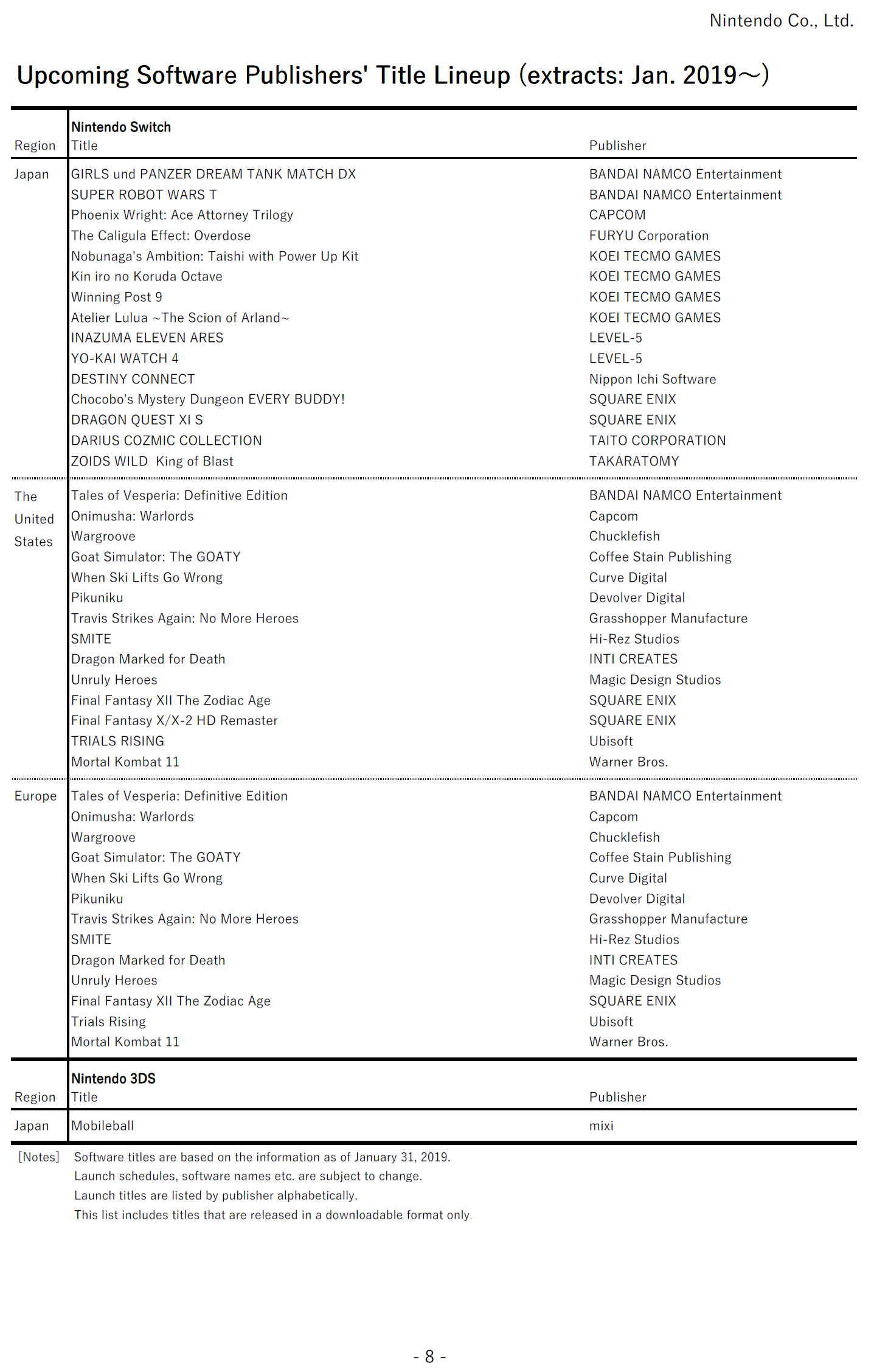 Lista 10 najlepiej sprzedających się gier po raz kolejny się nieco przetasowała. Na szczególną uwagę zasługuje fantastyczny wynik Super Smash Bros. Ultimate. Debiutujący 7 grudnia tytuł osiągnął ponad 12 milionów sprzedanych egzemplarzy w mniej niż miesiąc. Nieźle wypada też Pokemon Let’s Go, Pikachu! i Pokemon Let’s Go, Eevee!, które łącznie trafiły do 10 milionów graczy.