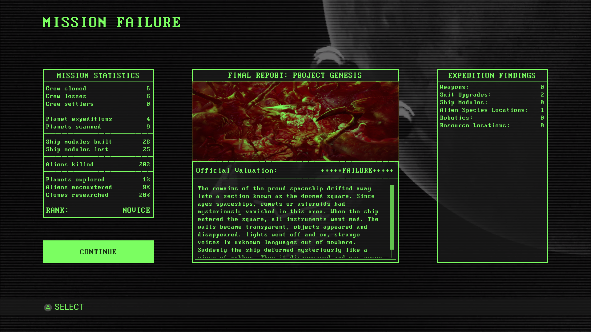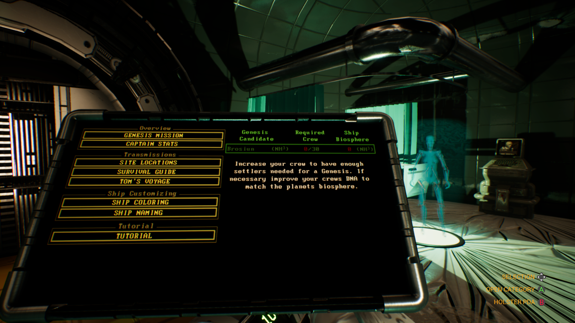 Zostaje główny cel naszej misji – kolonizacja. Po znalezieniu planety na 100% okaże się, że jest ona nieakceptowalna przy aktualnym stanie ludzkości. Atmosfera jest inna niż O2. Tu z pomocą przychodzą rośliny i obce DNA. Walcząc z obcymi co jakiś czas wypadną nam fragmenty DNA. Po znalezieniu 10, a właściwie wygrindowaniu. Poznajemy daną rasę i możemy stworzyć jej klona. Istnieje też możliwość mieszania ludzkiego DNA z obcym. Wspomniane kilkukrotnie rośliny pozwalają na zmianę składu atmosfery statku w celu podtrzymania ulepszonej rasy ludzkiej potrzebnej do kolonizacji.